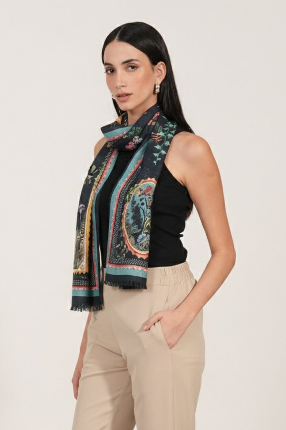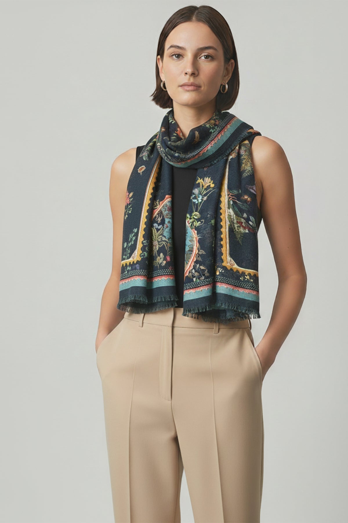 An ode to modern luxury, the Ebon Wool Scarf captures the season’s mood in rich, inky tones and lush florals. Woven in fine wool, it offers warmth without weight, wrapping beautifully around the shoulders. The striking contrast of blooms against a dark base creates a look that’s both dramatic and refined, perfect for elevating everyday layers or accenting evening ensembles.