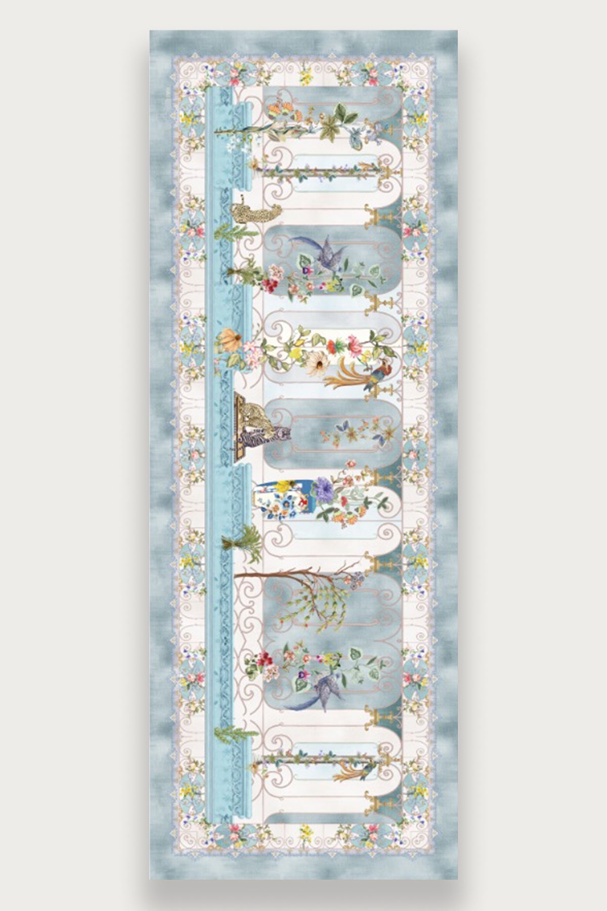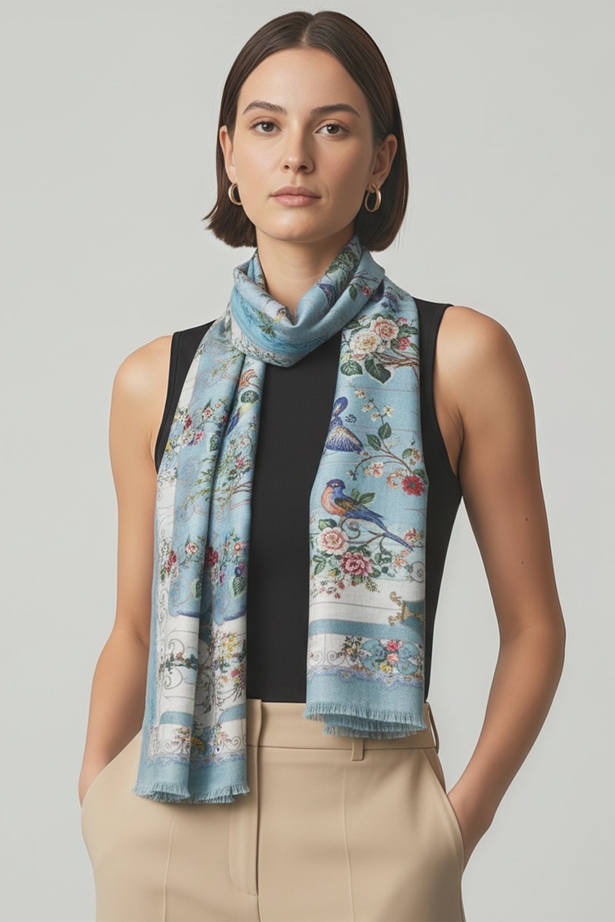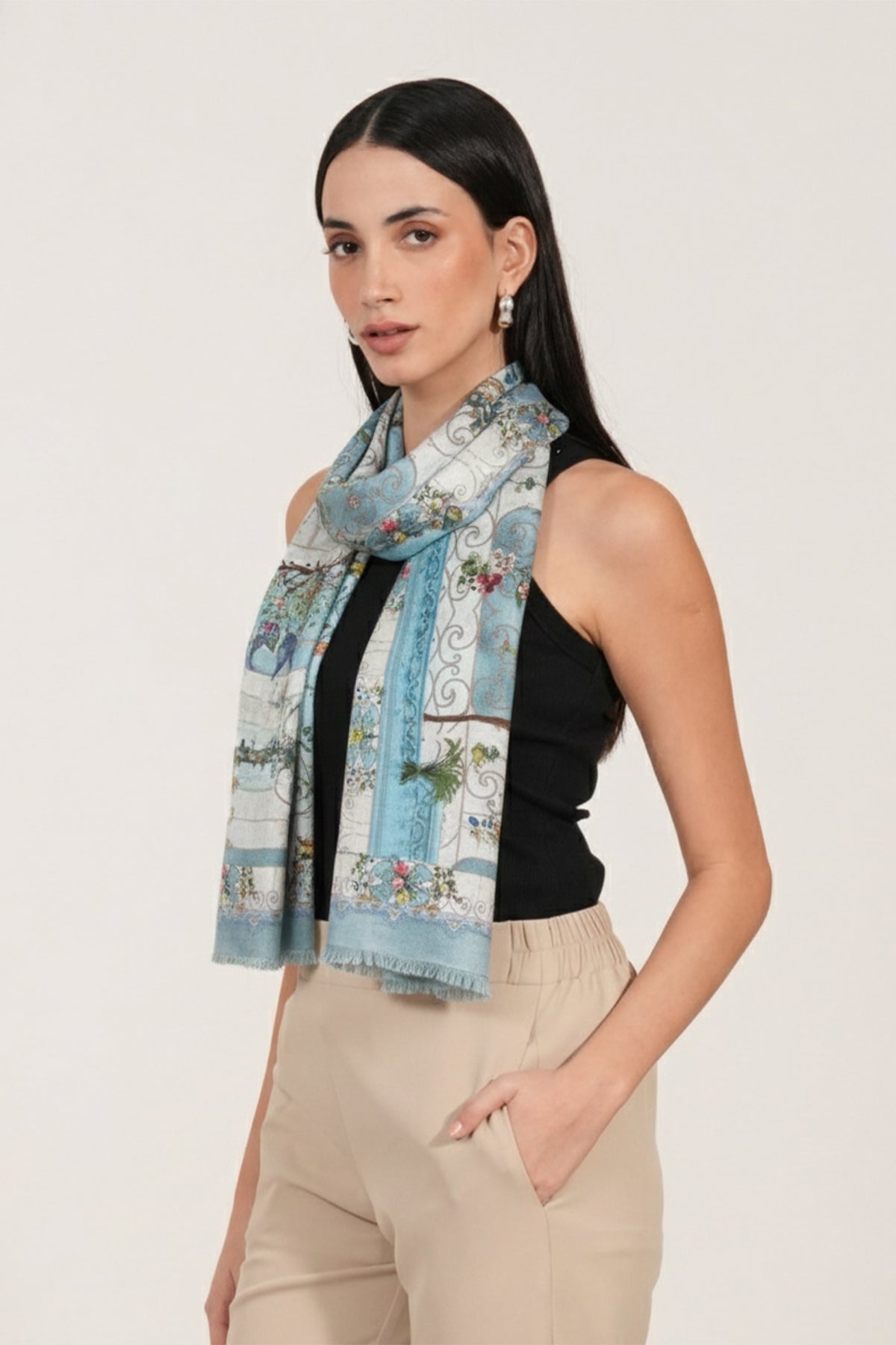 Featuring the Flora Stole in Trellis Print which captures the essence of refined luxury. Crafted from wool, it offers a soft, indulgent drape that feels as beautiful as it looks. Delicate florals intertwine with ornate latticework, creating a composition that’s both graceful and striking. The serene palette of soft blues and gentle pastels makes it a versatile accent.
