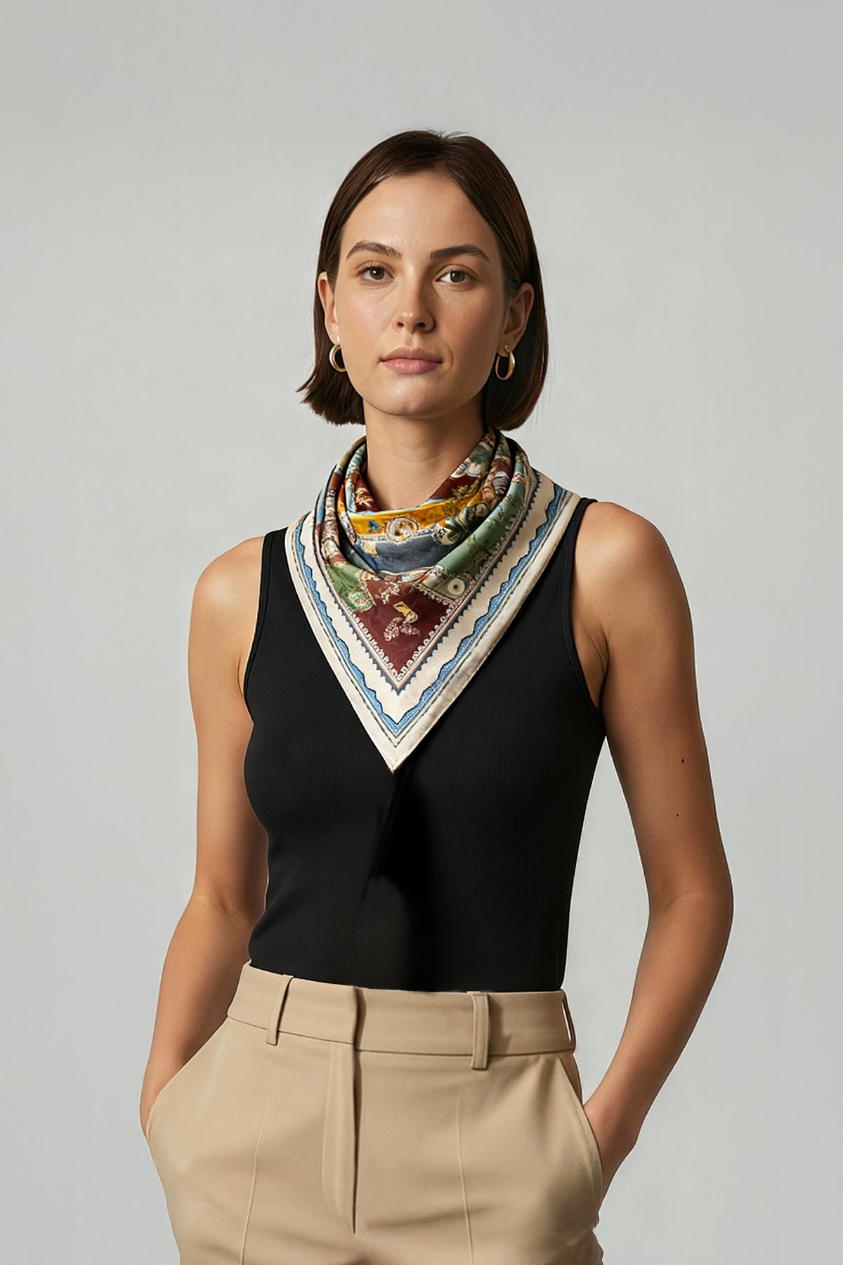 The Santa Fe Scarf captures the spirit of wanderlust through its rich patchwork of earthy tones and global-inspired motifs. Designed in Ranna Gill’s signature Santa Fe print, it is made from silk fabric.