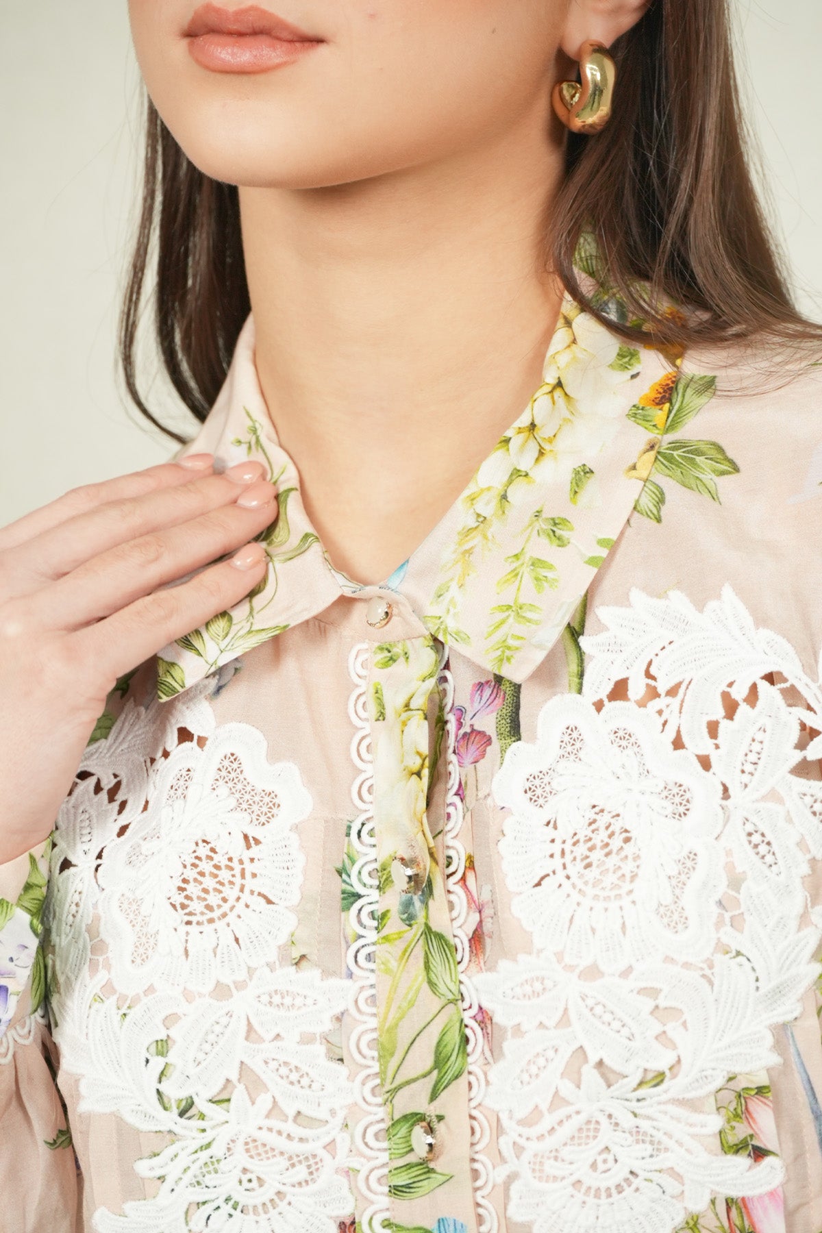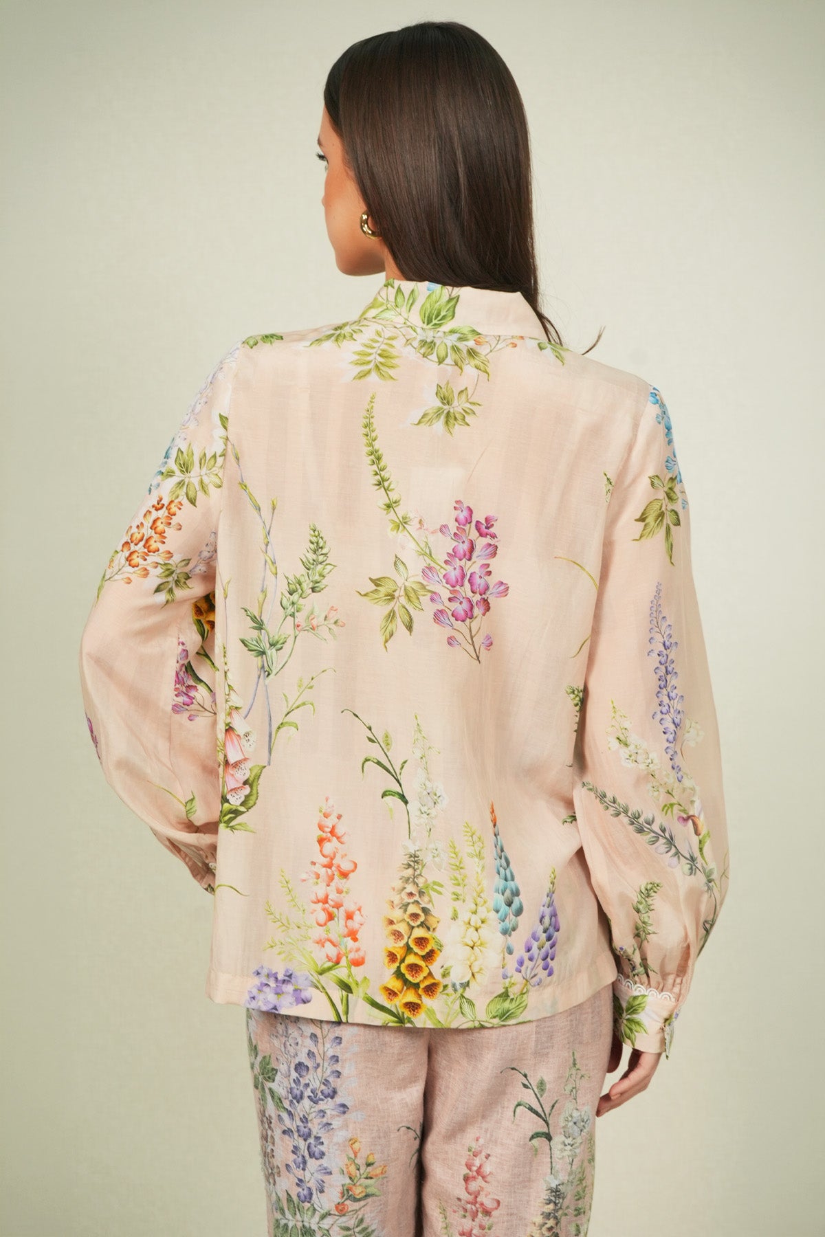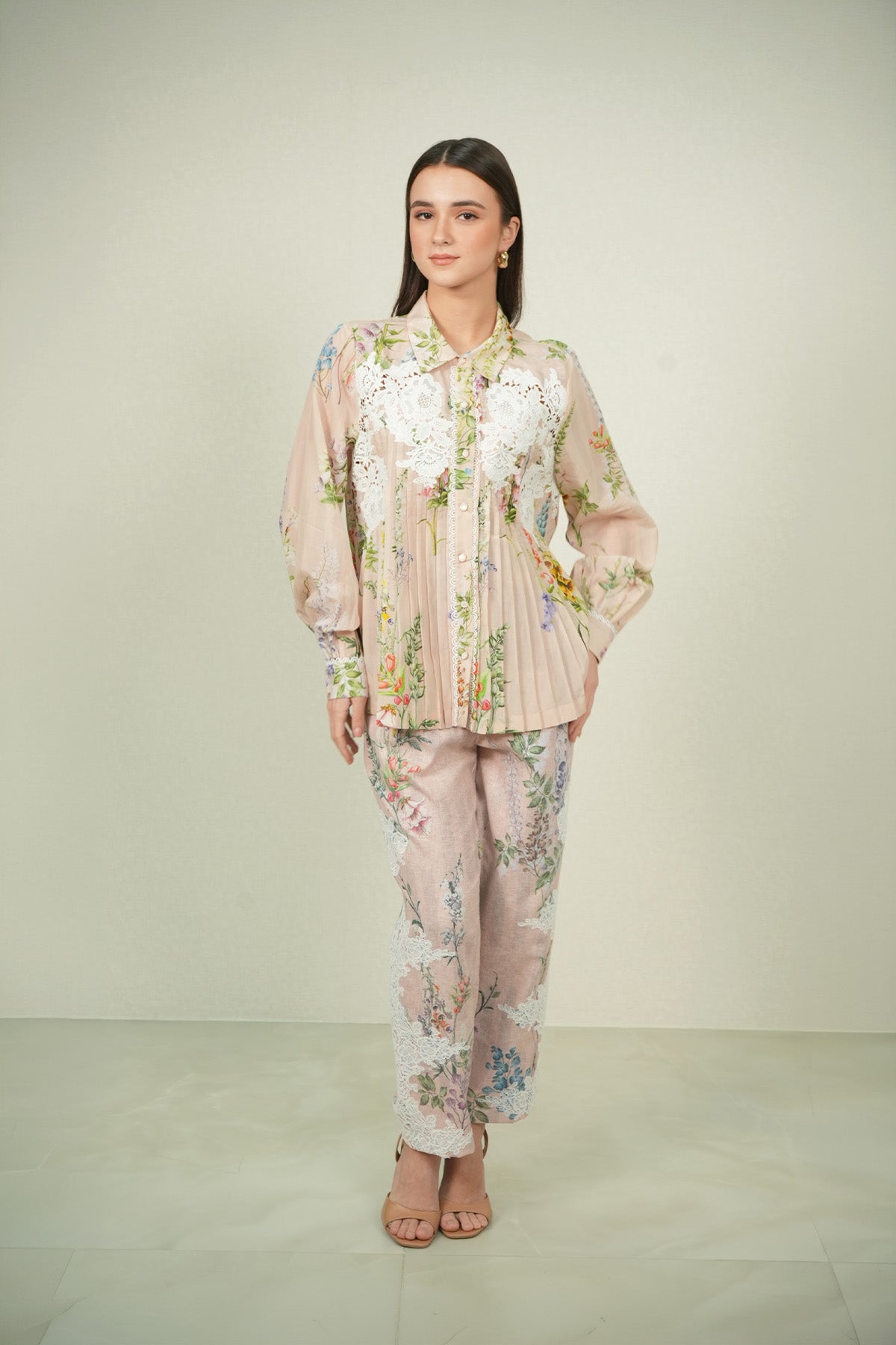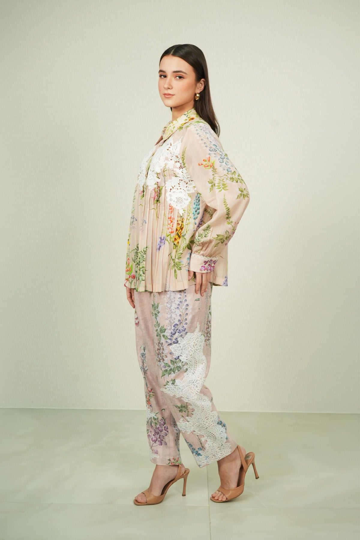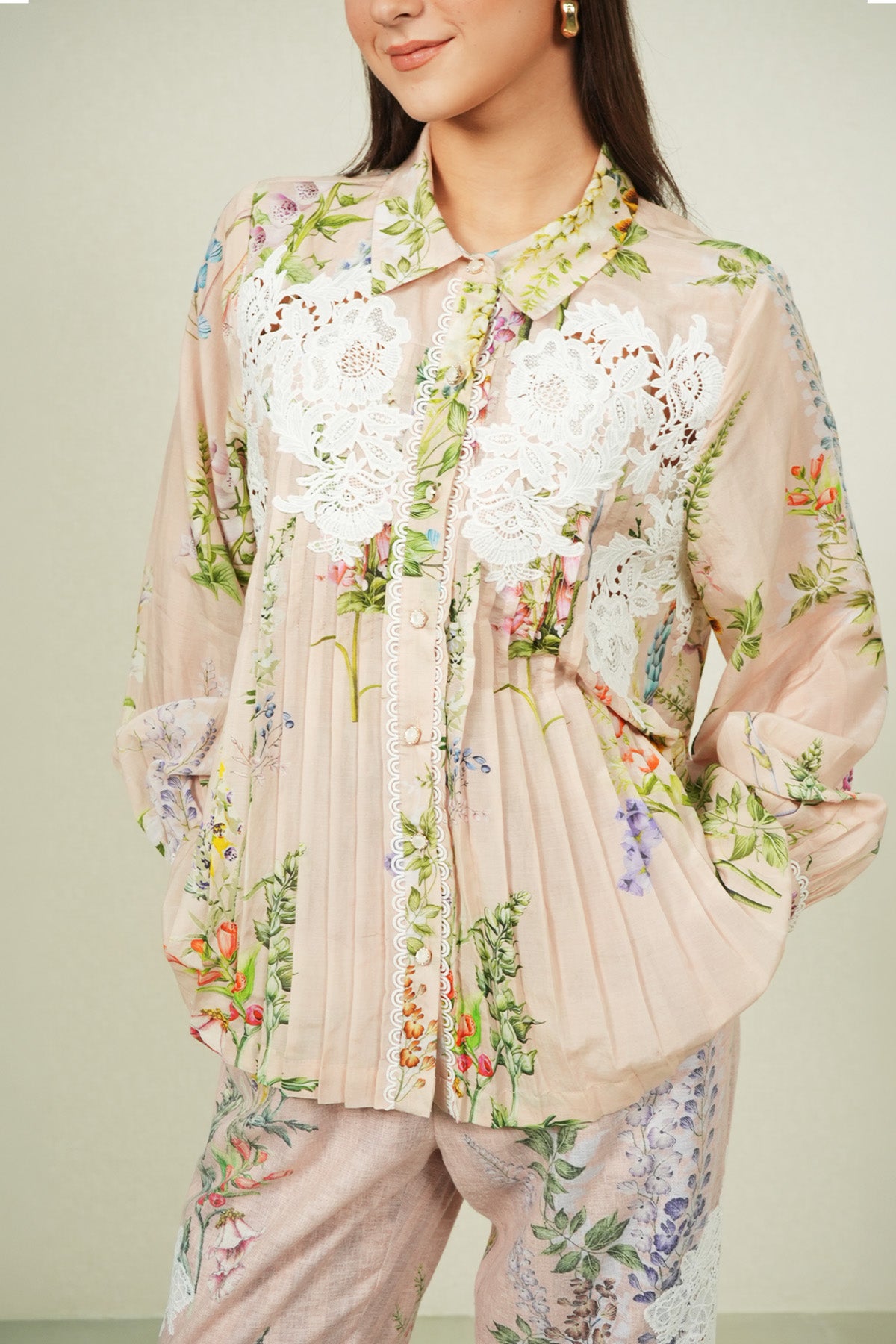 Precision meets surface detail in the Bloomlet Pleated Shirt, crafted in dhaka linen fabric and rendered in a multi-colour Visteria print. The shirt features a classic collar with a full front button placket, framed by fine vertical pleats that run through the body for a clean, structured fall. Floral artwork is printed across the fabric, while lace applique panels are placed on the upper front to add contrast and texture. Finished with full sleeves and buttoned cuffs, this shirt pairs well with Ranna Gill's Elsa Rara Pants for polished co-ord look.