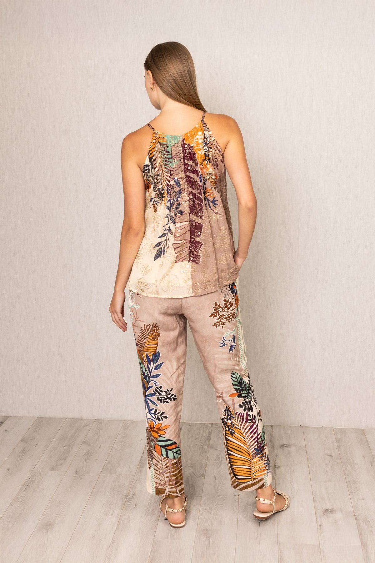 The Kia Tank Top blends structure and fluidity with its A-line silhouette and softly gathered neckline. Made in embroidered viscose, the Moma print stands out through a work of intricate foliage motifs, linear elements, and scattered florals in muted tones with pops of ochre, teal, and burgundy. Subtle gold thread detailing adds a gentle shimmer across the fabric, highlighting the dimensional quality of the embroidery. The keyhole front and chain straps elevate the piece with refined accents. Pair it with Liora rara Pants or shorts, perfect for city strolls or an intimate dinner with friends.
