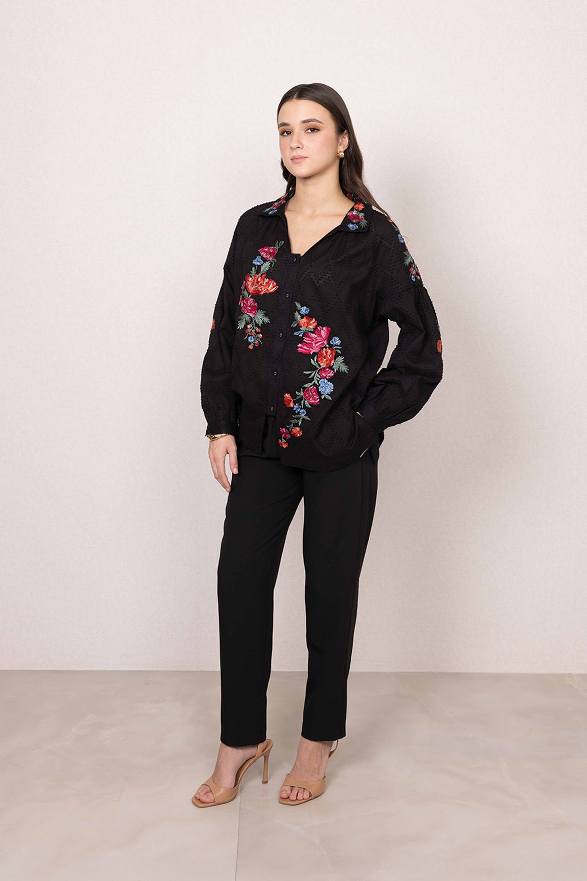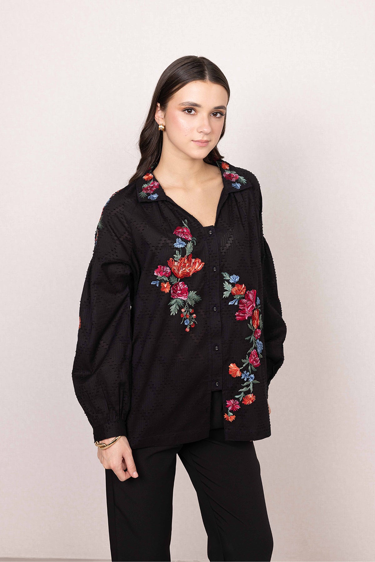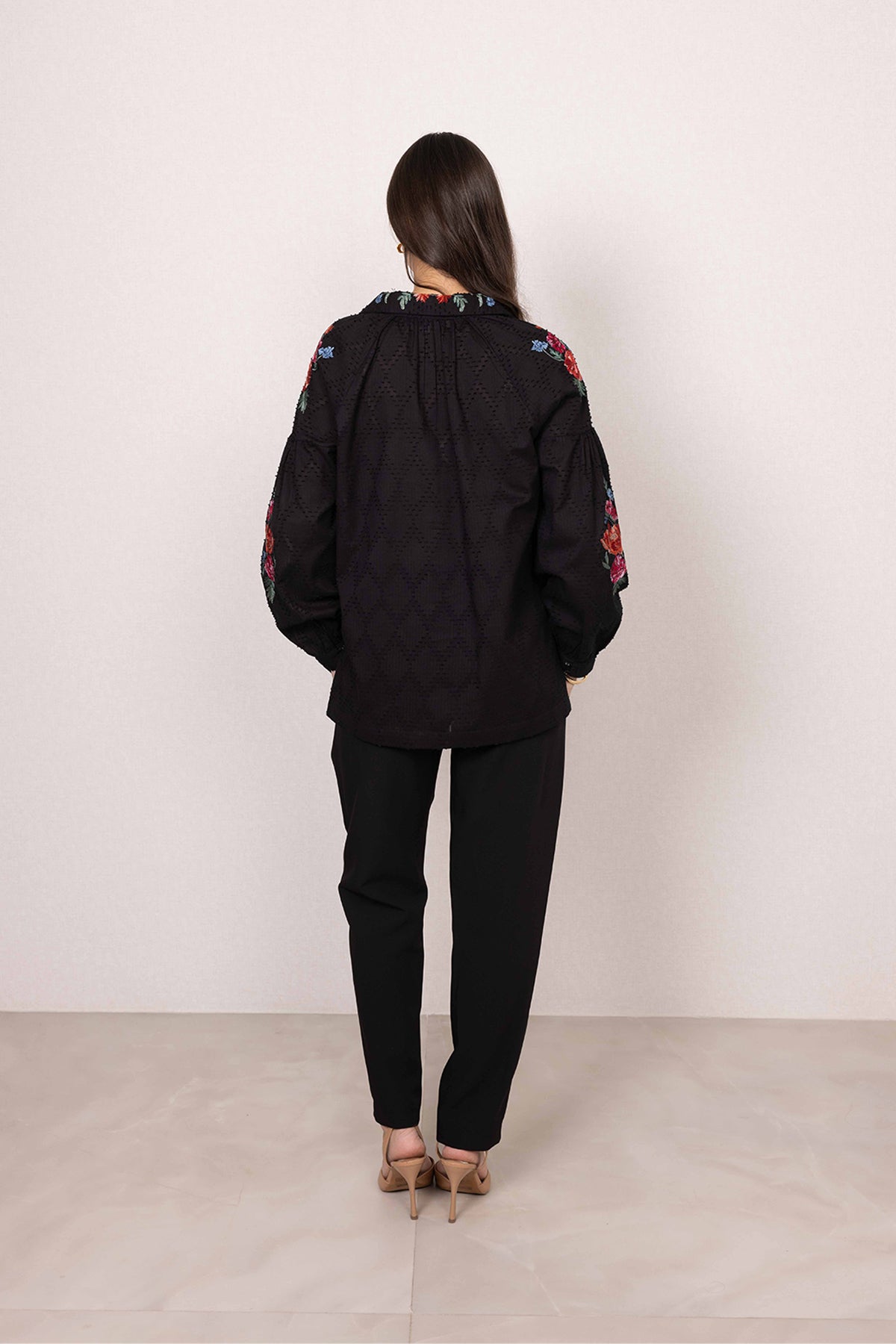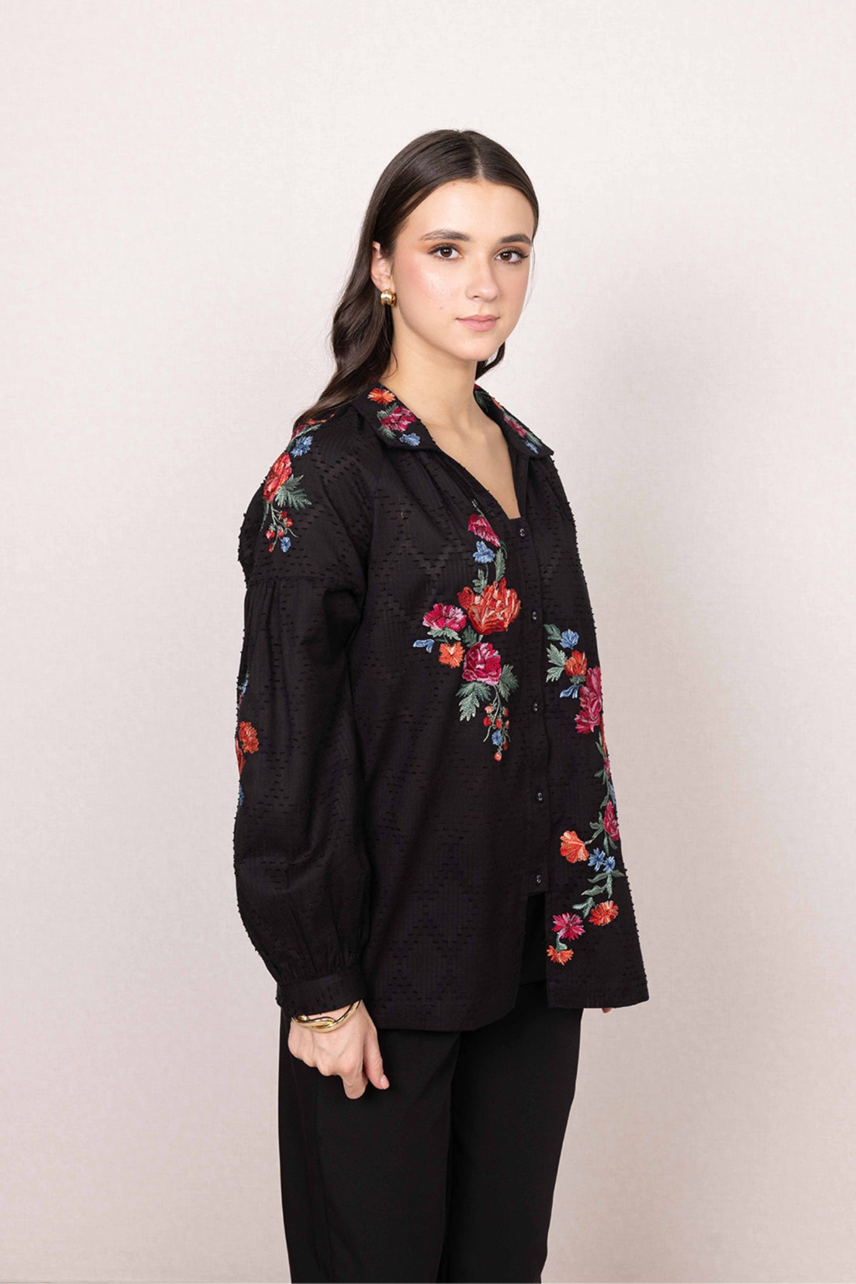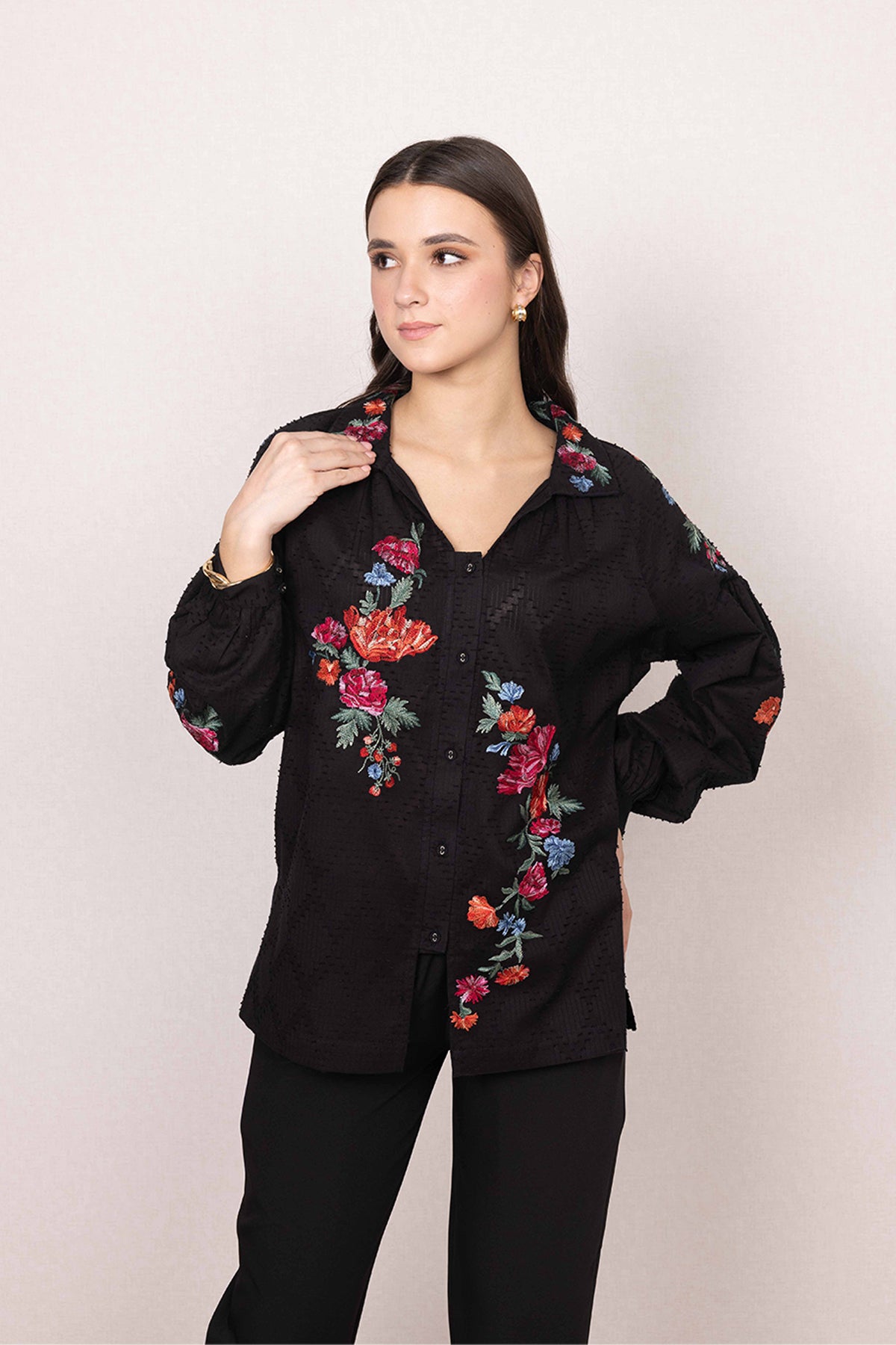 Floral embroidery runs across the front and collar, bringing colour with a sense of balance and intent.