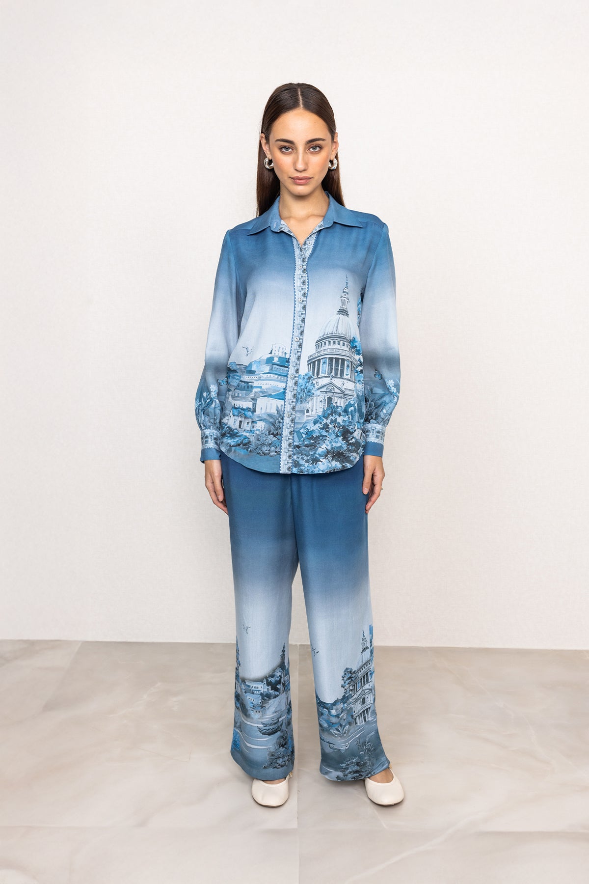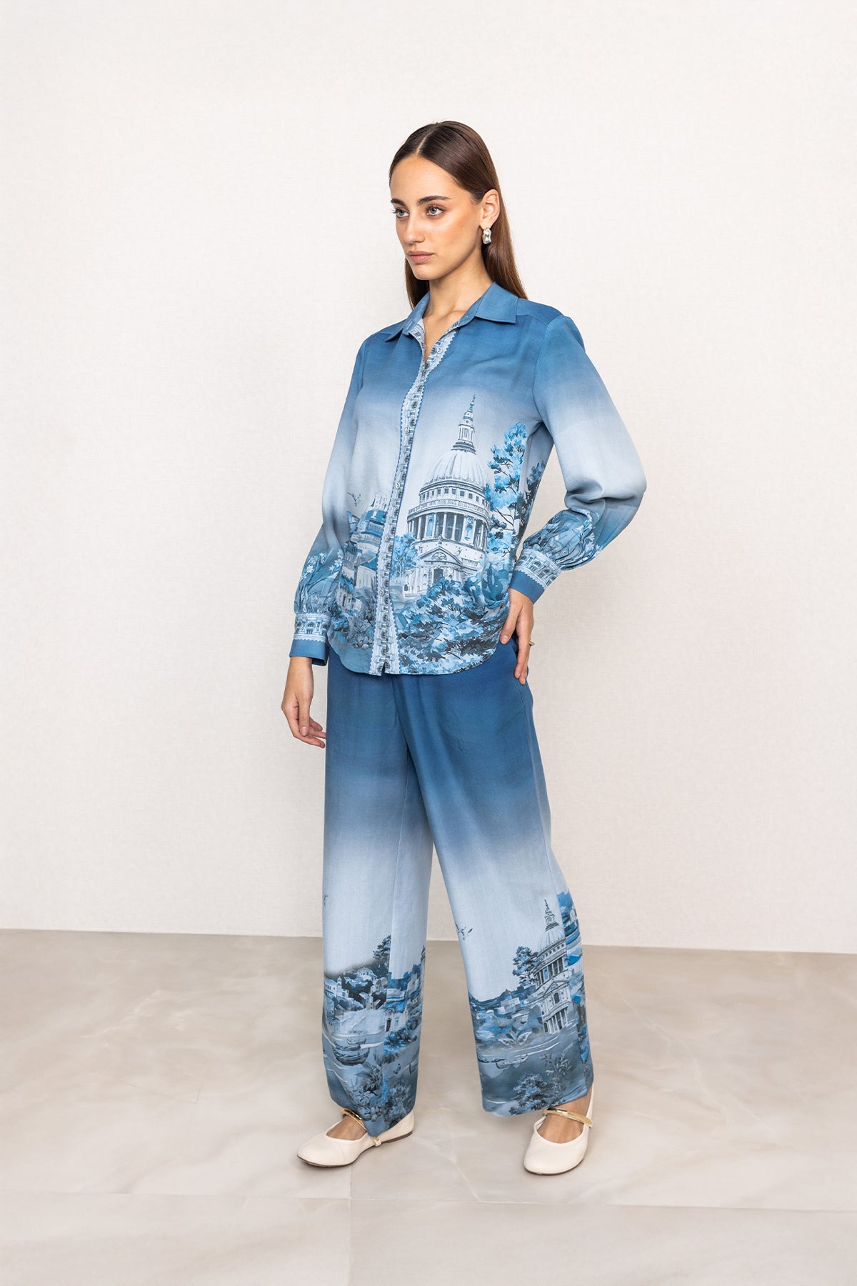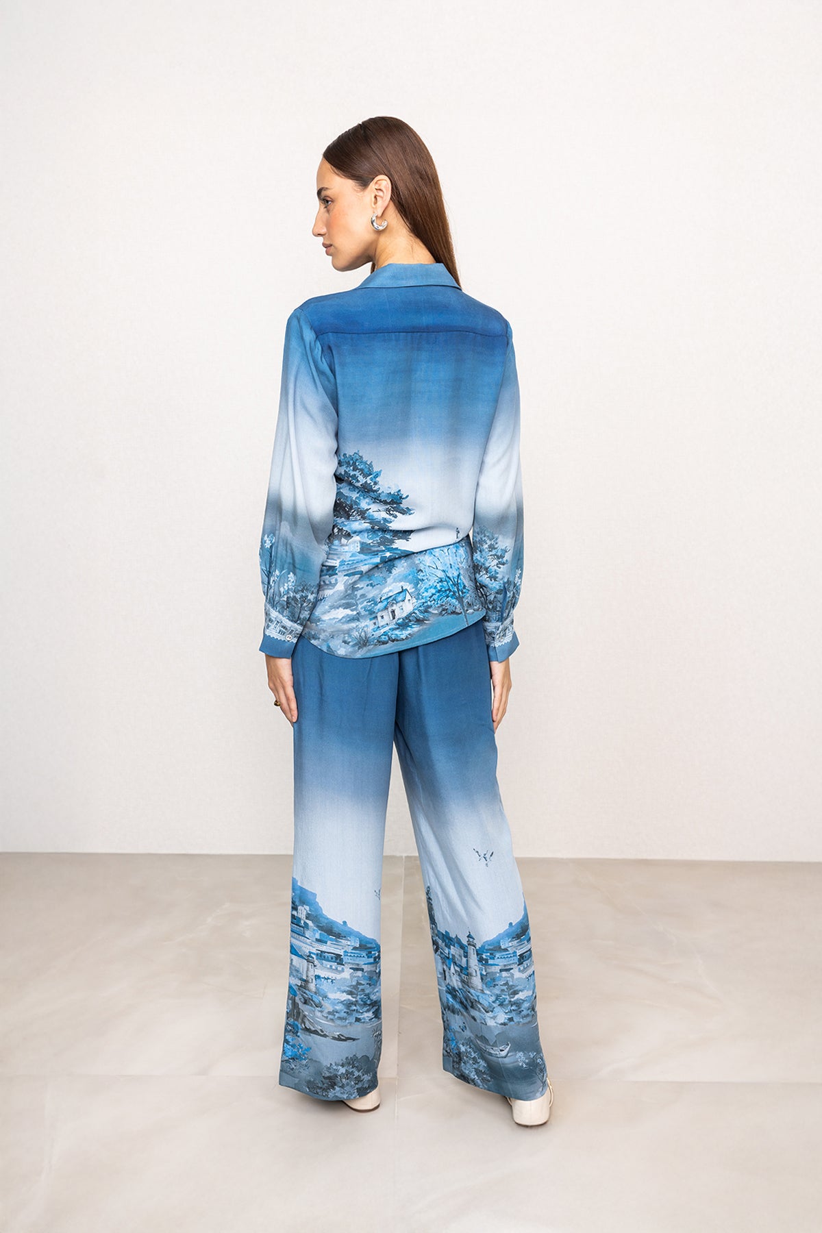 Introducing Ranna Gill's Misty Buttondown Shirt, a full-sleeved style crafted in breathable Tencel for a smooth, lightweight feel on the skin. Finished in a blue ombré tone, the shirt features the Rome print, where architectural artwork is placed along the lower body and sleeves, creating visual depth. Designed with a classic collar neckline and a front button placket detailed with printed trims, it offers a clean, structured look. Soft gathers at the cuffs add subtle shape, making the fit comfortable while staying neatly defined.