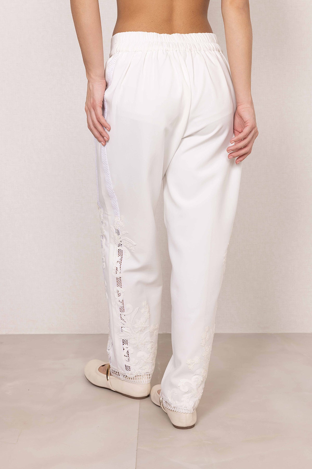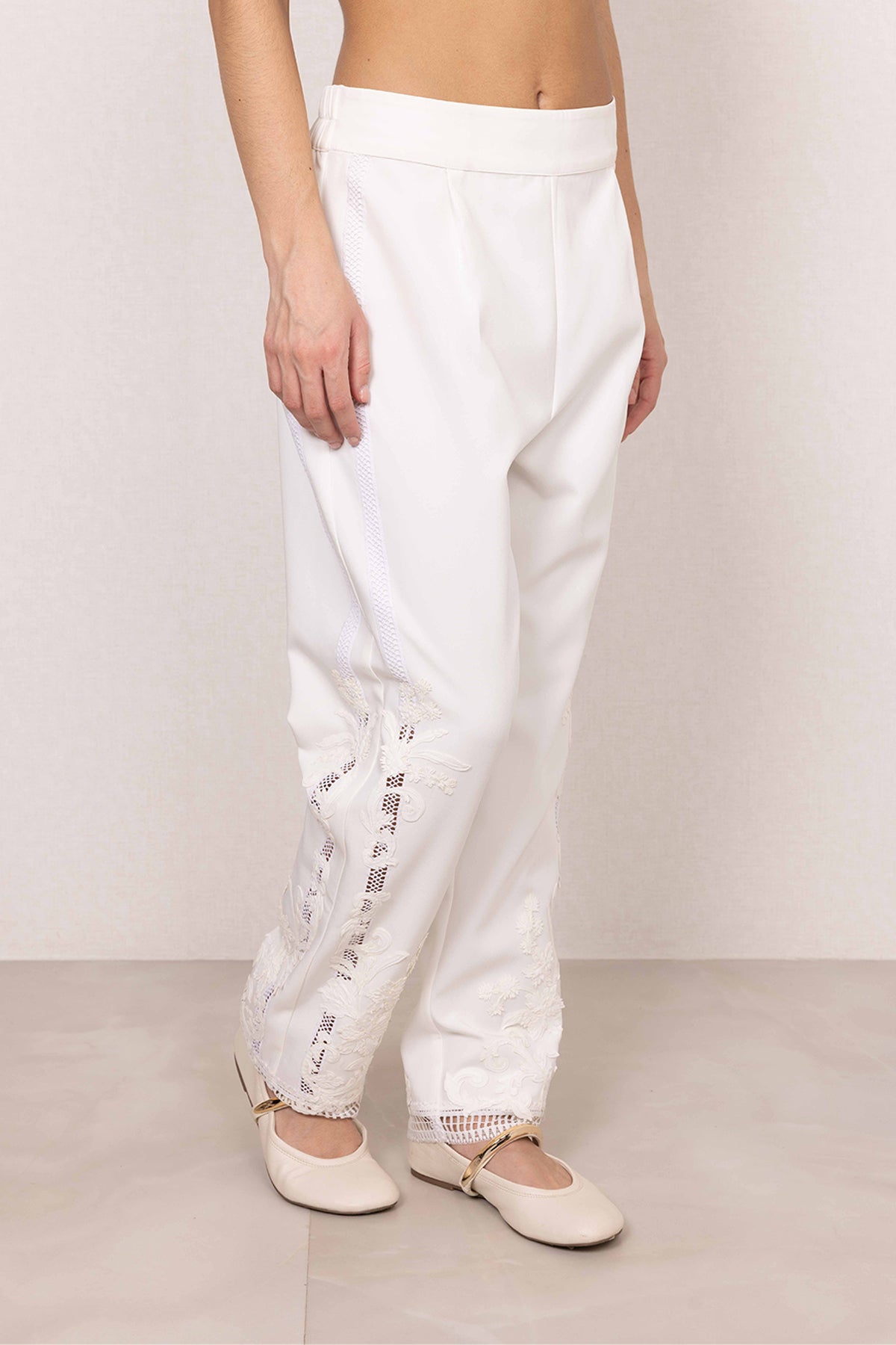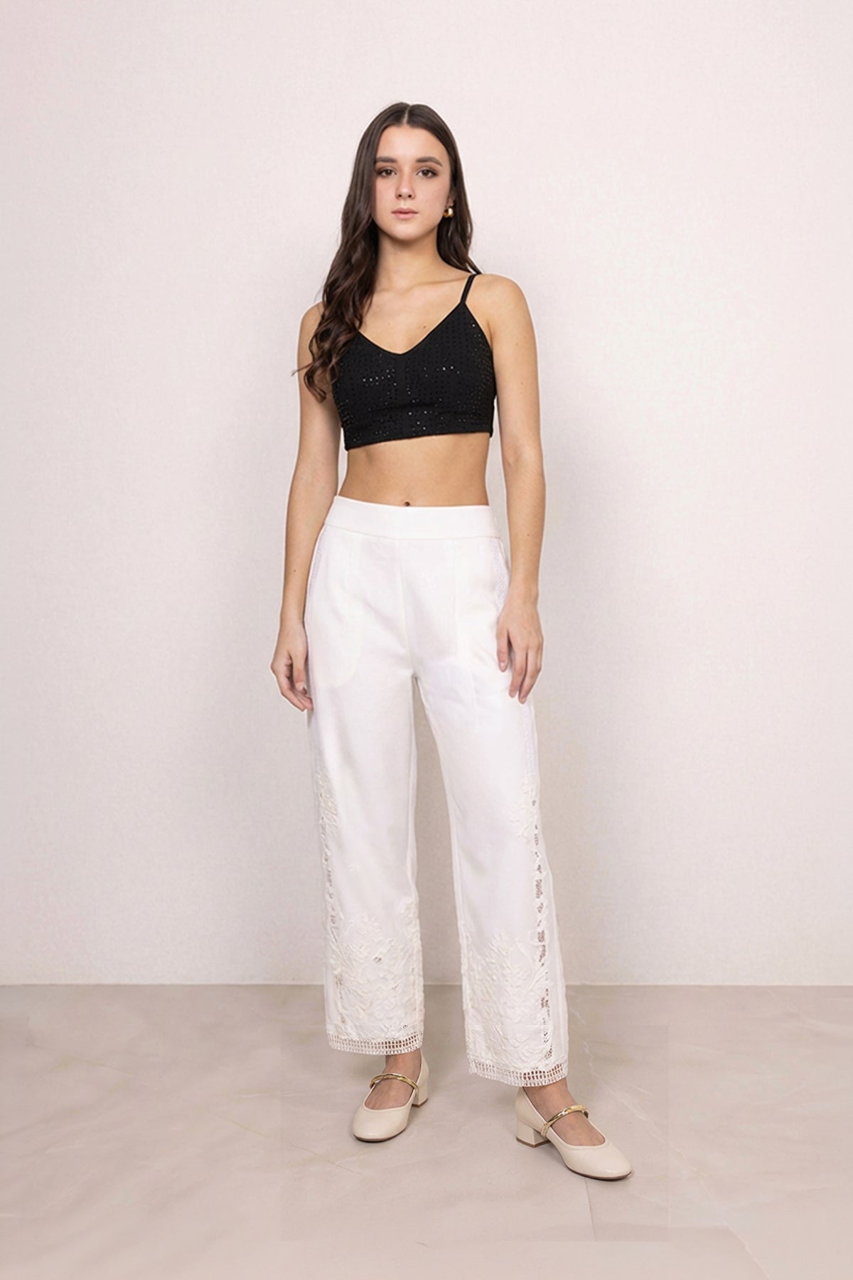 Clean lines meet quiet detail in the Selene Lace Pants. Cut in a crisp white hue, this silhouette is elevated with lace accents at the hem, adding just the right touch of interest. The straight-fit shape keeps it sharp yet easy, making it perfect for pairing with statement tops or layered looks. A refined essential that works from day plans to dressed-up evenings.