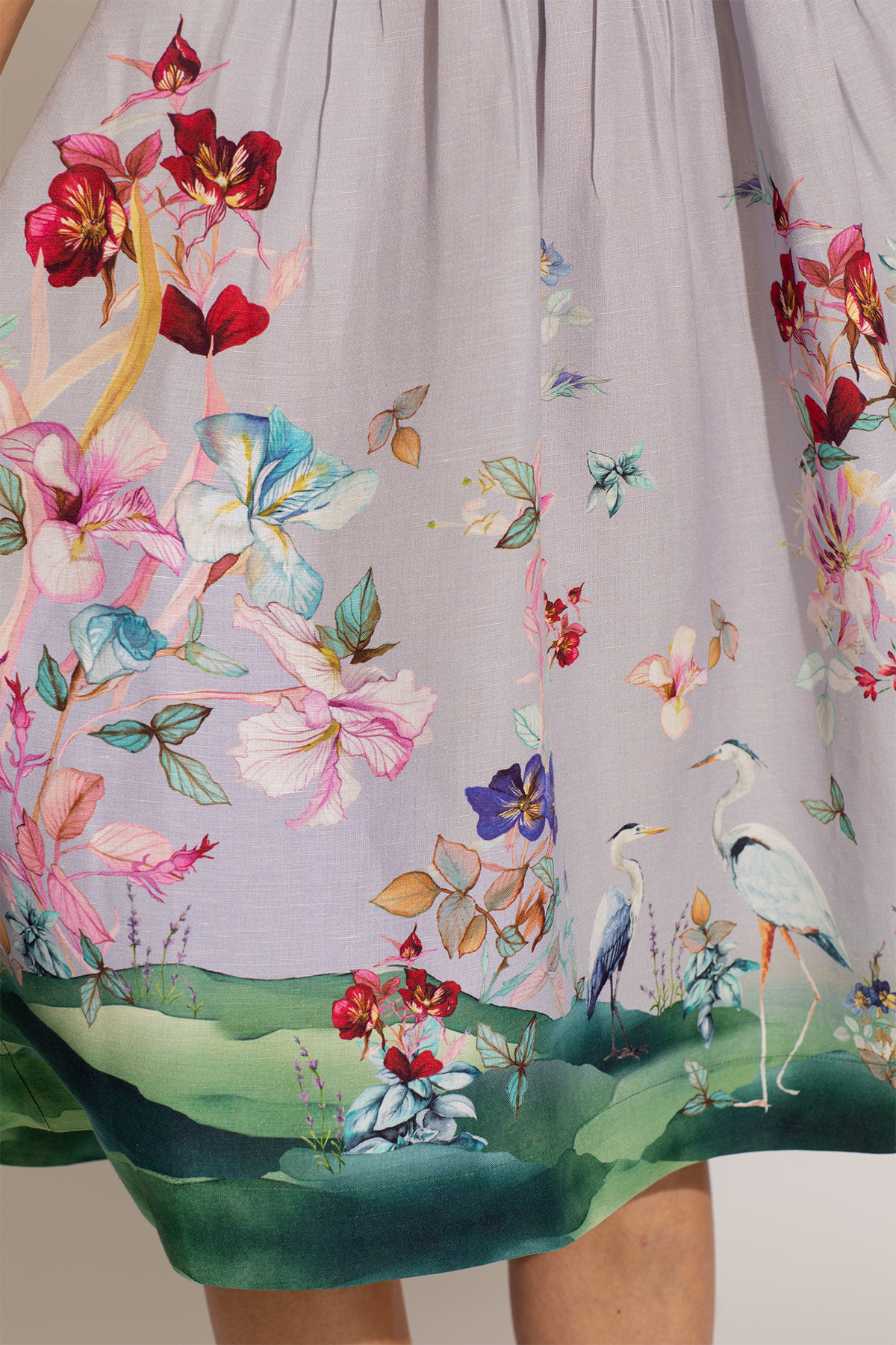 Step into the season with Ranna Gill's Anaya Scallop Bodice Midi Dress, a vibrant expression of style and ease. Crafted in breathable Linen Viscose, this sleeveless midi features a delicately scalloped neckline, adding a soft, feminine touch. The Lavender Lilacs print comes with vivid floral motifs in shades of pink, red, and blue, cascading across the bodice and skirt, while the deep green border anchors the design beautifully. The wide straps mirror the floral artwork, creating harmony throughout the piece. Soft pleats flow from the waistline, giving the dress graceful movement, perfect for everything from casual daytime looks to refined gatherings.