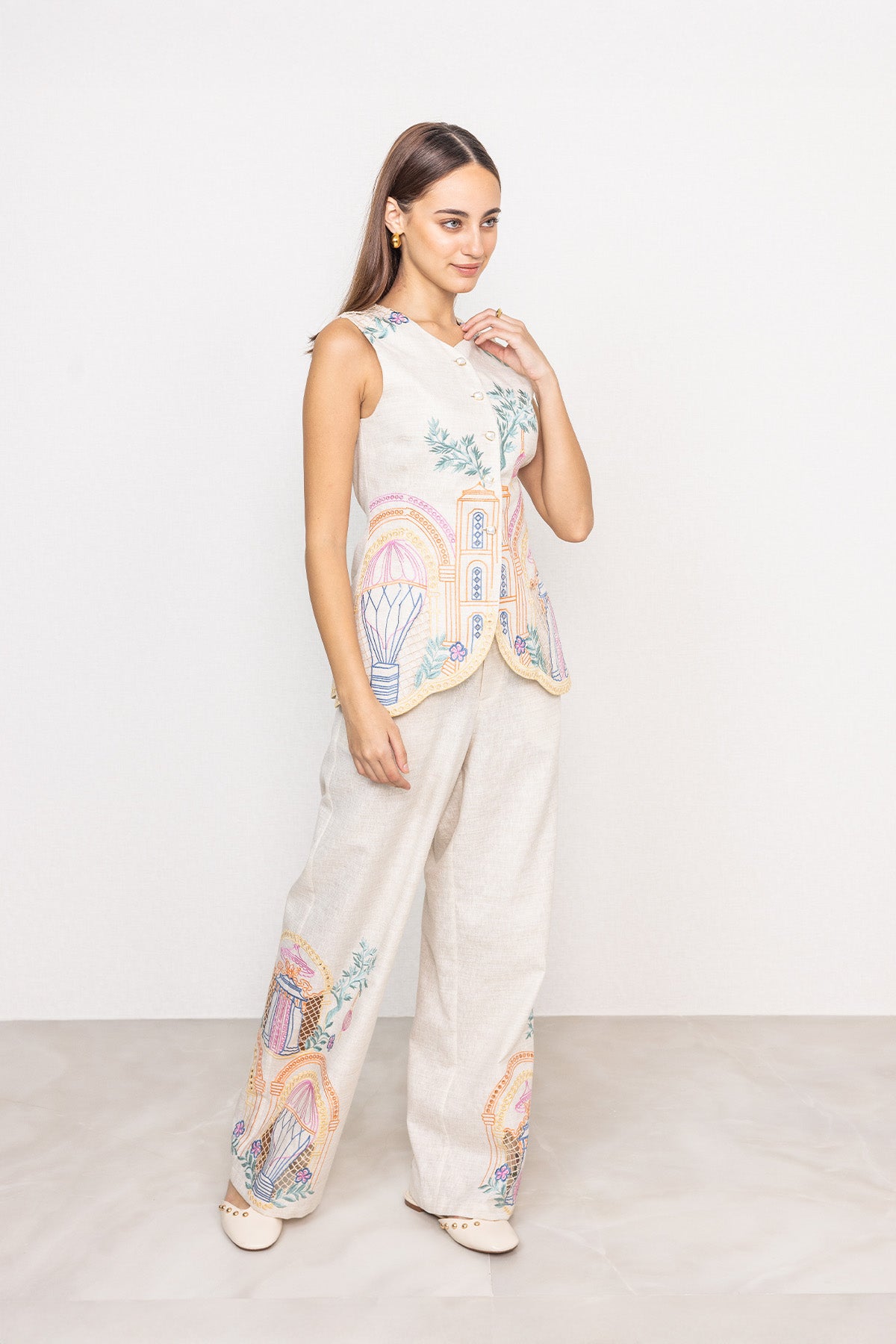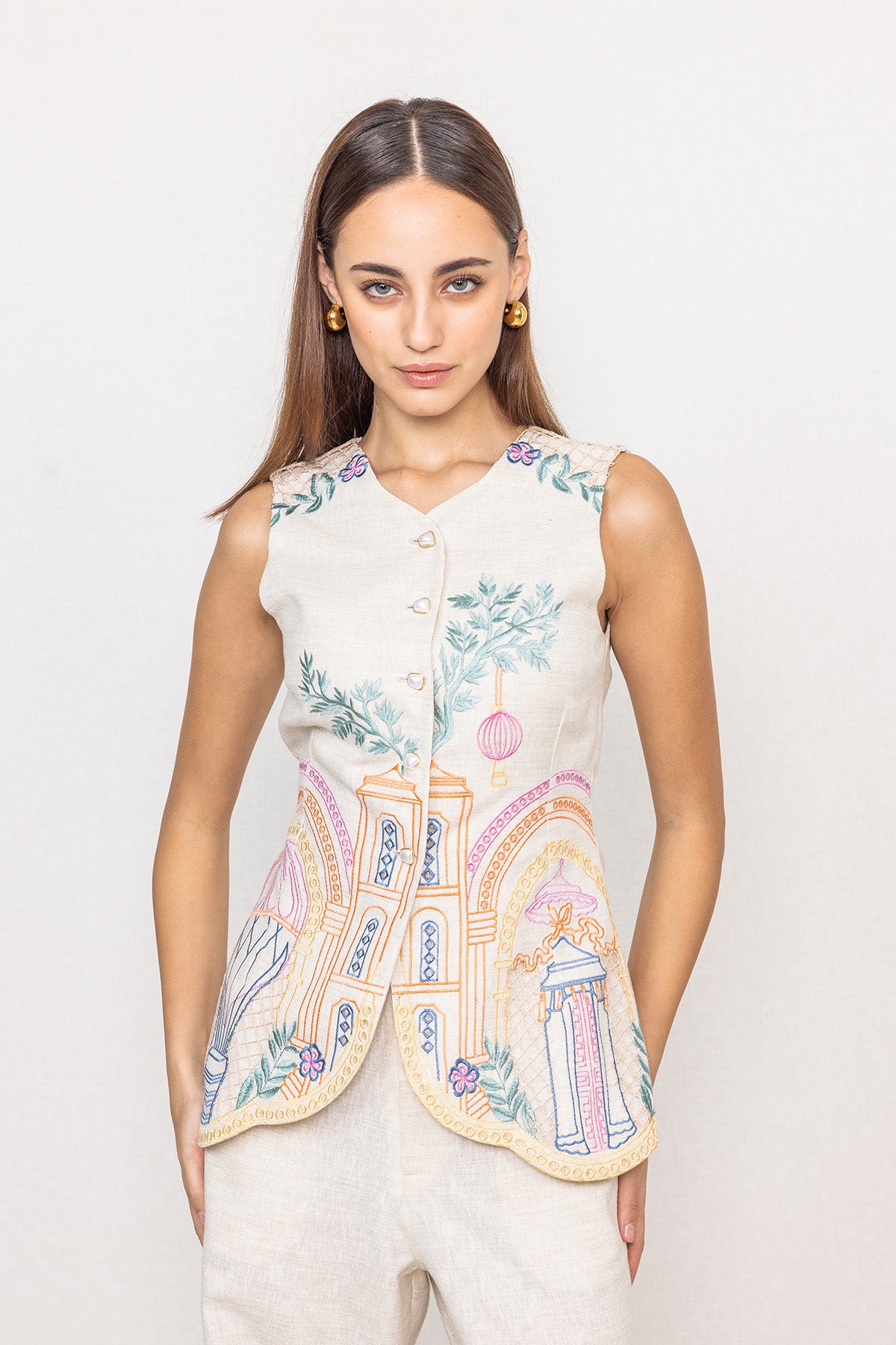 Ranna Gill's Avi Sleeveless Waist Coat is cut in oatmeal-toned linen with a clean, shaped fit that sits close through the waist. The sleeveless cut and soft V-neckline keep the upper body sharp, while the front button closure is detailed with fabric-covered buttons for a neat finish. Embroidered Eyelet artwork is placed across the front panels, featuring layered arches, lattice sections, foliage elements, and lantern motifs, finished with scalloped cutwork along the hem. The embroidery is stitched directly onto the base fabric, creating surface depth without bulk, and the waistcoat comes without pockets to maintain a streamlined look. Style it with Ranna Gill’s Ori High Waisted Pant to let the artwork carry the outfit.