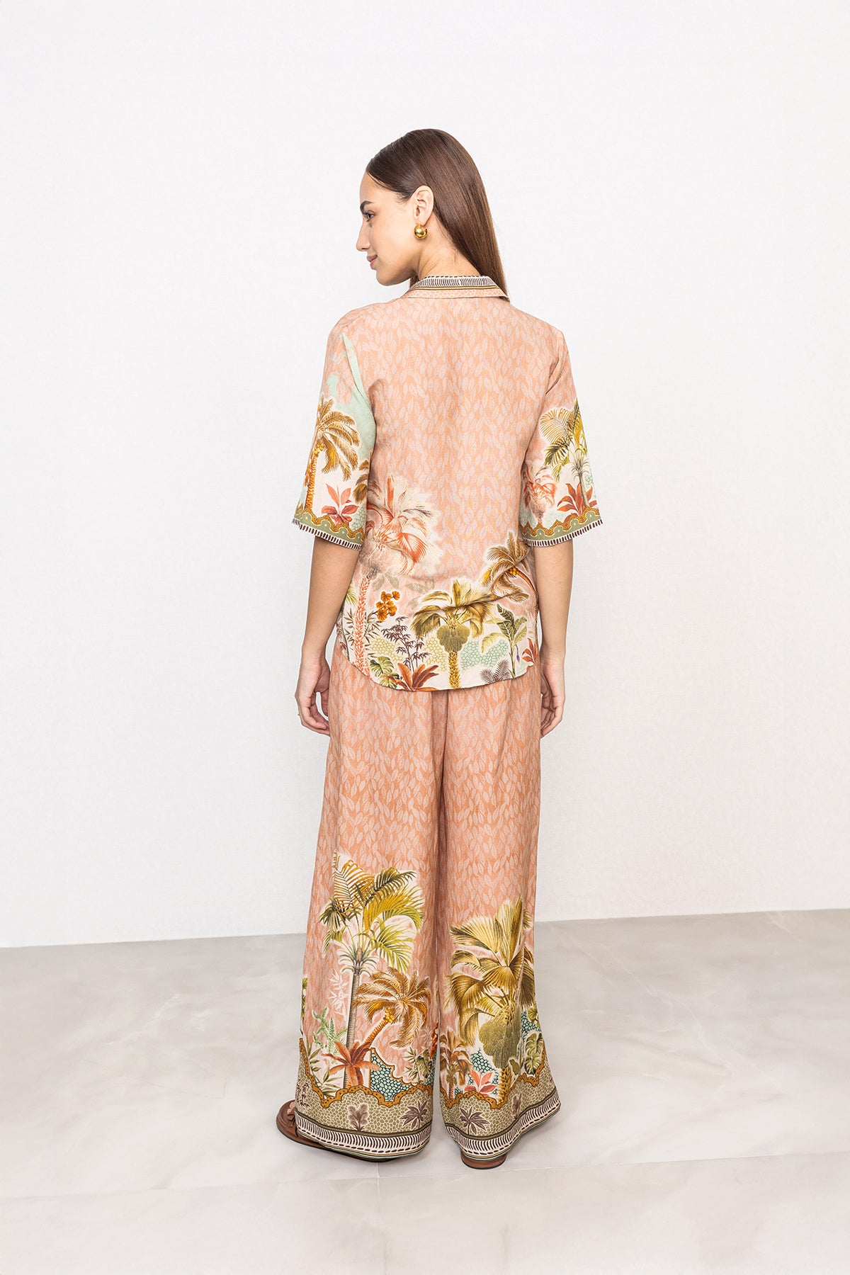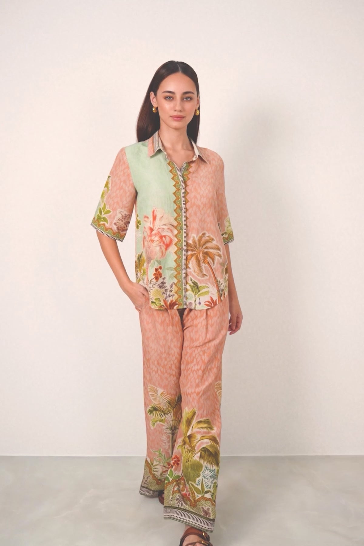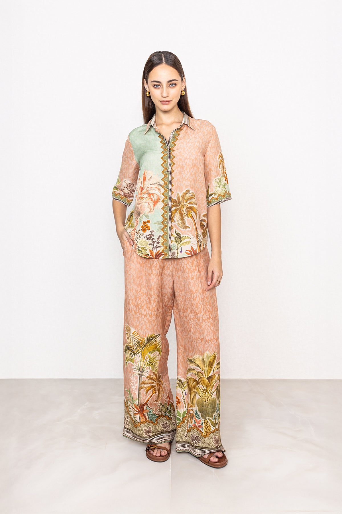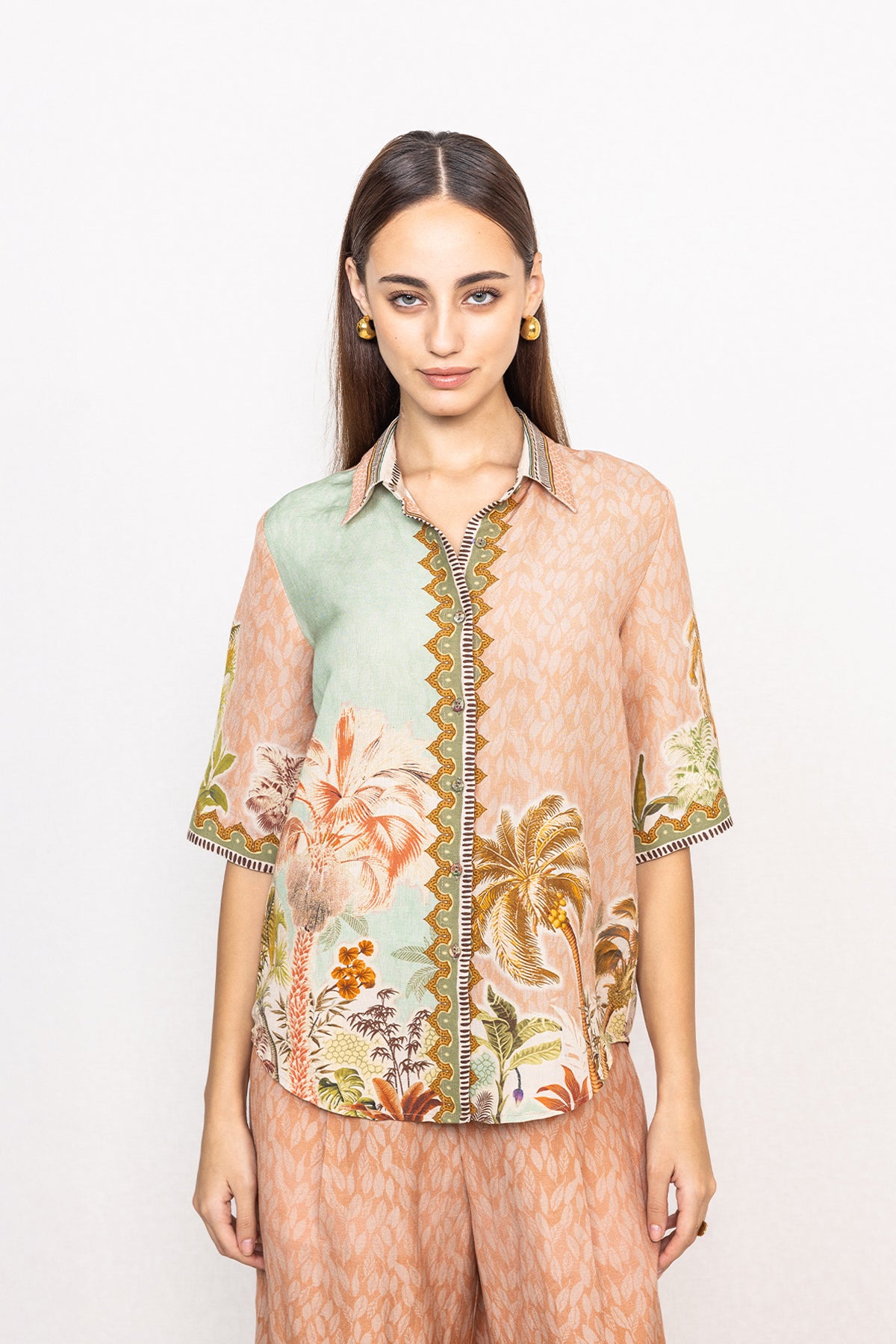 Introducing Ranna Gill's Elva Buttondown Shirt, A fresh take on printed separates, this buttondown shirt brings the Costa Rica print to life in soft linen viscose. Designed with a collared neckline and front button placket, it features half sleeves finished with printed borders for a clean, balanced look. The multicolour placement of palms and scenic motifs flows across the body, creating visual interest without feeling heavy. Worn loose, it sits comfortably on the frame, offering a relaxed yet well-defined silhouette that feels easy and wearable all day. Pair it with Ranna Gill's Anya Wide Leg pant for a perfect look.