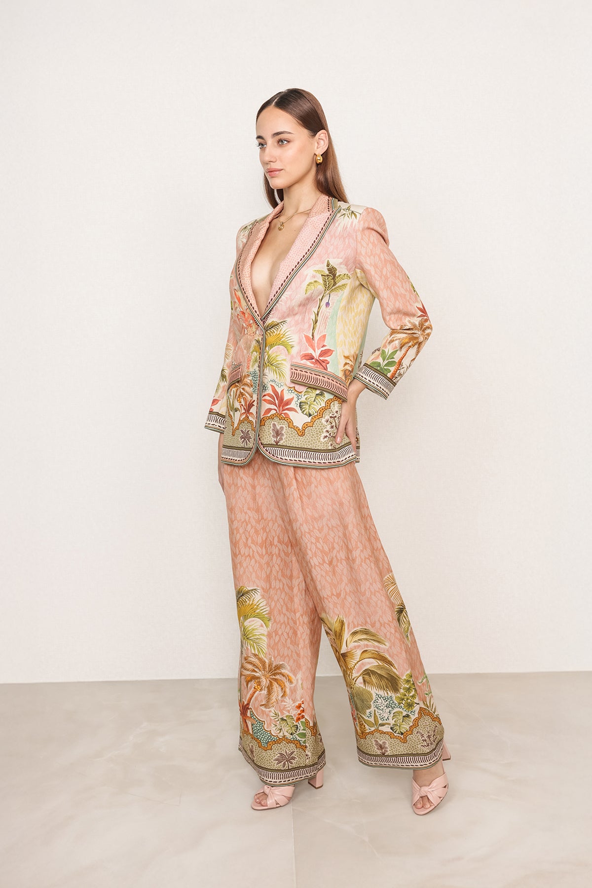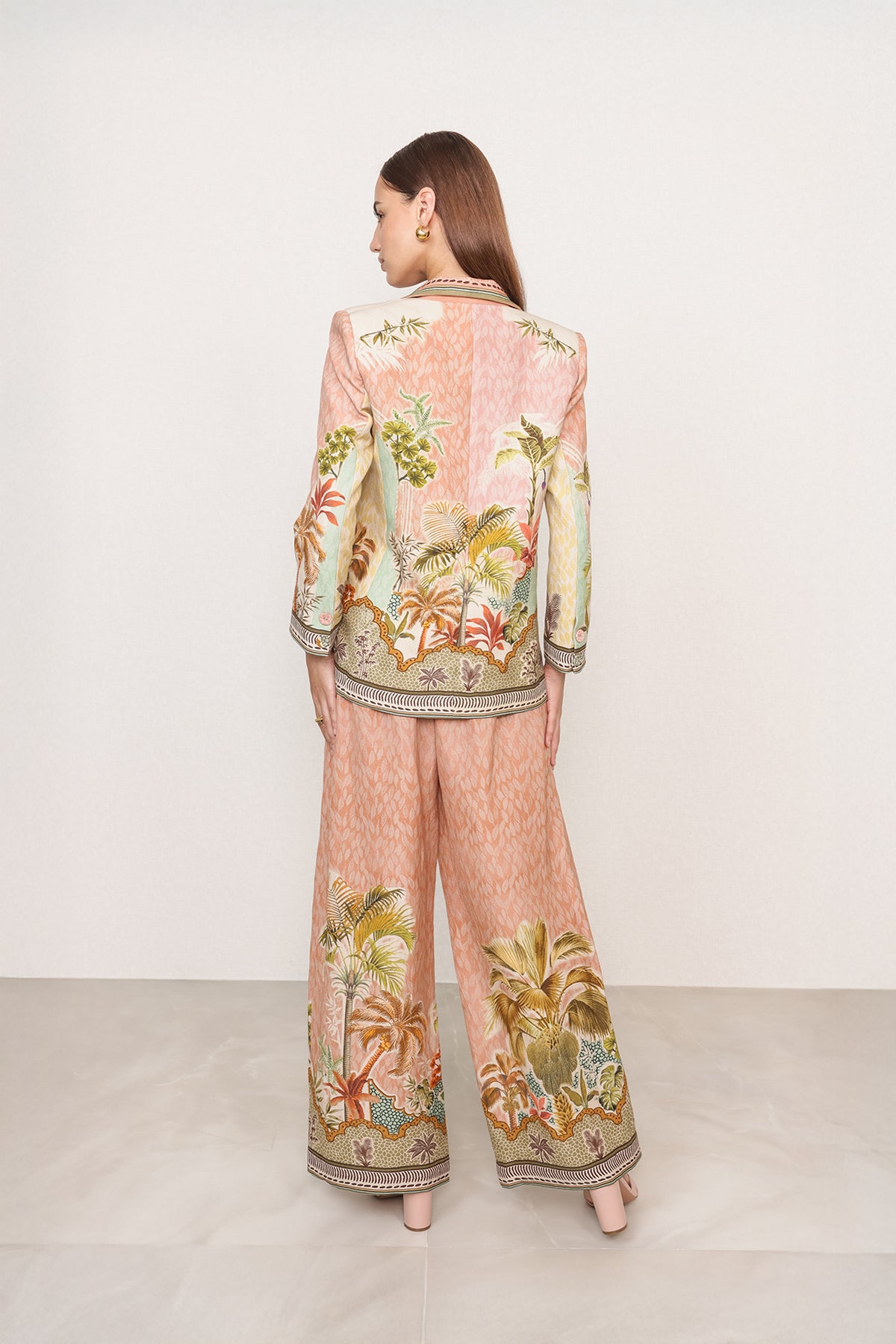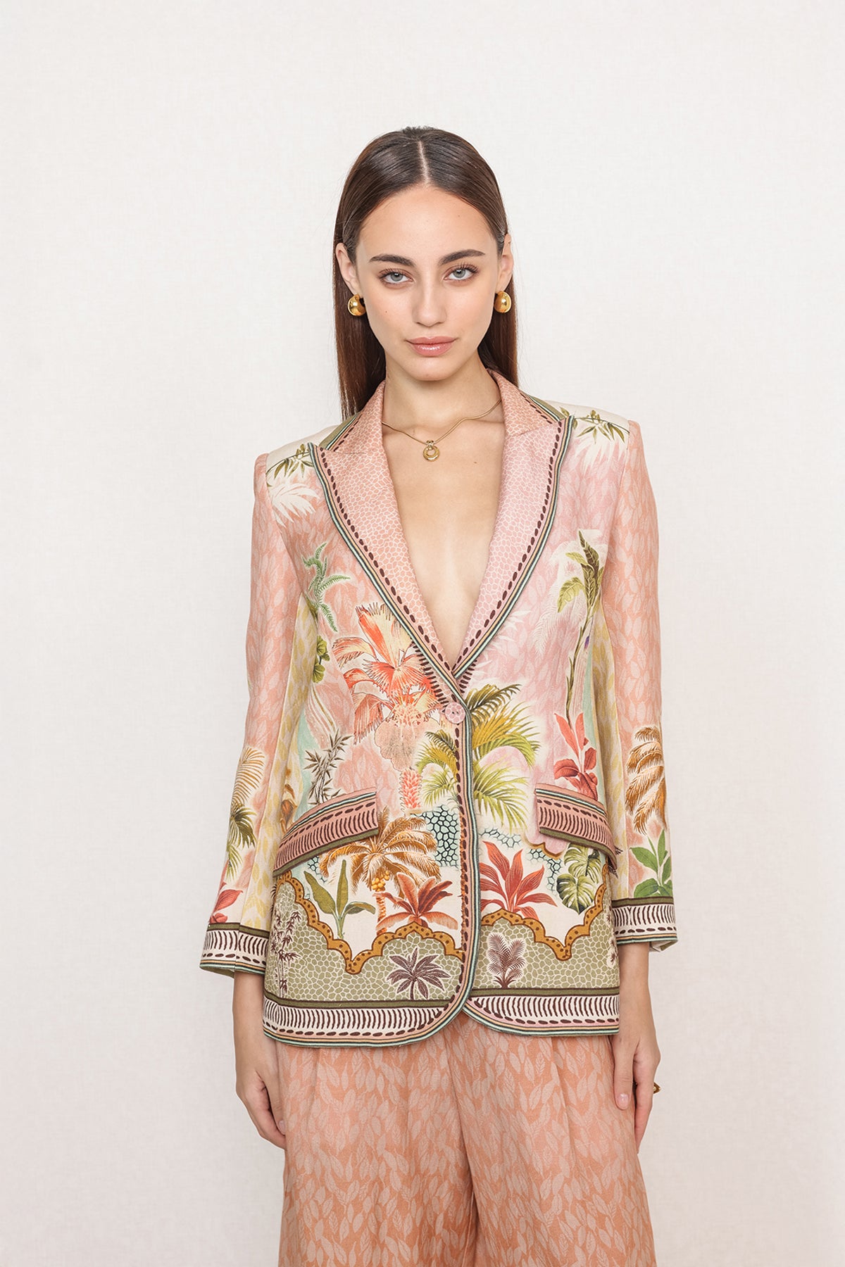 A jacket that frames the body with quiet confidence and visual depth. Crafted in linen viscose, this multi-color piece features the Costa Rica print with layered palm artwork and ornamental borders placed thoughtfully across the surface. Designed with full sleeves and a notch collar that opens into a deep V, highlighted by contrast piping and fine stitch detailing along the edges. The tailored-yet-relaxed fit sits clean on the shoulders and falls fluidly, making it feel structured without feeling stiff.