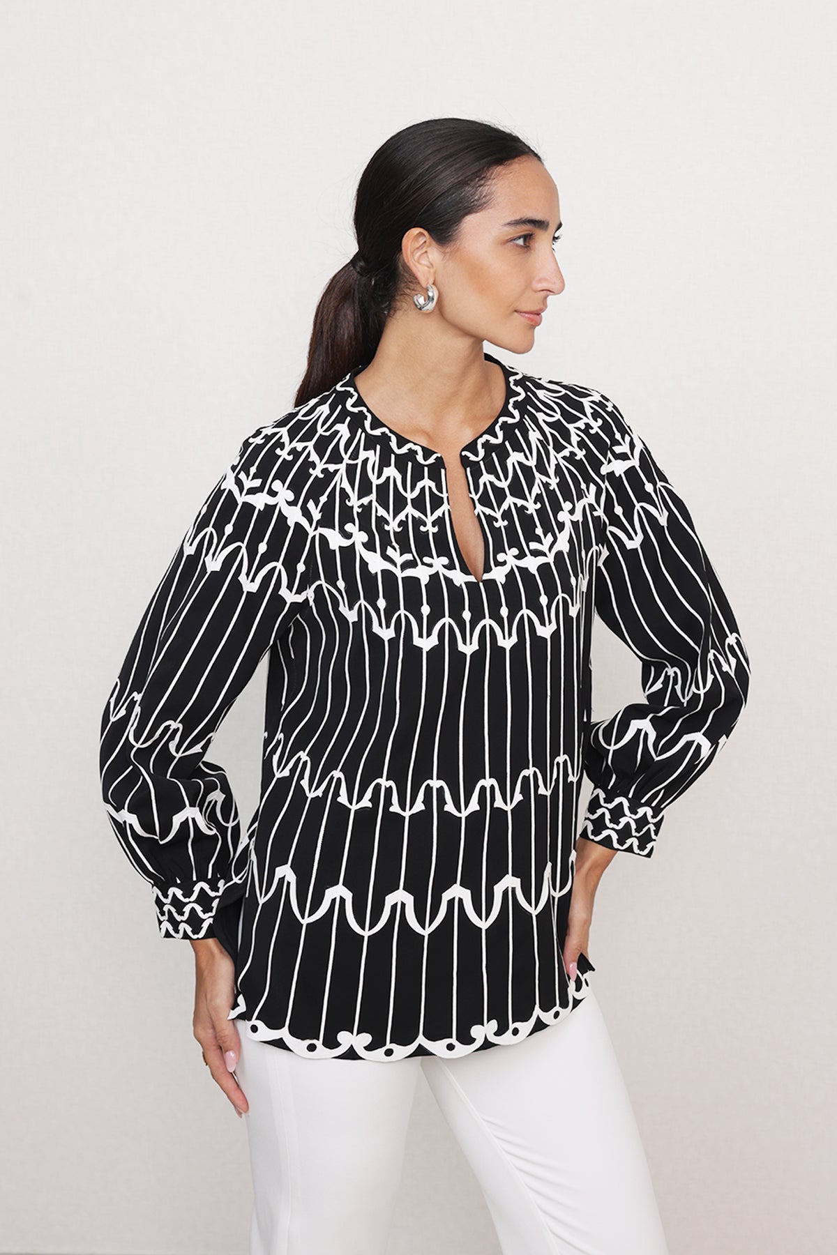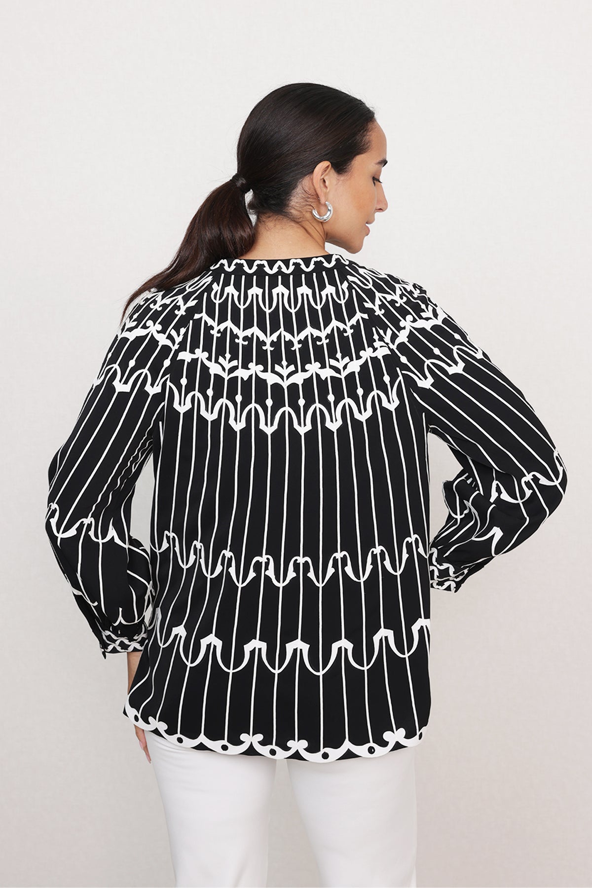 Introducing Ranna Gill's Lucas Blouse that brings a fresh edge to everyday dressing. Made in royal georgette, this black blouse features an all-over linear print with scalloped borders and a soft gathered neckline with a front slit. Full sleeves with printed cuffs add structure while keeping the look fluid.
