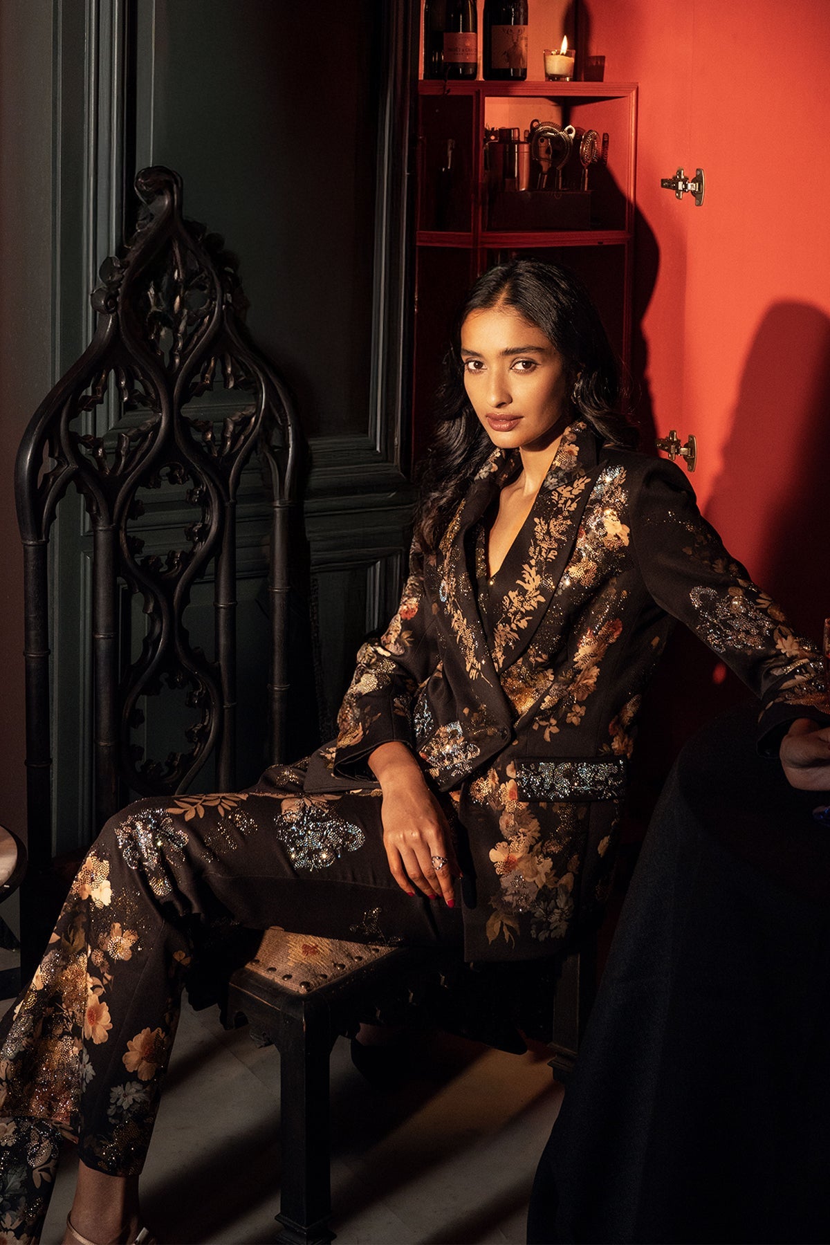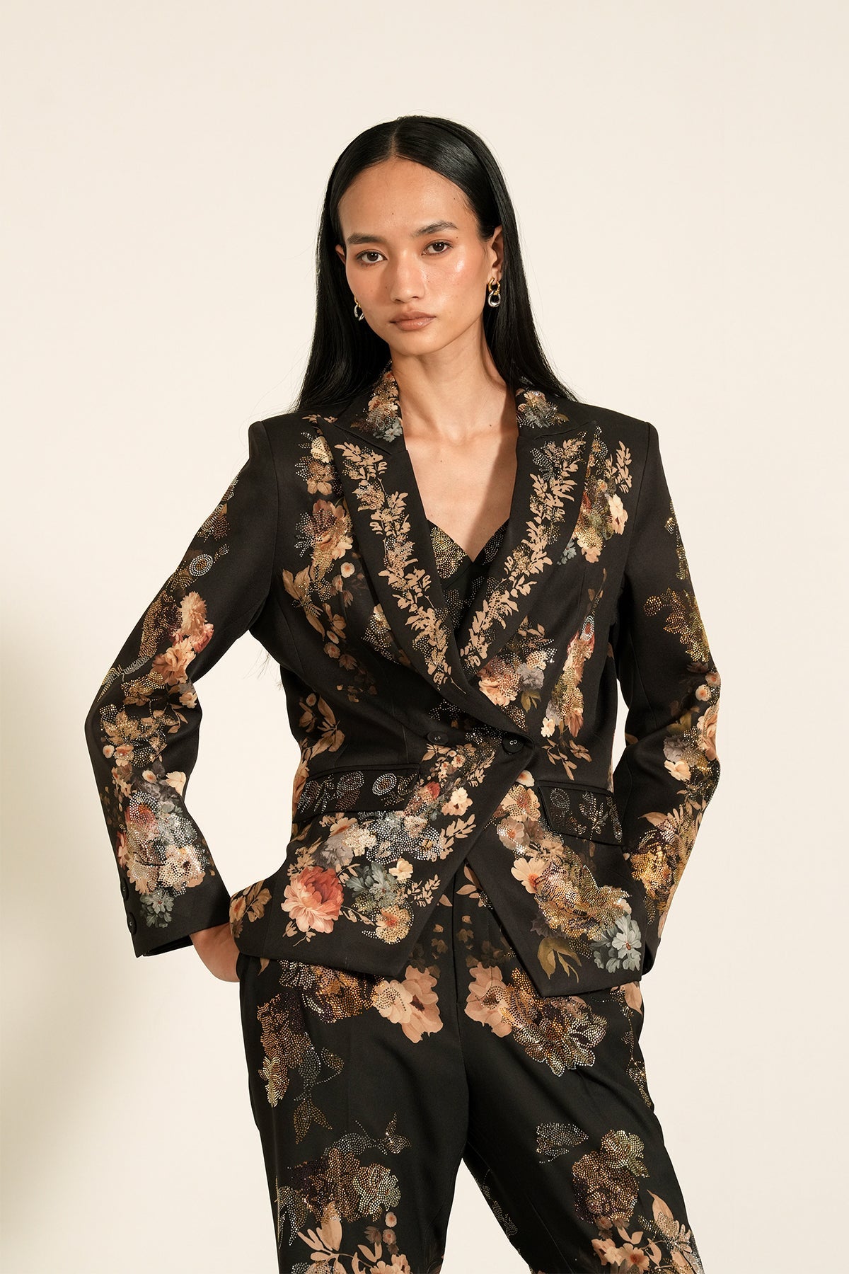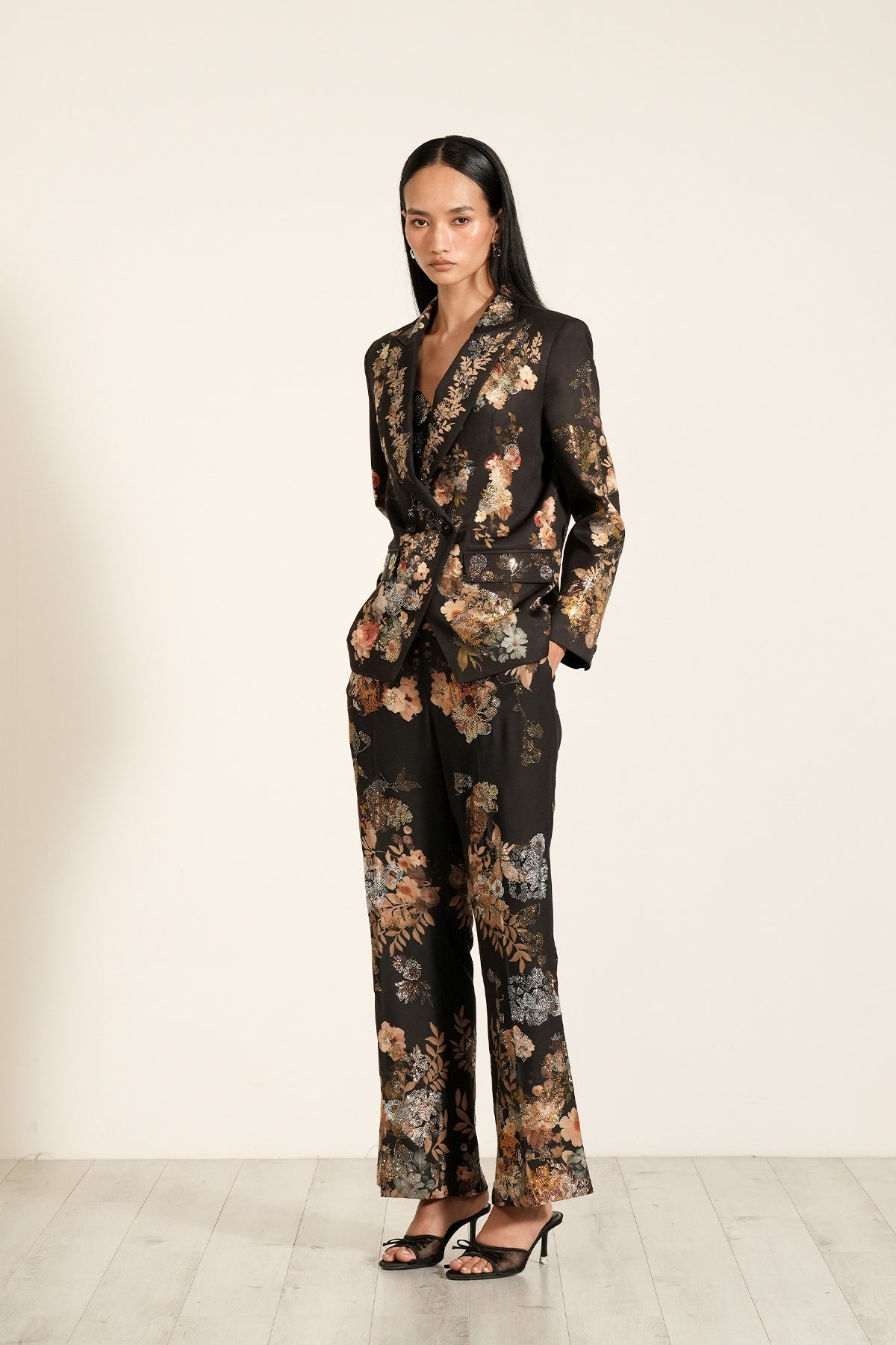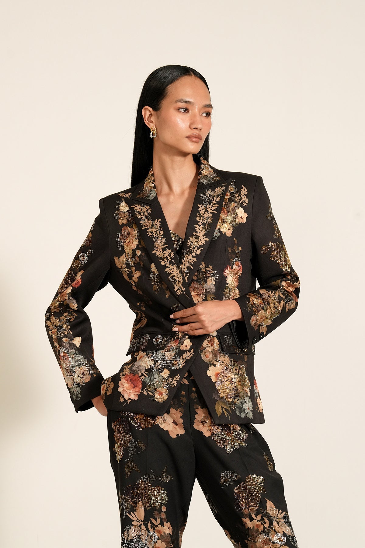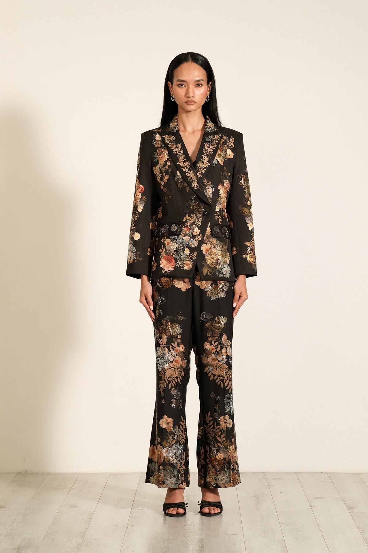 Introducing Ranna Gill's "Black Peony" printed Lumiere Jacket, & Pants a masterpiece crafted from luxurious Crepe Blend fabric. This enchanting jacket is designed to be a standout piece for any occasion with its exquisite detailing, including neat stitching and a streamlined cut.