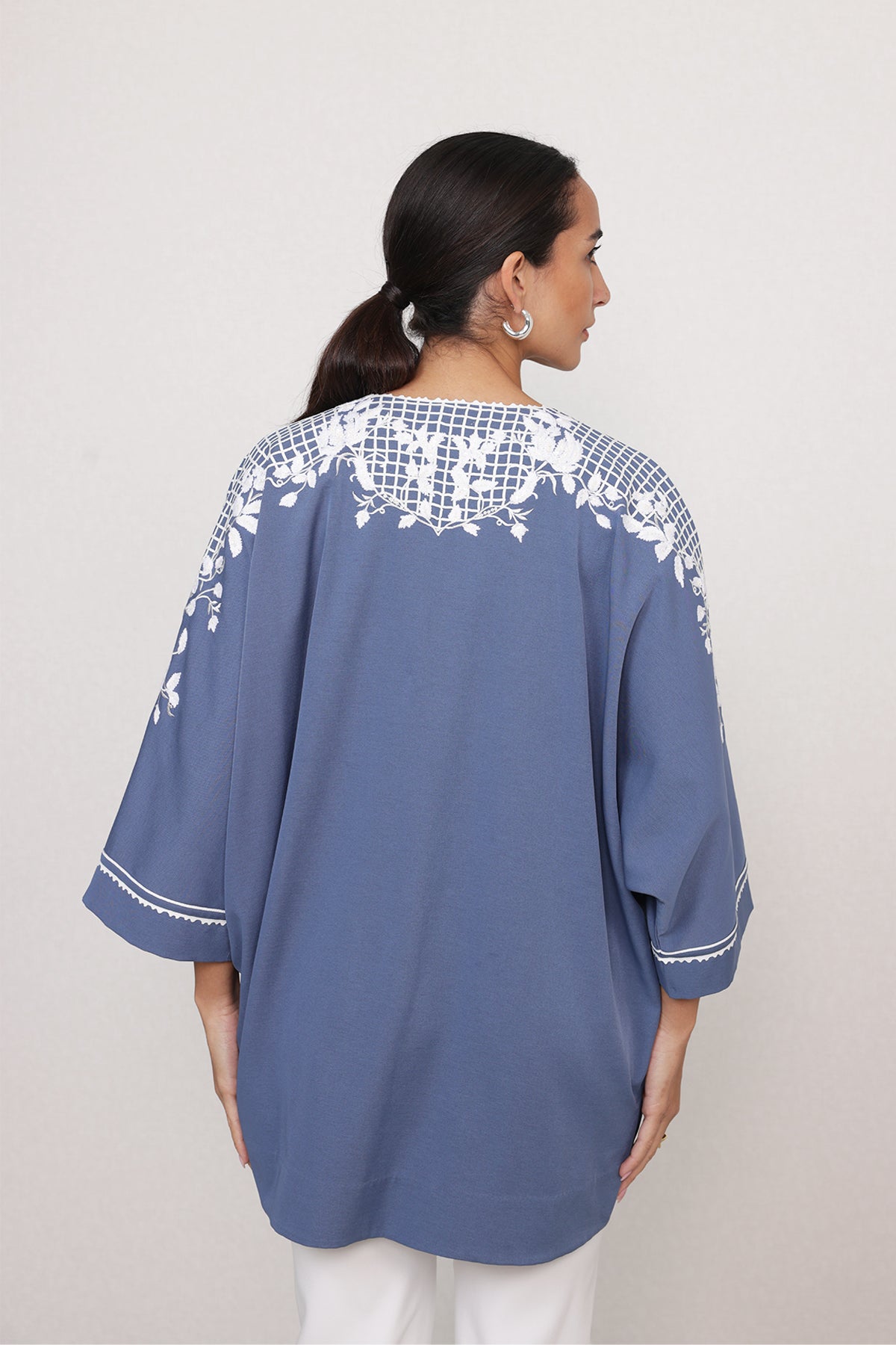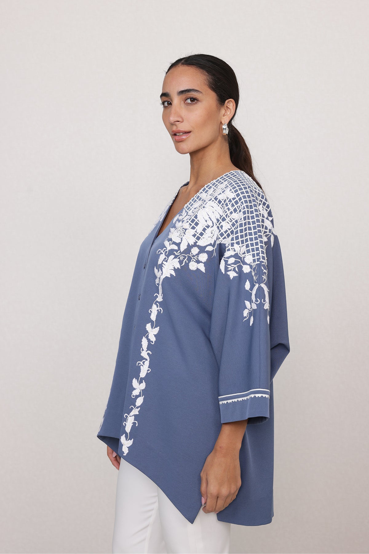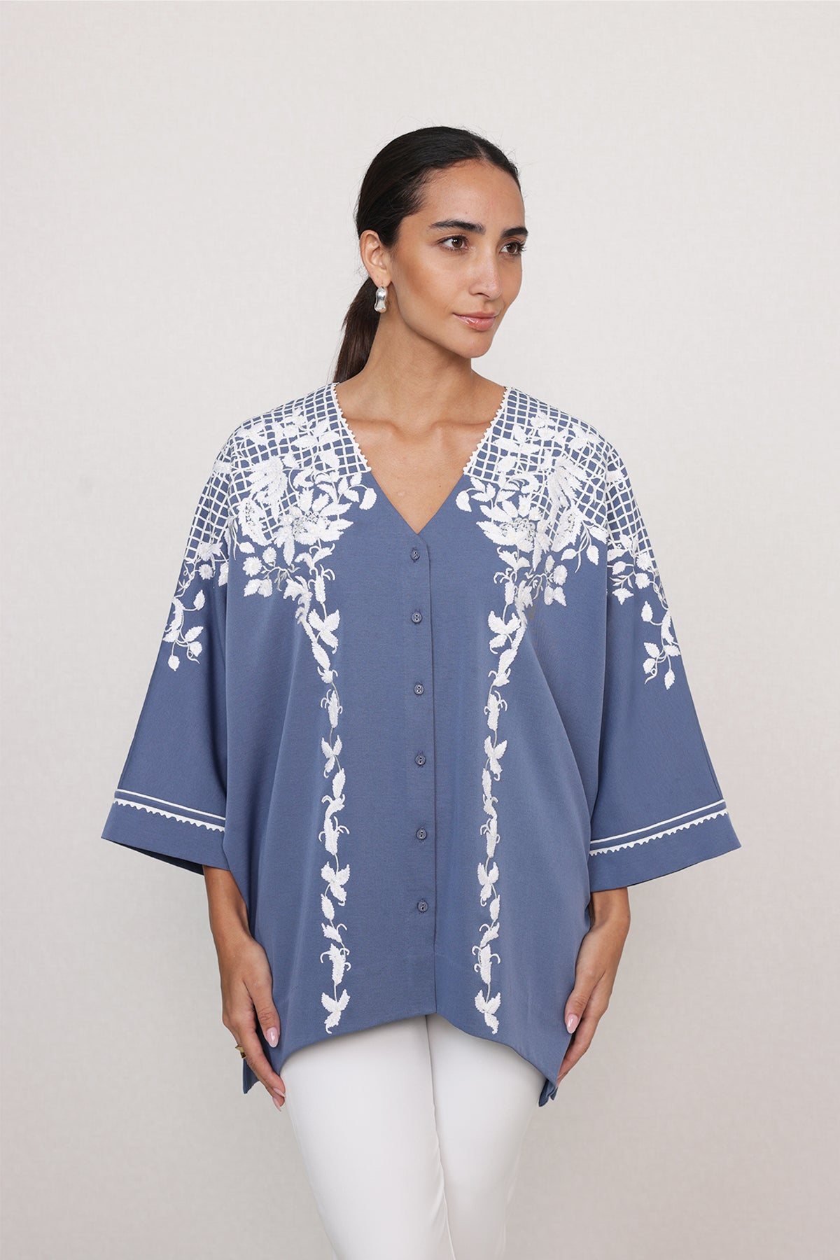 A quiet statement that draws you in at first glance. Featuring Ranna Gill's Seraya Shirt comes in a blue color, brought alive with ivory floral placement along the shoulders and front panels. Cut in lightweight China georgette, it features a soft V-neckline, fabric-covered buttons, and relaxed sleeves with fine stitch detailing. The print frames the silhouette beautifully, adding interest without overpowering the form.