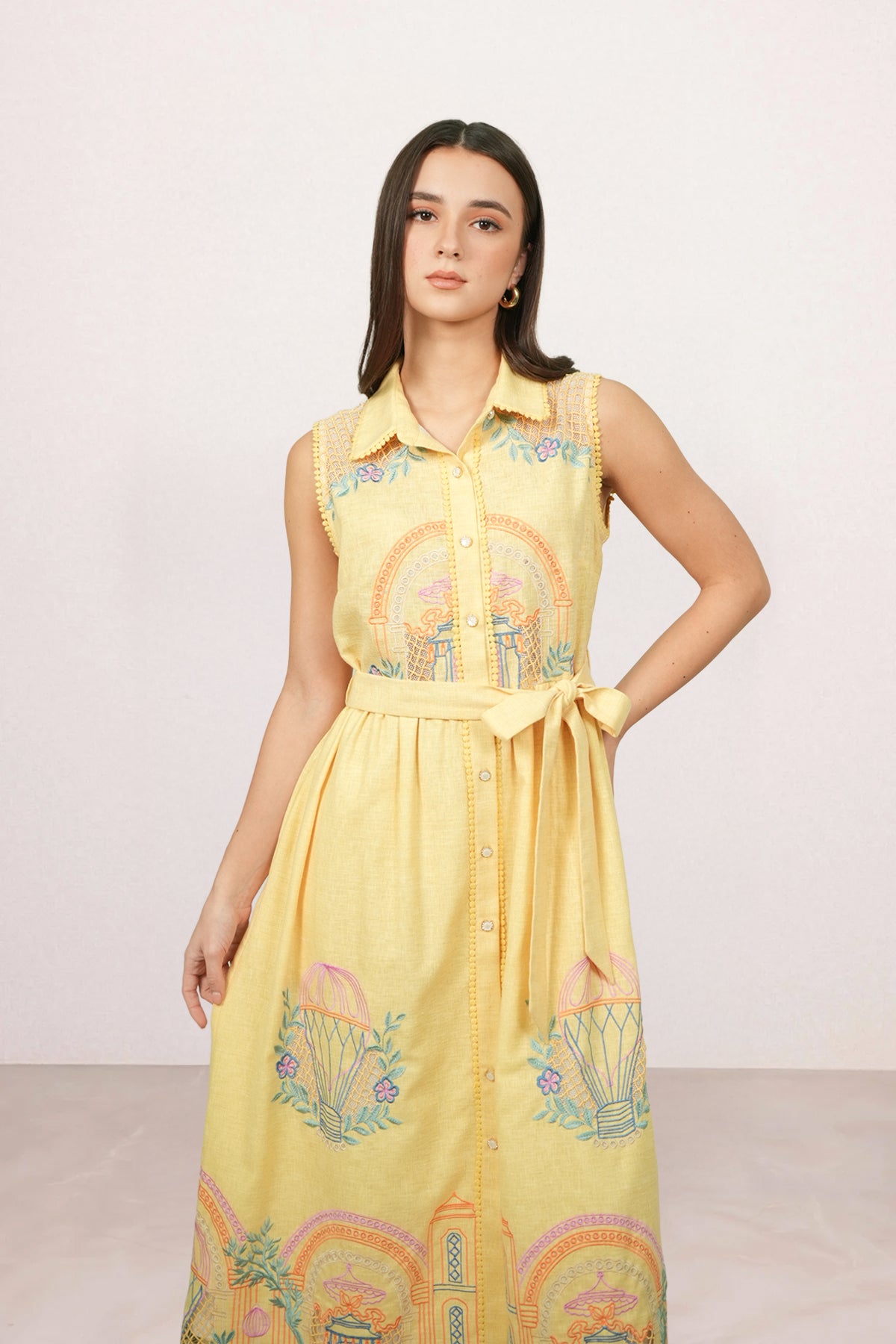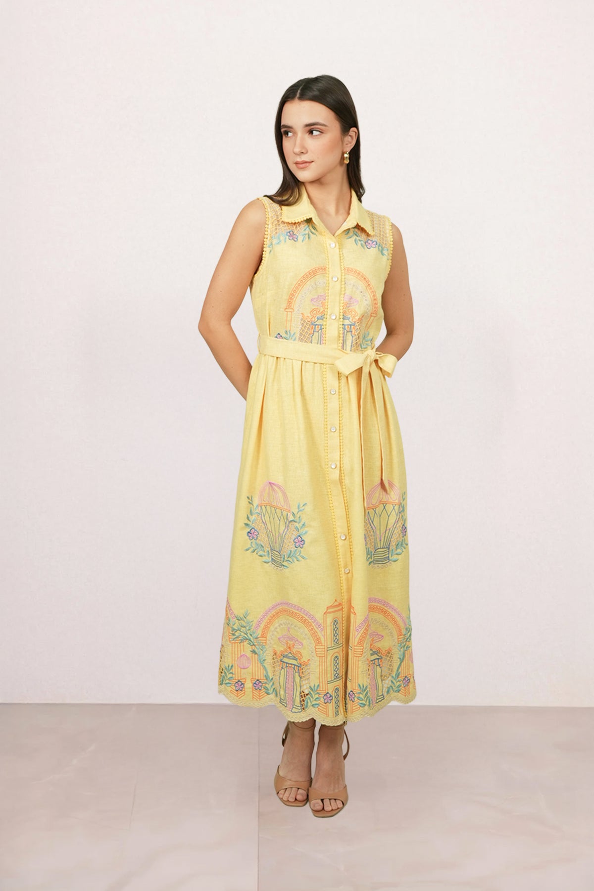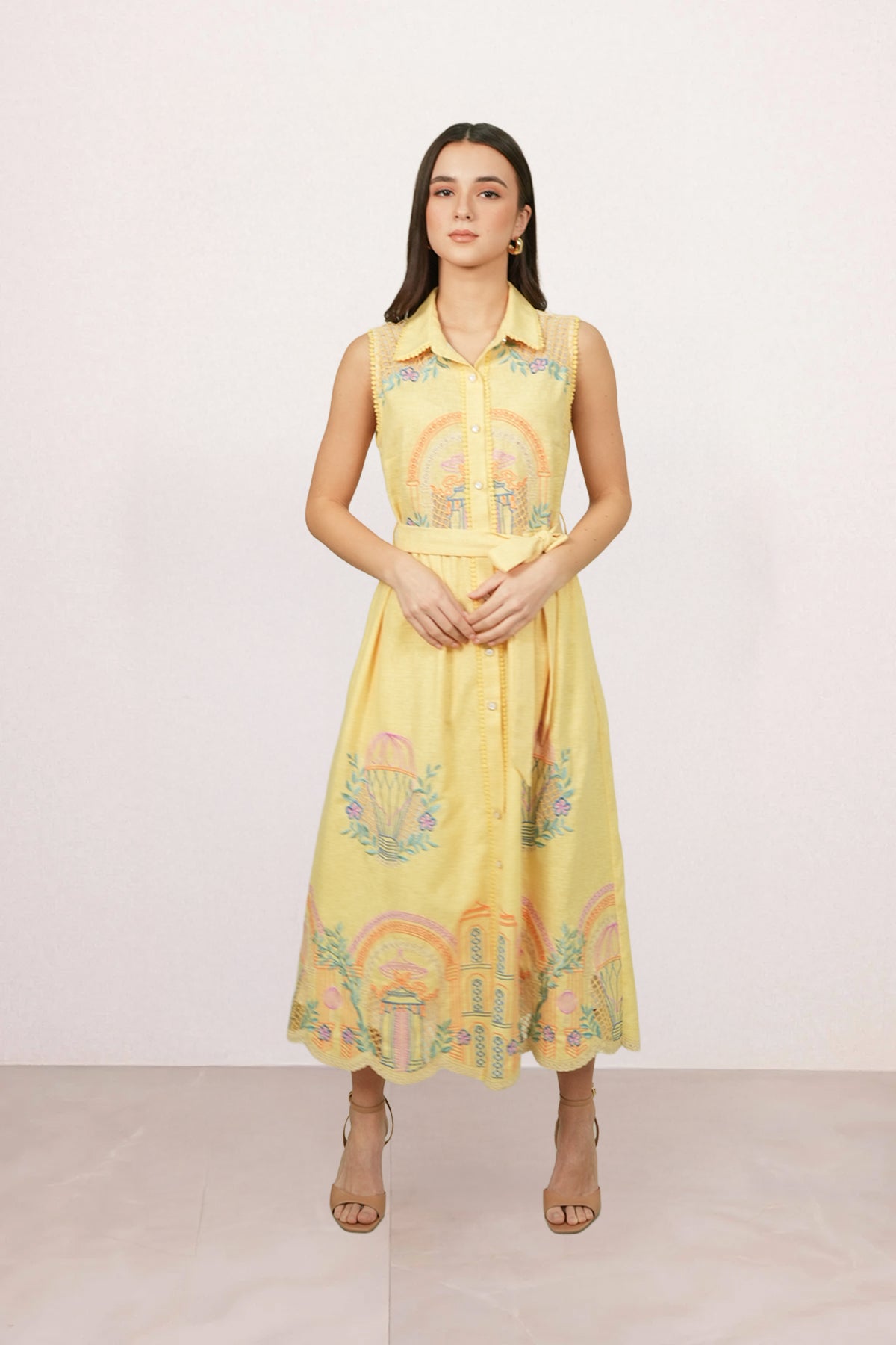 Built around clean lines and thoughtful placement, Ranna Gill's Maria Sleeveless Jumpsuit is crafted in breathable linen with a soft oatmeal base. The sleeveless silhouette features a structured shirt collar and front button placket, detailed with embroidered eyelet artwork forming arch motifs across the bodice and continuing along the hem. A fabric tie at the waist shapes the fit, while subtle front pleats add definition through the legs. Finished with functional side pockets and wide-leg construction, the piece balances detail with wearability.