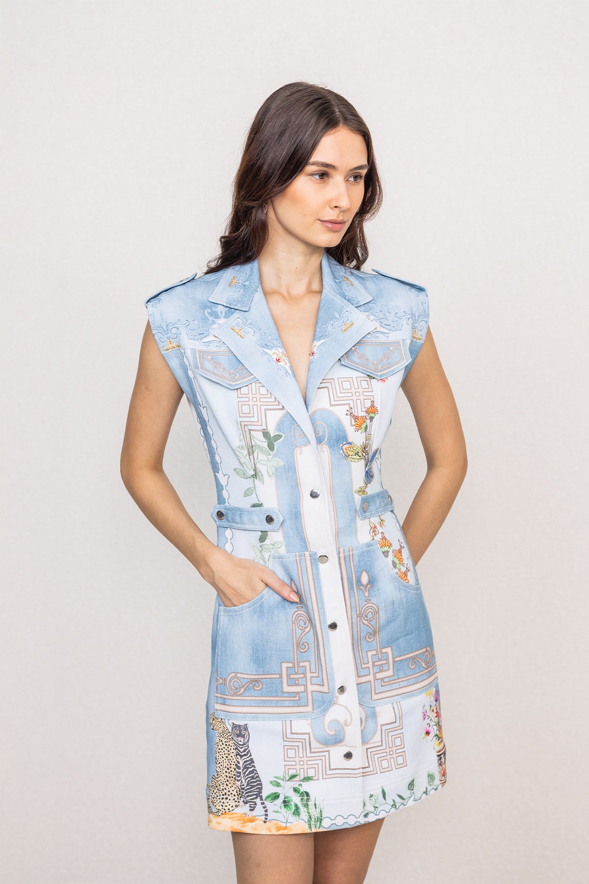 Sharp tailoring meets printed detail in this statement mini. The Koi Shirt Mini Dress is made in blue denim, featuring the Trellis print placed across panels for a structured, clean look. Designed sleeveless, it comes with a lapel collar neckline, front button closure, utility-style pockets, and a shaped waist that holds the fit firmly. The artwork combines floral and linear motifs printed directly onto the denim, making it a strong pick for getaways, city breaks, or long days on the move.
