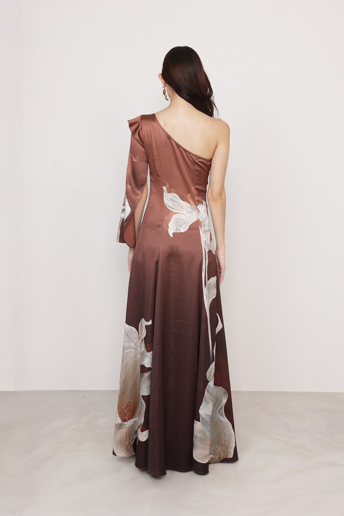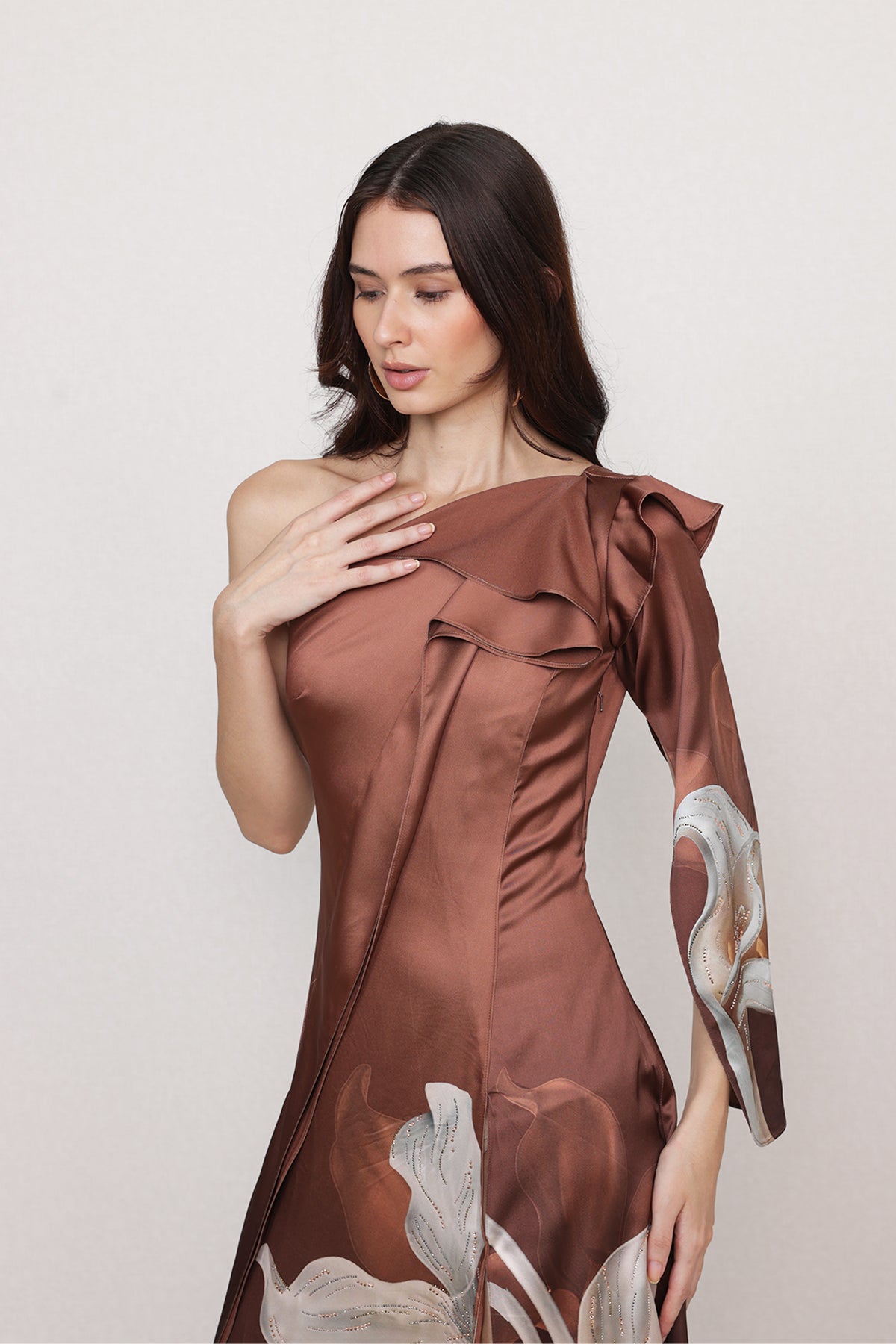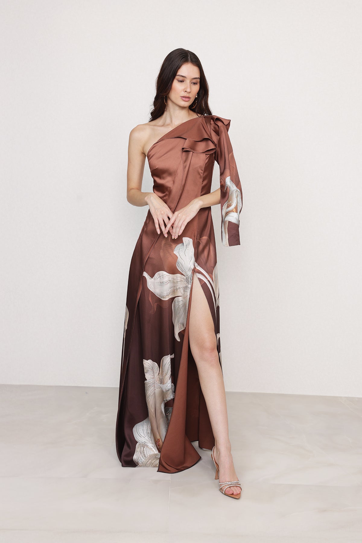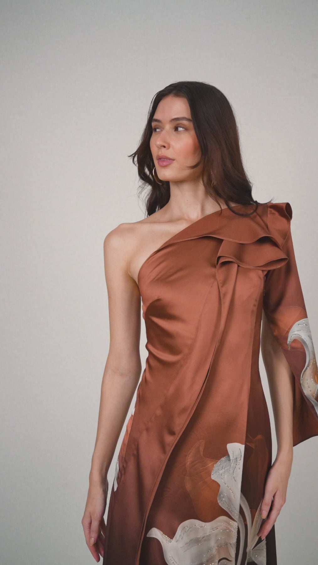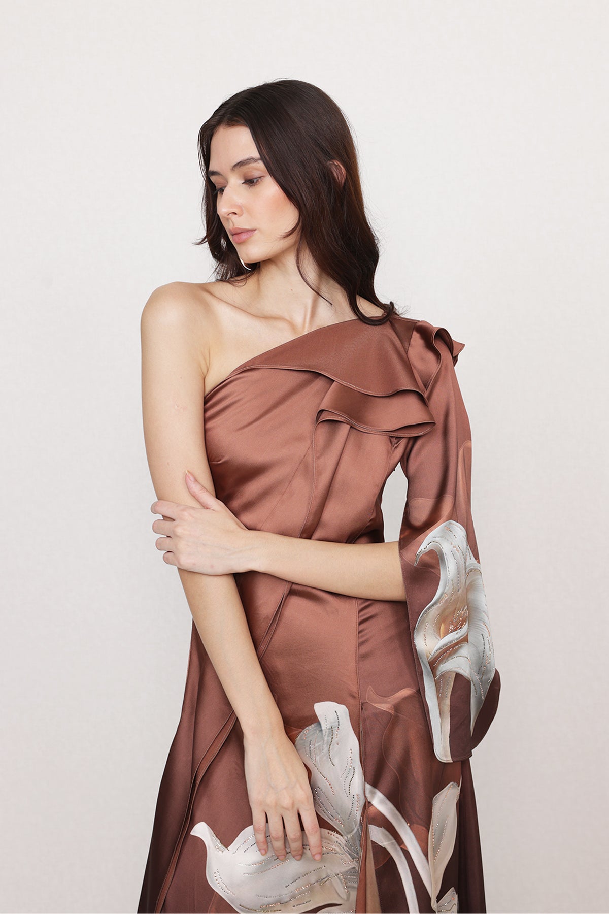 An entrance that lingers long after, Ranna Gill's Rustfall Drape Gown speaks in warm tones and fluid lines. Made in lustrous Poly Satin, this rust brown gown flows with a sculpted one-shoulder drape and soft ruffle detailing. The surface is traced with oversized floral prints that unfold along the length, adding contrast and character. A front slit brings definition to the silhouette, balancing grace with quiet confidence for evenings that call for presence.