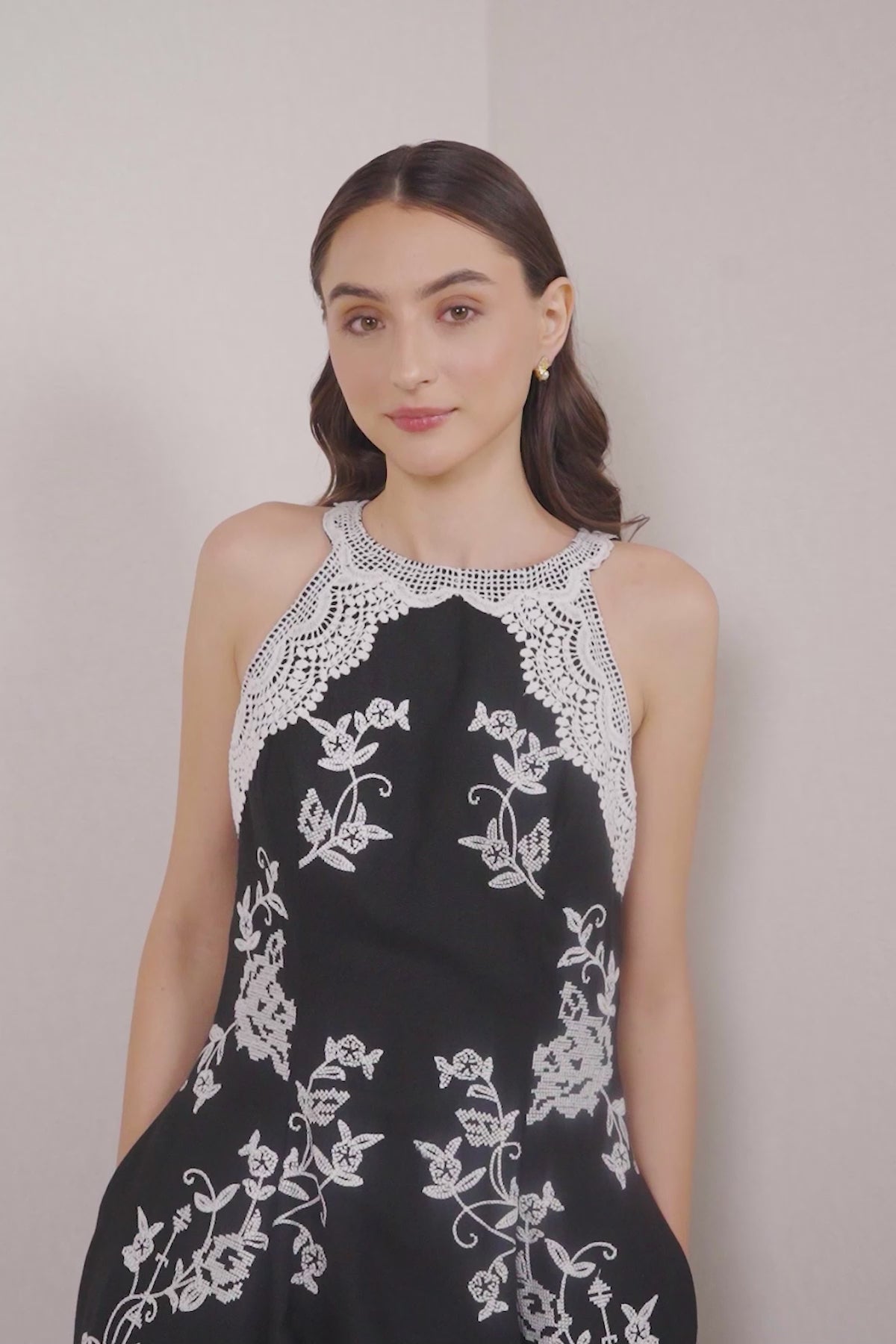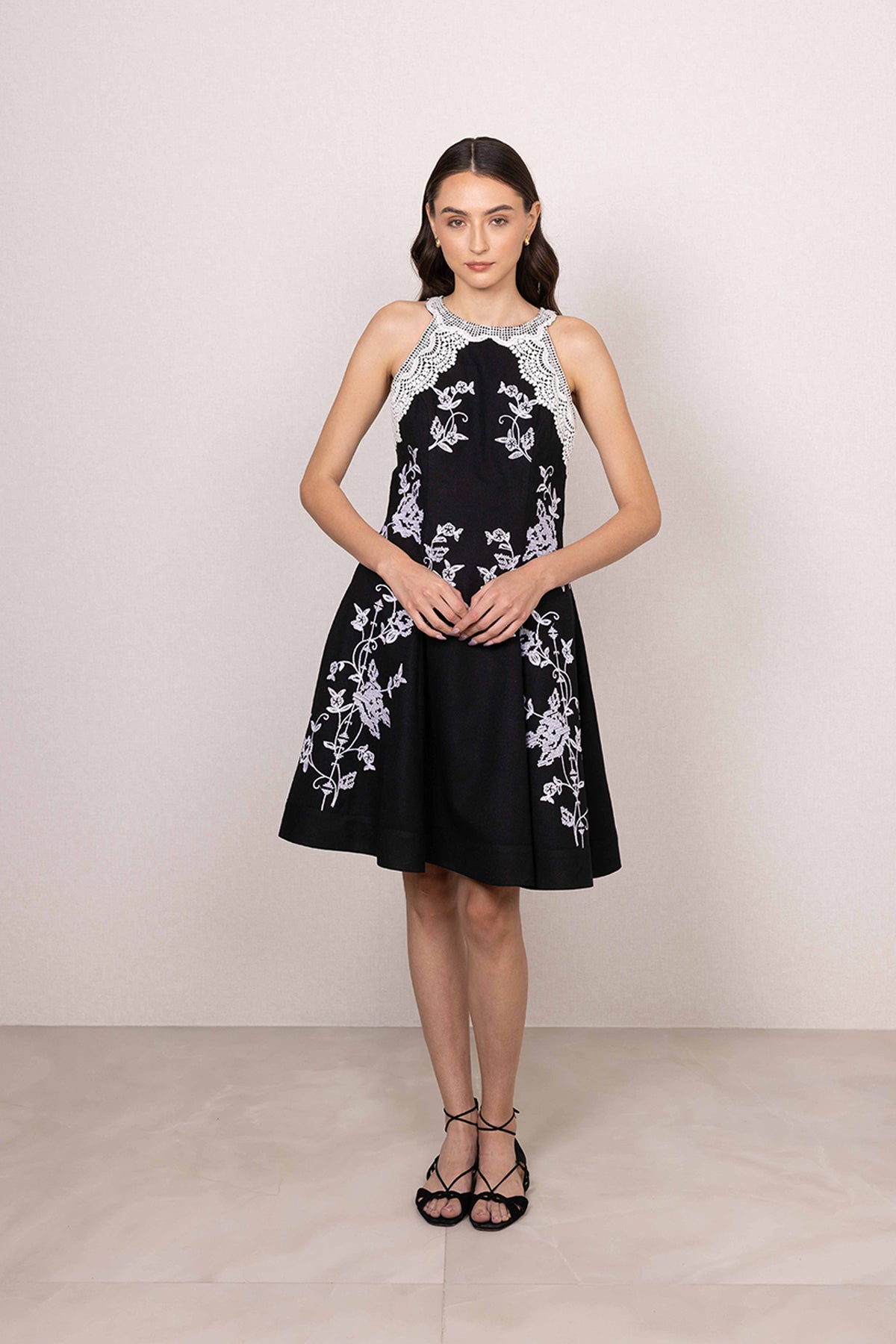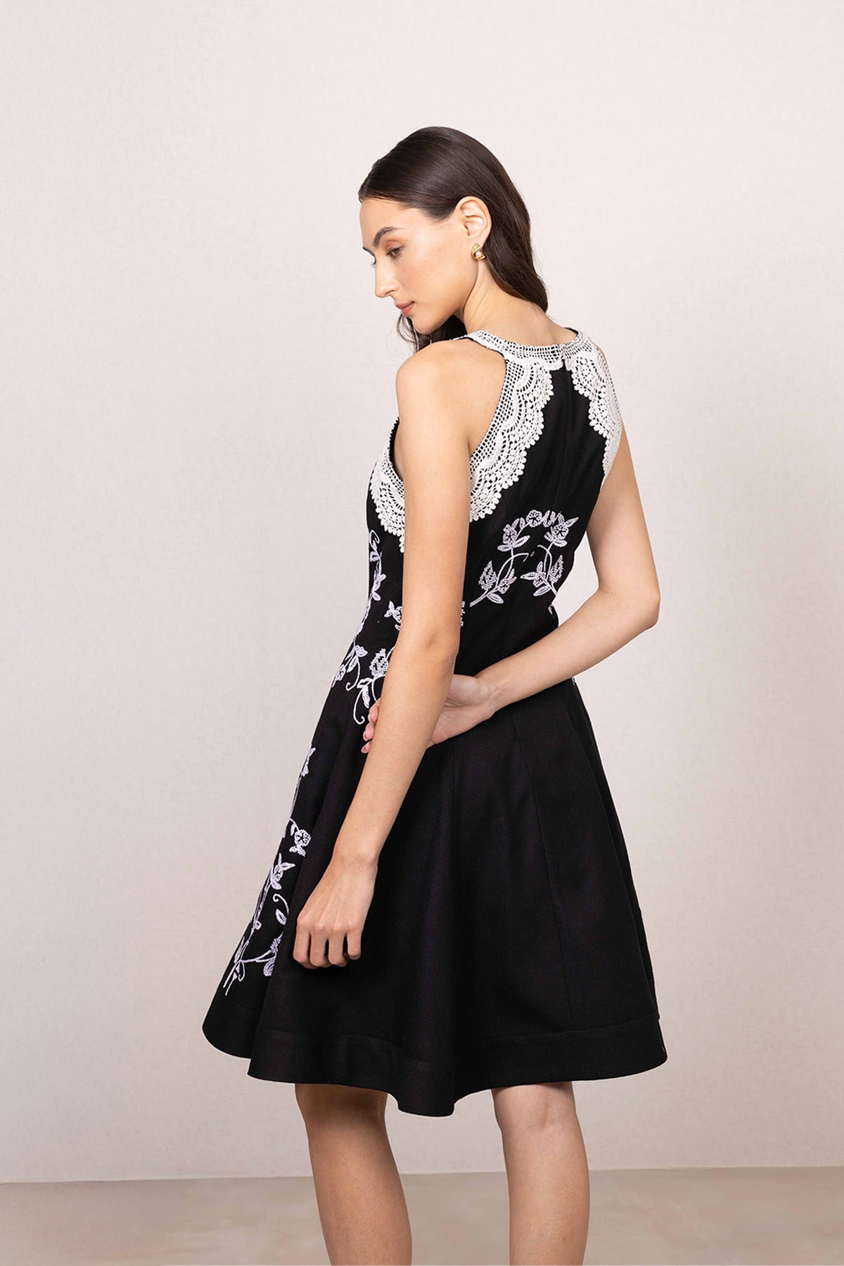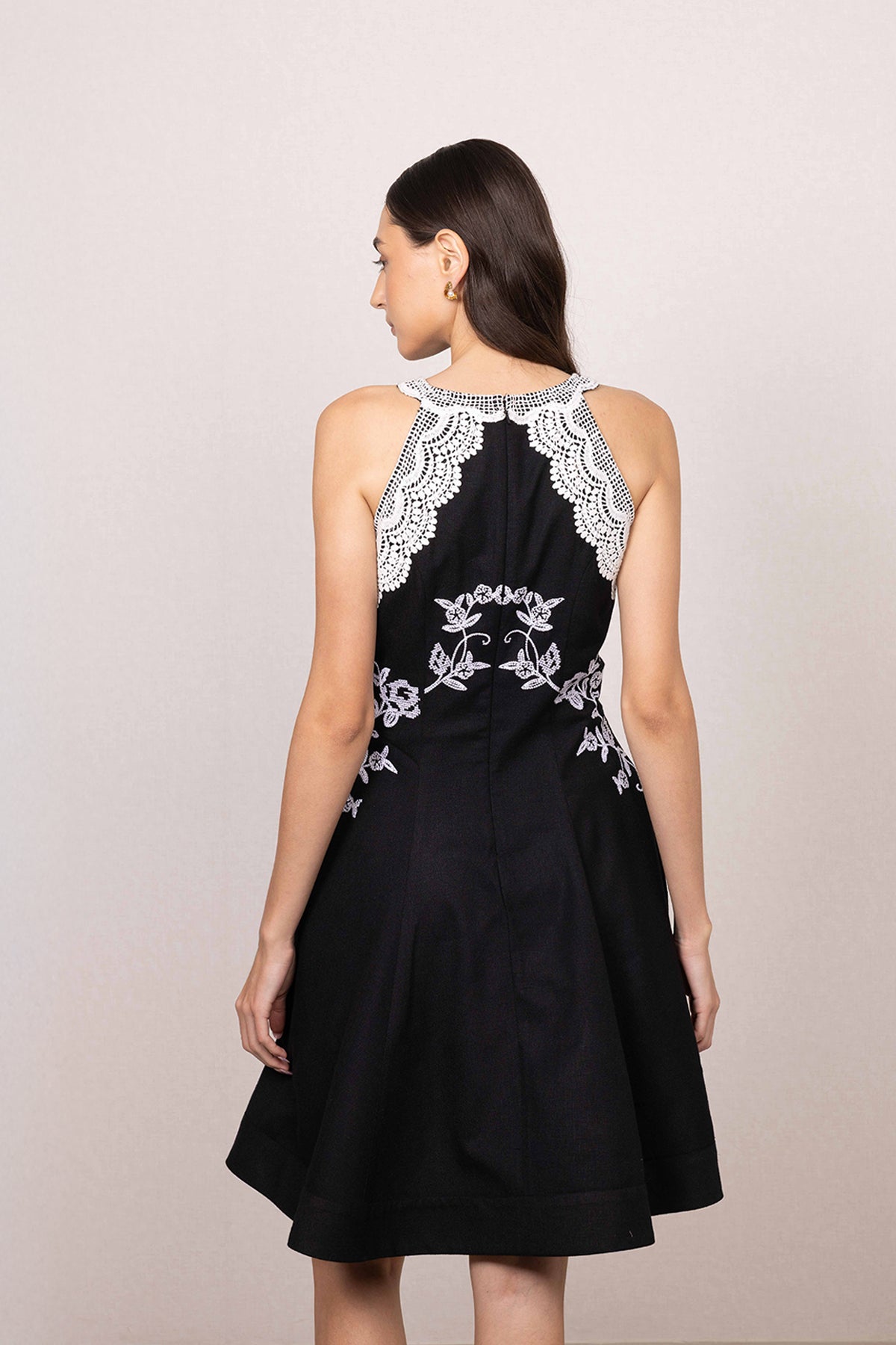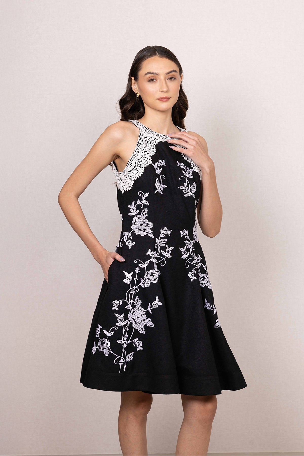 Ranna Gill's Zayel Halter Mini Dress in black is designed in breathable Poly Flex with a structured yet easy silhouette. The halter neckline frames the shoulders, while the mini length adds a modern, sharp look. Floral embroidery is placed along the front, adding subtle detail to the piece. Finished with a clean back closure, this dress is well-suited for day events and warm-weather occasions.