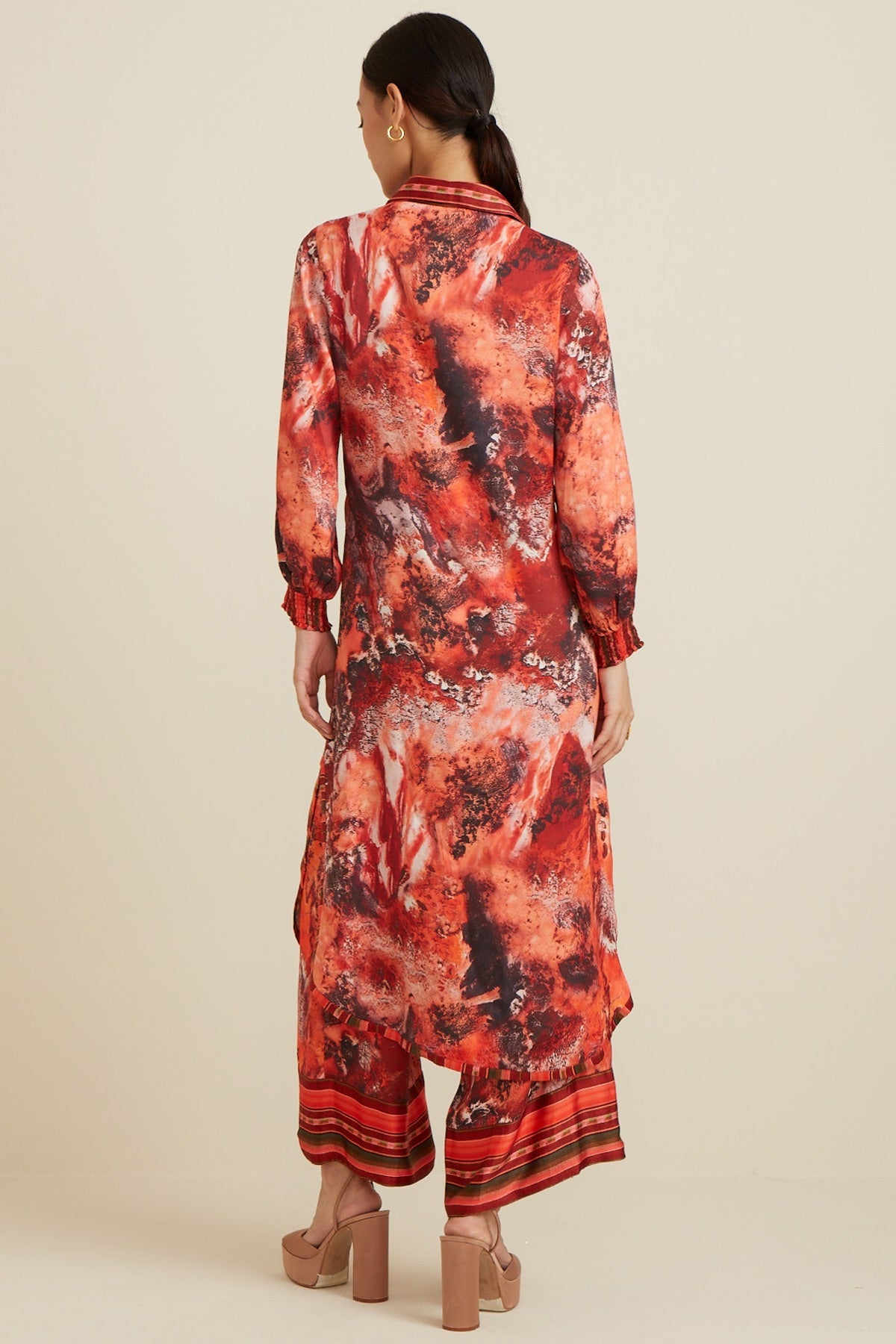 Made in cupro satin, this button down tunic is styled with Bishop sleeves and a round hemline. It is enhanced with bright and sunny hues of marble print. Wear it as it is or pair it with one of our slim fit pants to complete the look.
