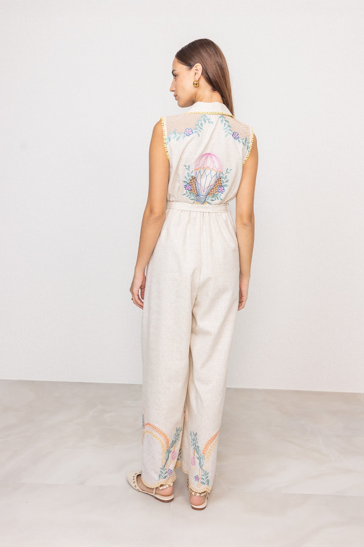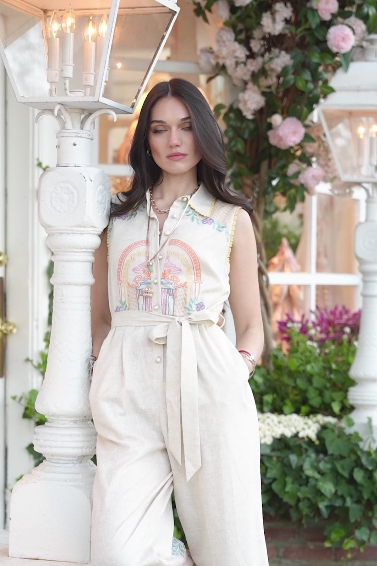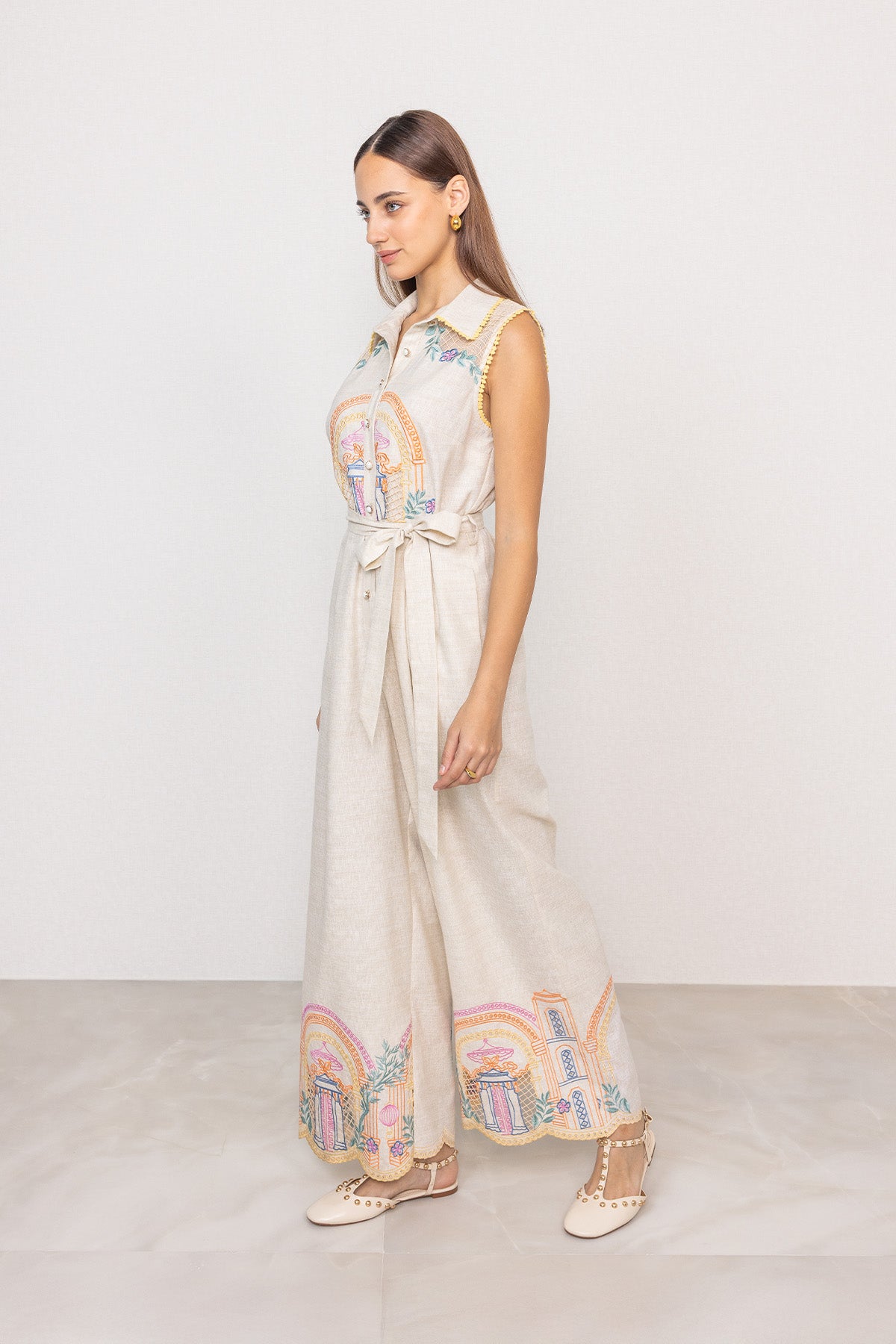 Built around clean lines and thoughtful placement, Ranna Gill's Maria Sleeveless Jumpsuit is crafted in breathable linen with a soft oatmeal base. The sleeveless silhouette features a structured shirt collar and front button placket, detailed with embroidered eyelet artwork forming arch motifs across the bodice and continuing along the hem. A fabric tie at the waist shapes the fit, while subtle front pleats add definition through the legs. Finished with functional side pockets and wide-leg construction, the piece balances detail with wearability.