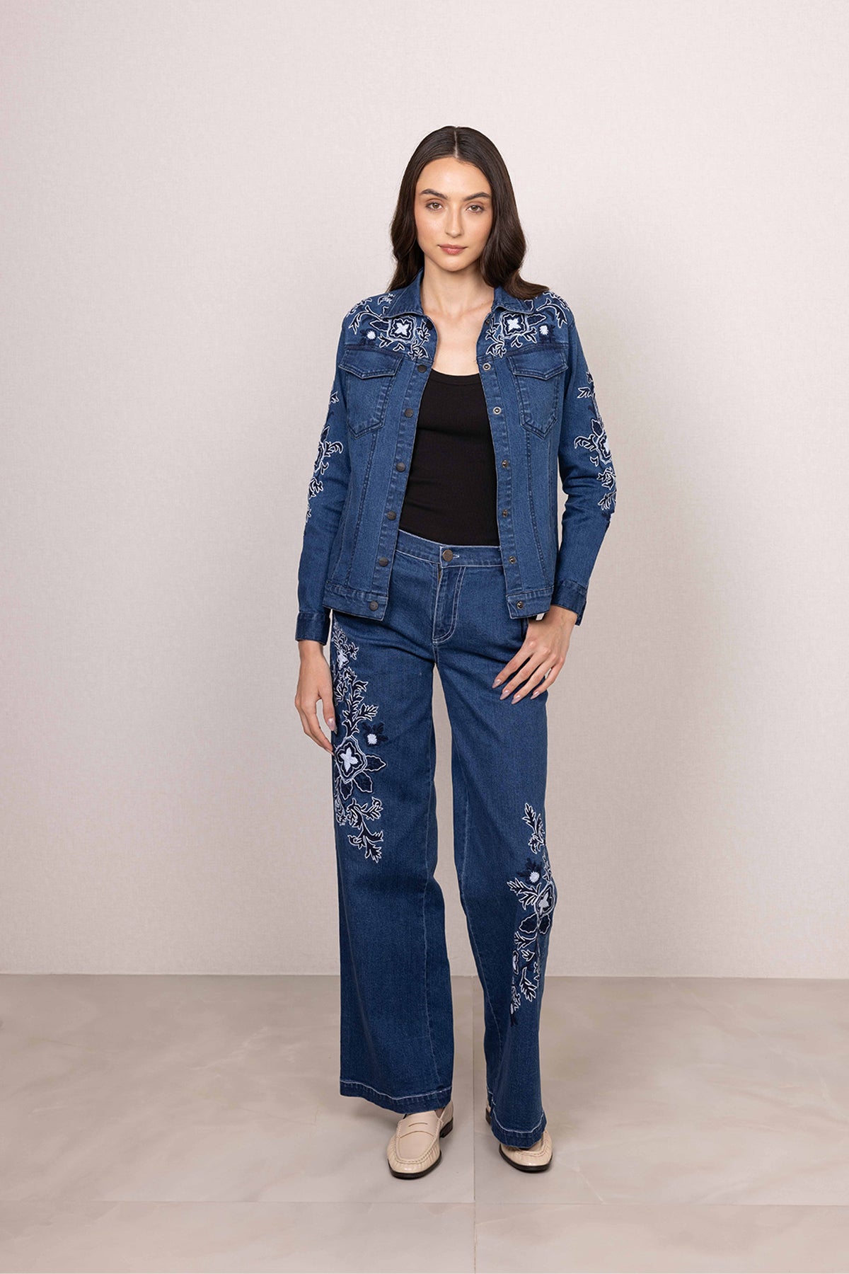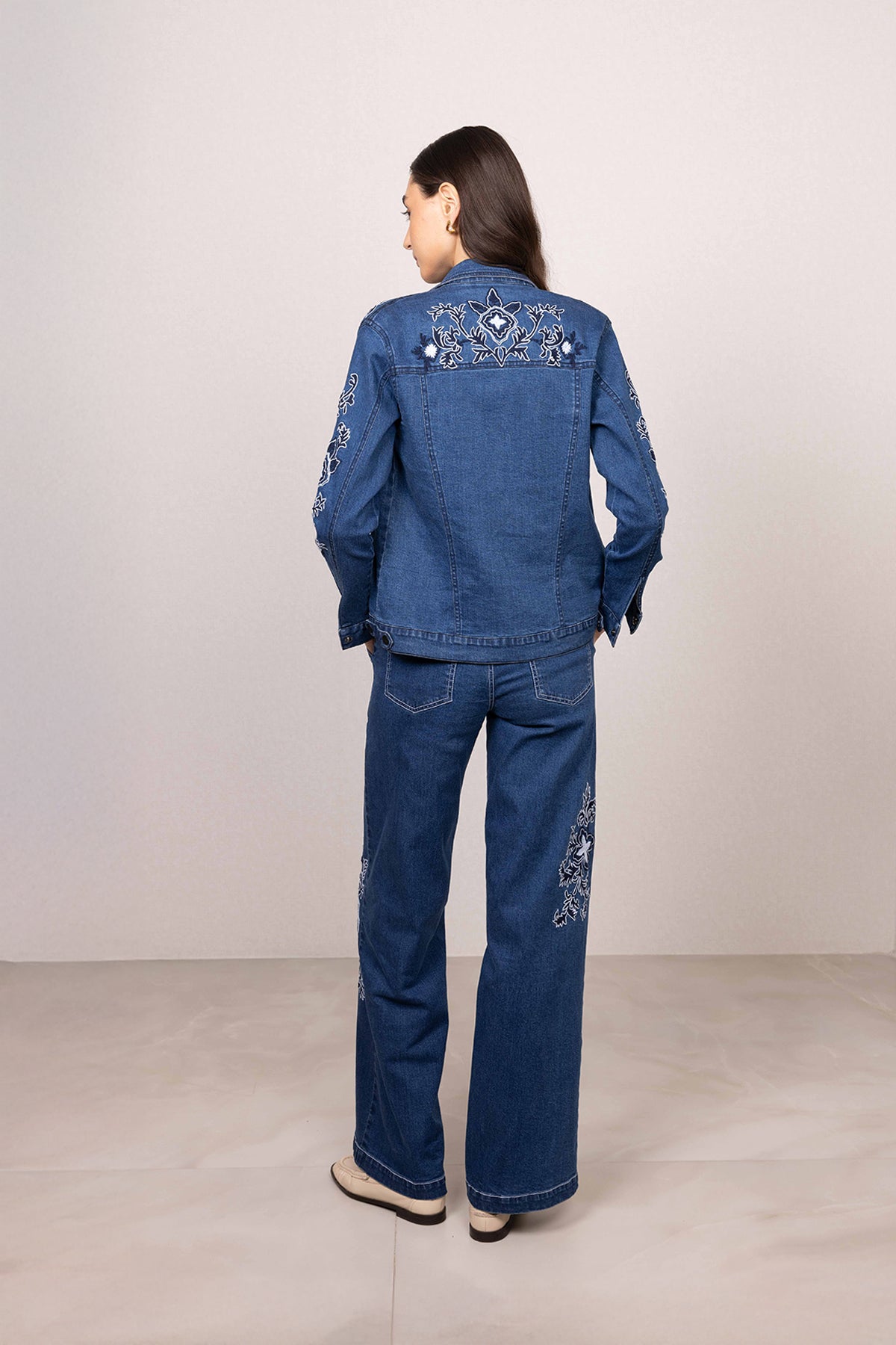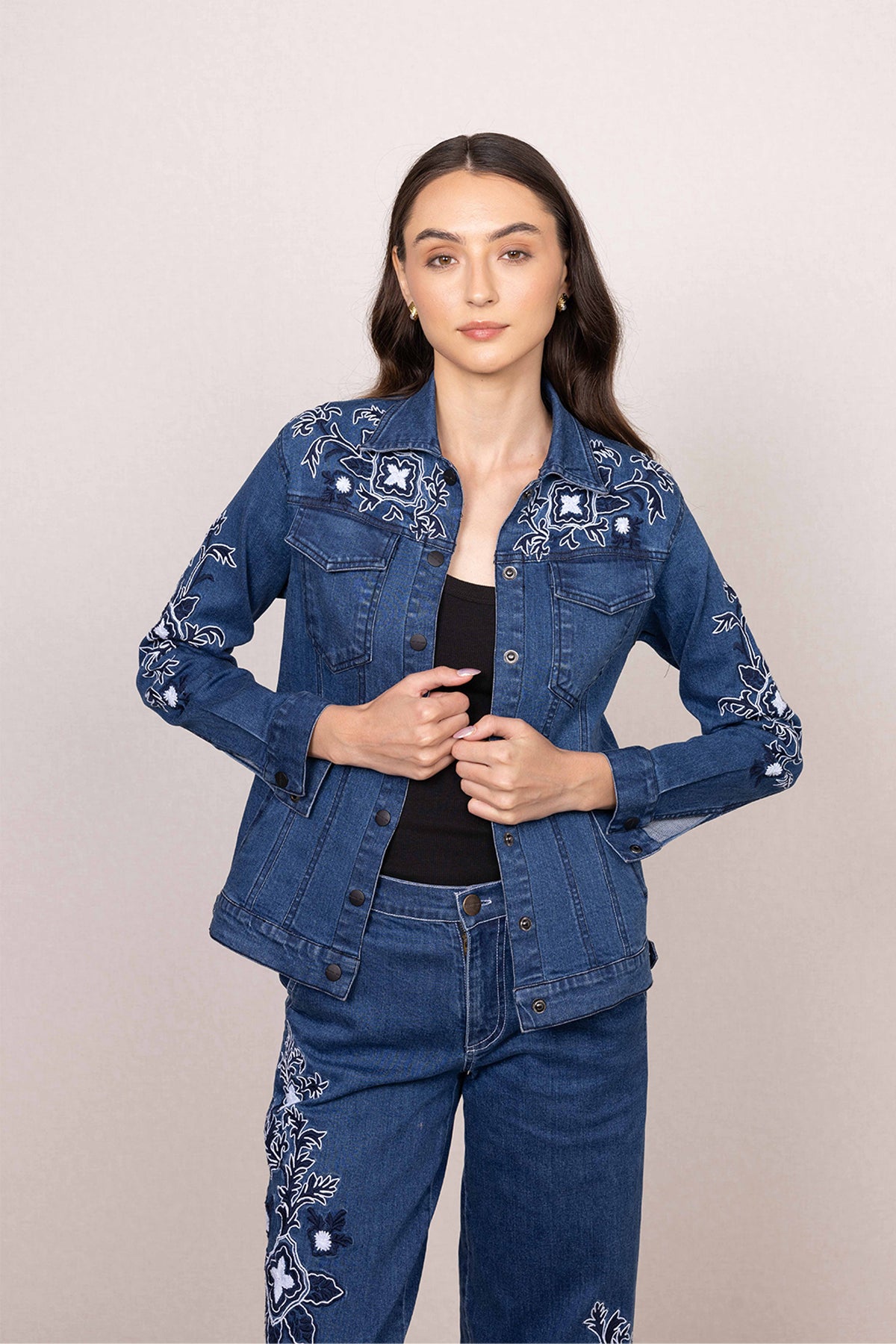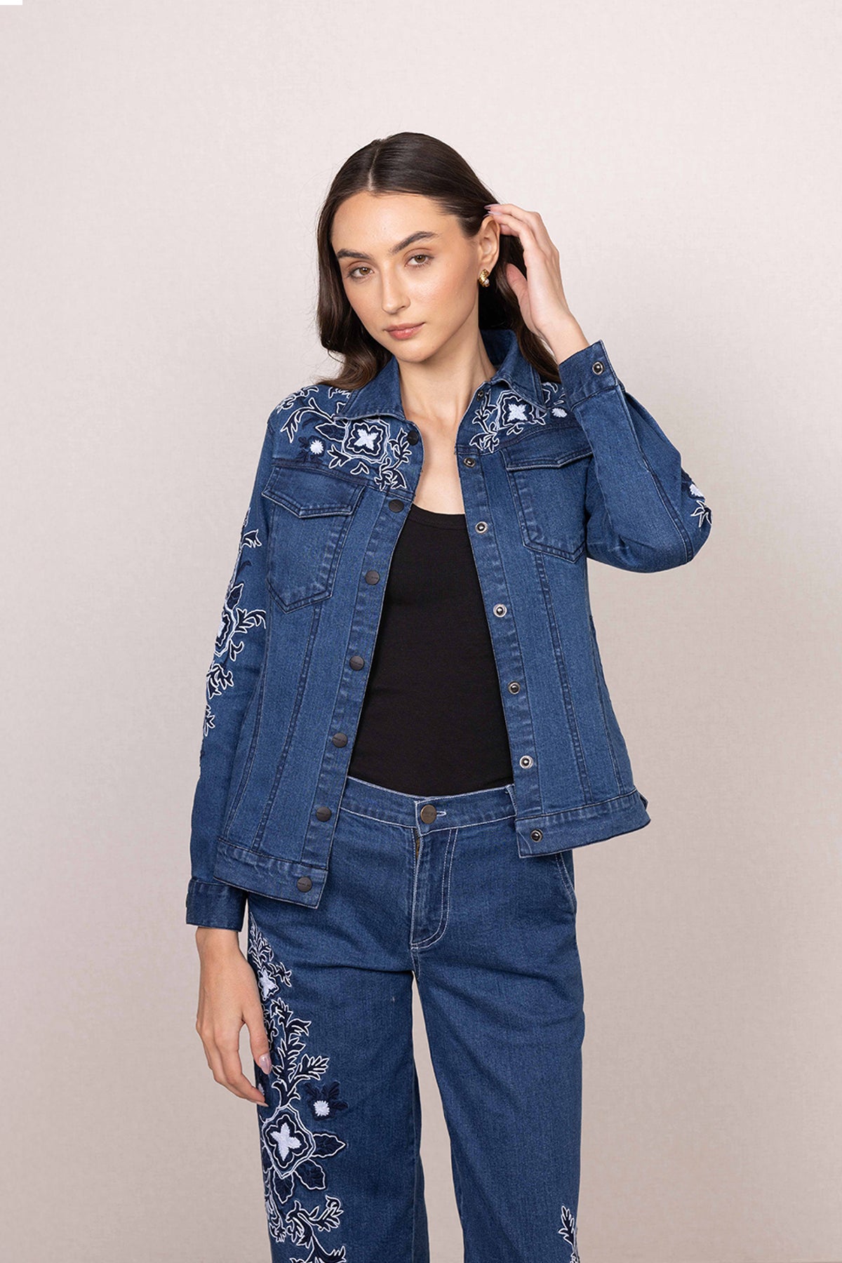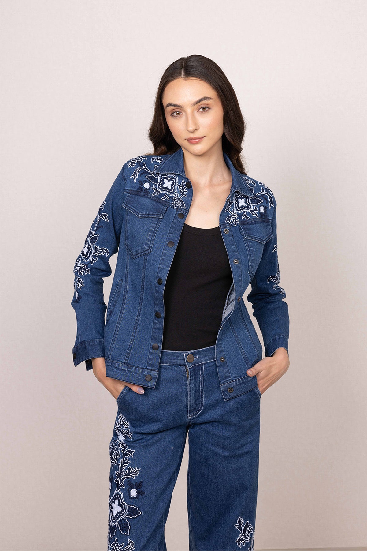 Ranna Gill's Velin Panel Jacket is made in durable denim, offering a structured fit with everyday comfort. Designed in a deep blue shade, this jacket features panelled construction that enhances its shape while adding a clean, defined look. Intricate floral embroidery is placed across the yoke, sleeves, and body, bringing in detailed texture and contrast against the denim base. Finished with a classic front button closure, flap pockets, and full-length sleeves, this Jacket pairs seamlessly with both coordinated sets and casual separates.