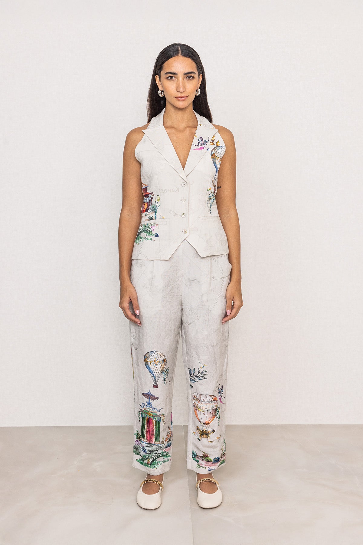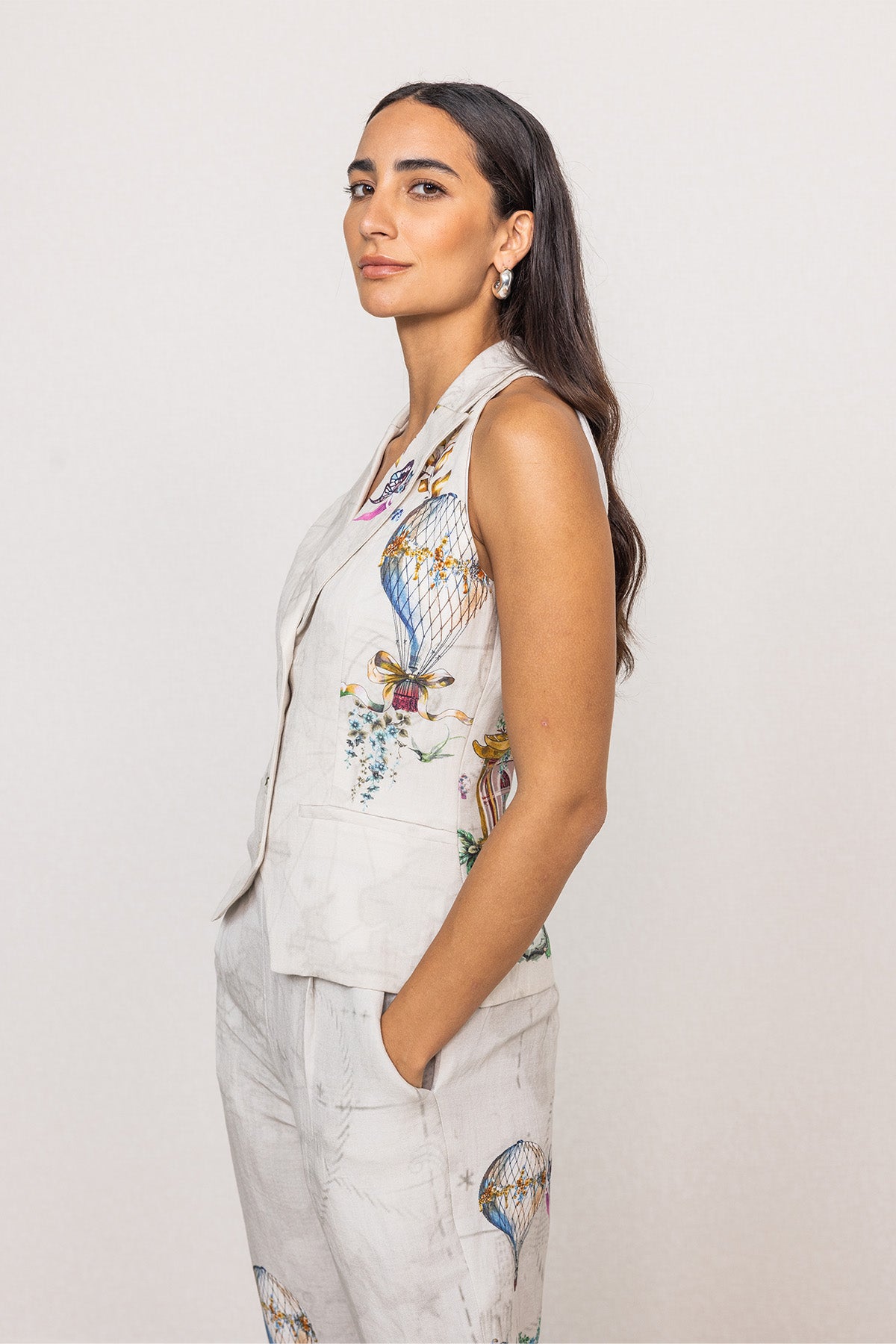 Introducing the Kea Halter Waist Coat, where tailored structure is brought to life through thoughtful detailing and print. Set on a soft grey base, the Cappadocia print appears like illustrated panels, unfolding gently across the front and sides. Made in linen viscose, this sleeveless design features a halter neckline with sharp lapels and a clean V-front finished with button detailing. Pair it with Ranna Gill's Lyra Rara Pant for a complete look.
