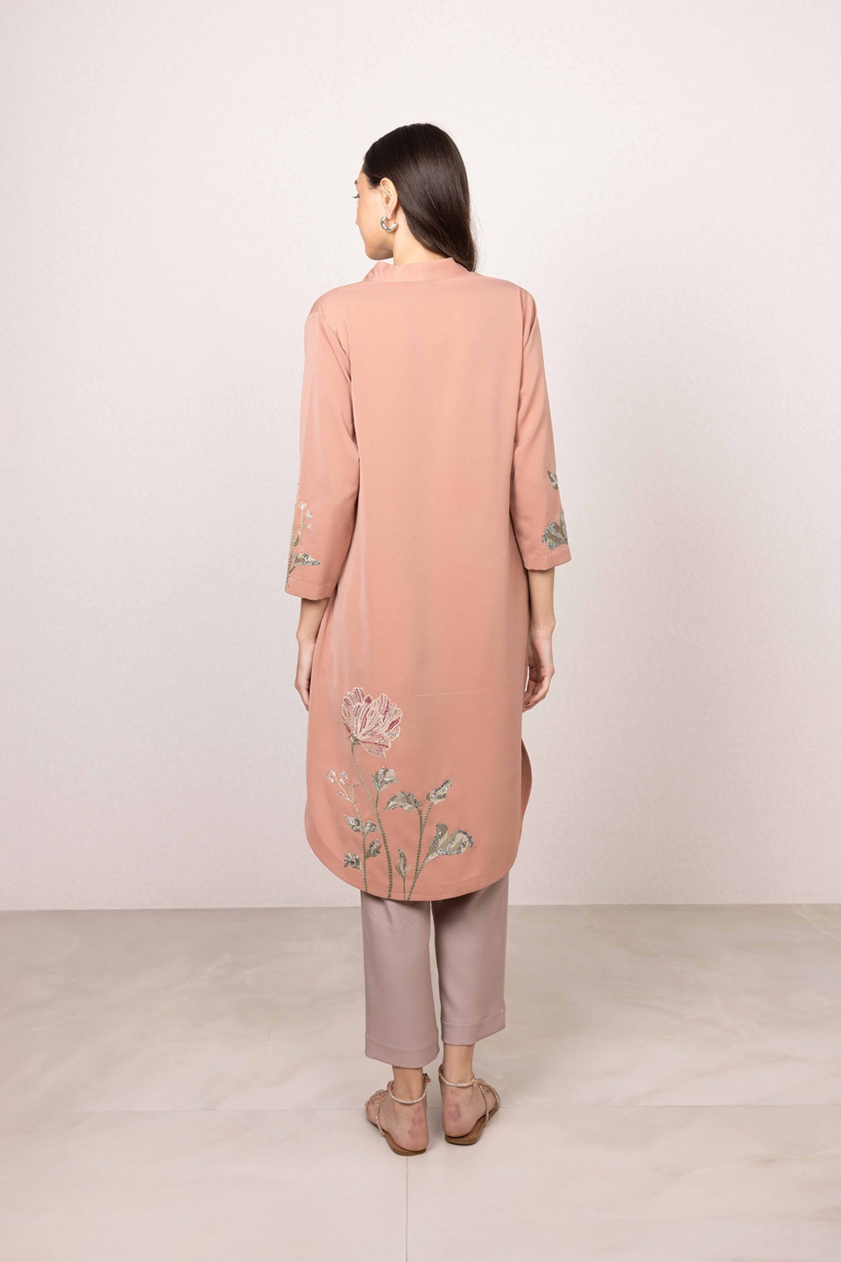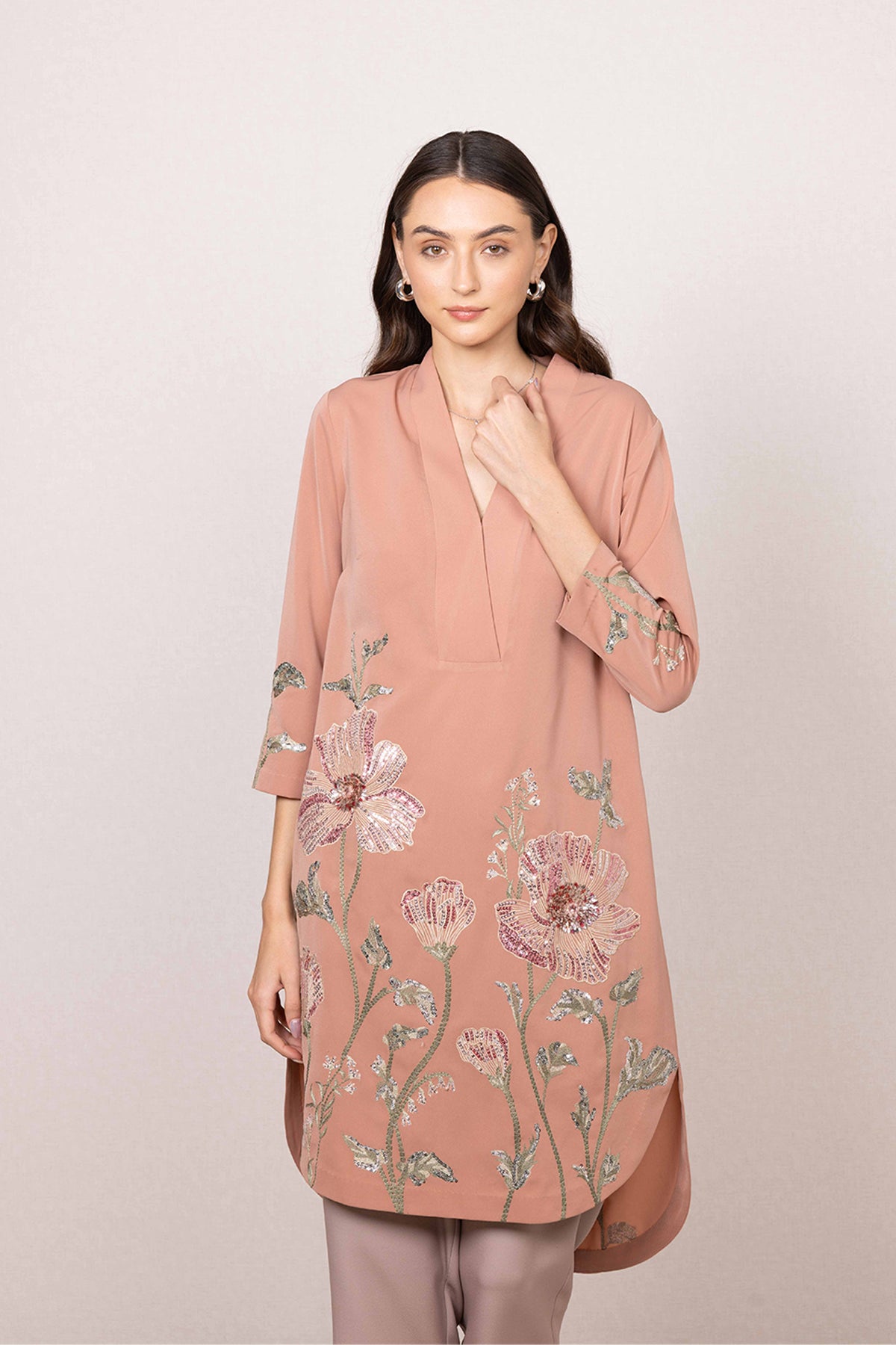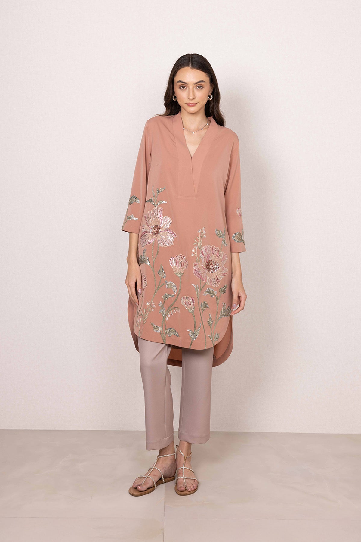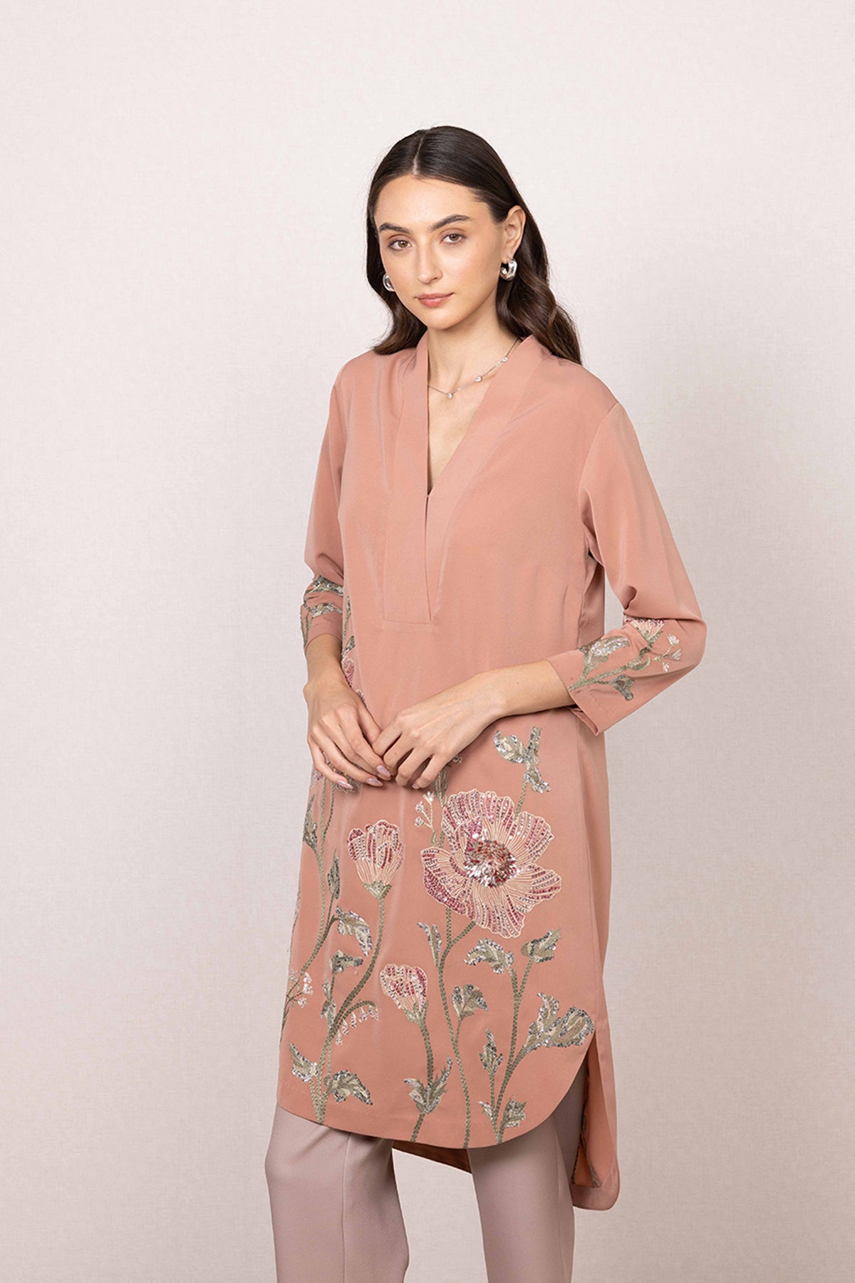 Featuring Ranna Gill's Maris Tunic, bringing a calm yet elevated feel to everyday dressing. Set in a peach base, the tunic is highlighted with floral prints across the sleeves and lower panel.
