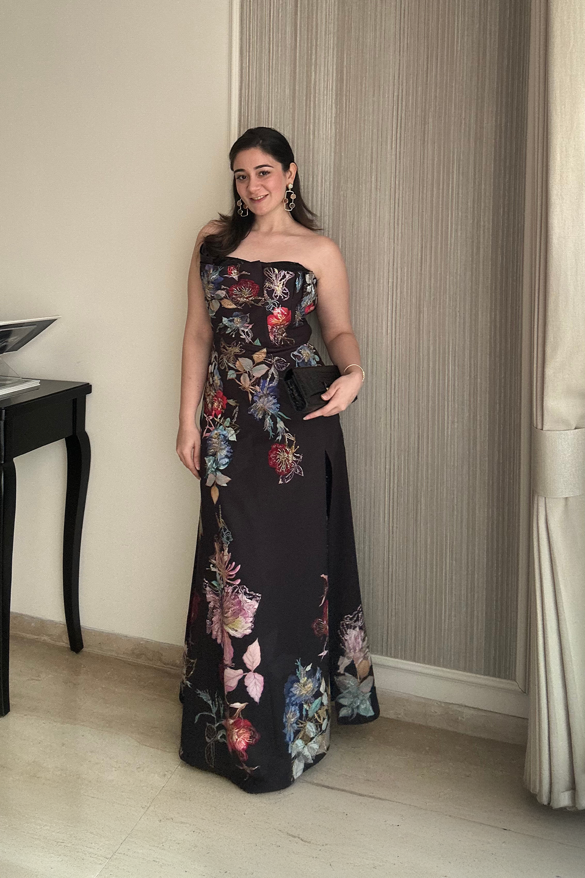 A striking silhouette that commands attention, Ranna Gill's Sera Gown in deep black is cut from fluid Viscose Jacquard and features a sculpted strapless neckline with subtle ruffle detailing. The floral print blooms in vivid hues like punchy reds, soft pinks, and flashes of blue—spilling across the body like a painted garden at midnight. The thigh-high slit reveals an inset of tonal sequin embroidery that catches the light with every step.
