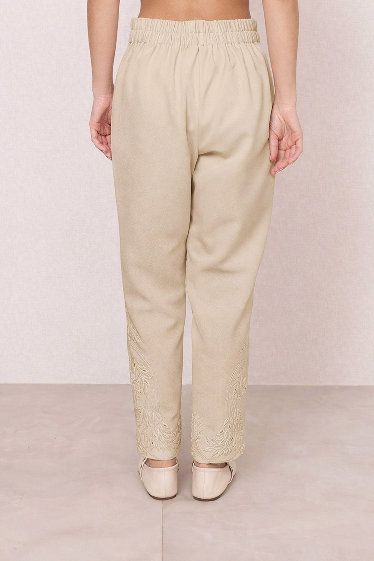 Warm neutrals take centre stage in the Alina Lace Pants, made for relaxed days with a dressed-up feel. This high-waisted pair features sheer lace panels along the sides and embroidered motifs near the hem. The straight silhouette keeps the look clean, while the soft waistband adds everyday comfort.
