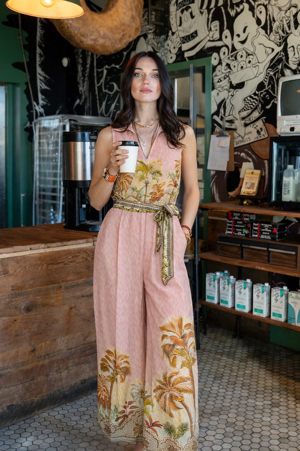 Introducing the Ariel Jumpsuit, crafted in linen viscose and brought alive with the Costa Rica print, blending layered palm artwork and intricate border placements across a multi-color base. Designed with a V-neckline, sleeveless and a tie-up belt that defines the waist just right. The wide-leg fall with subtle front pleats creates a fluid, flattering fit that feels light on the body. Finished with detailed artwork running along the hem, this jumpsuit is made for days that call for comfort with presence.