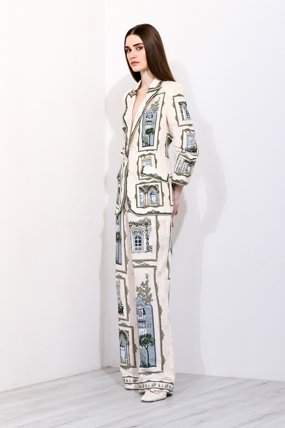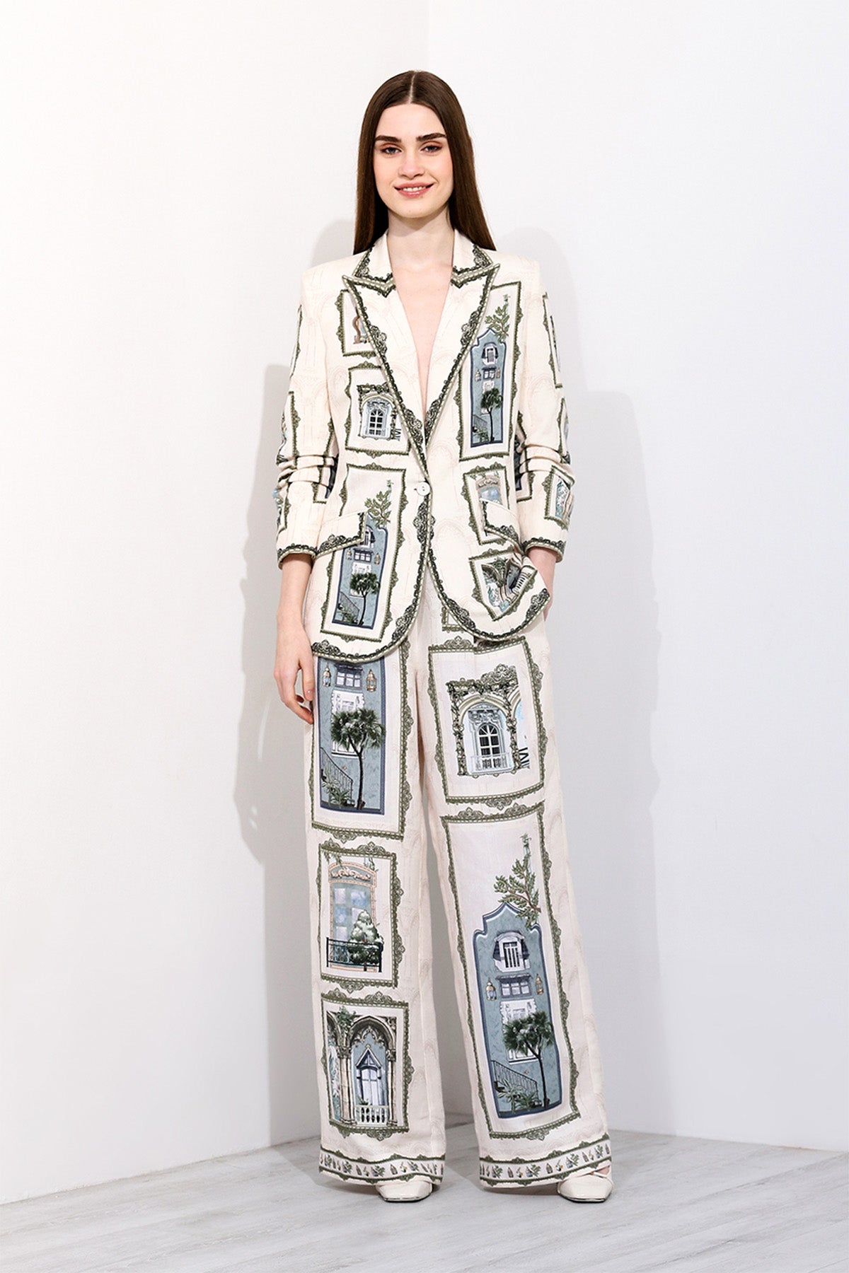 Enhance your style with the Avena Co-ord Set by Ranna Gill. Crafted from high-quality linen blend fabric, these pants feature the mesmerizing "Windows of the World" print. The set is tailored fit provide a sophisticated silhouette that suits both casual and formal occasions. Balanced with a neutral base, this statement piece is perfect for any wardrobe.
