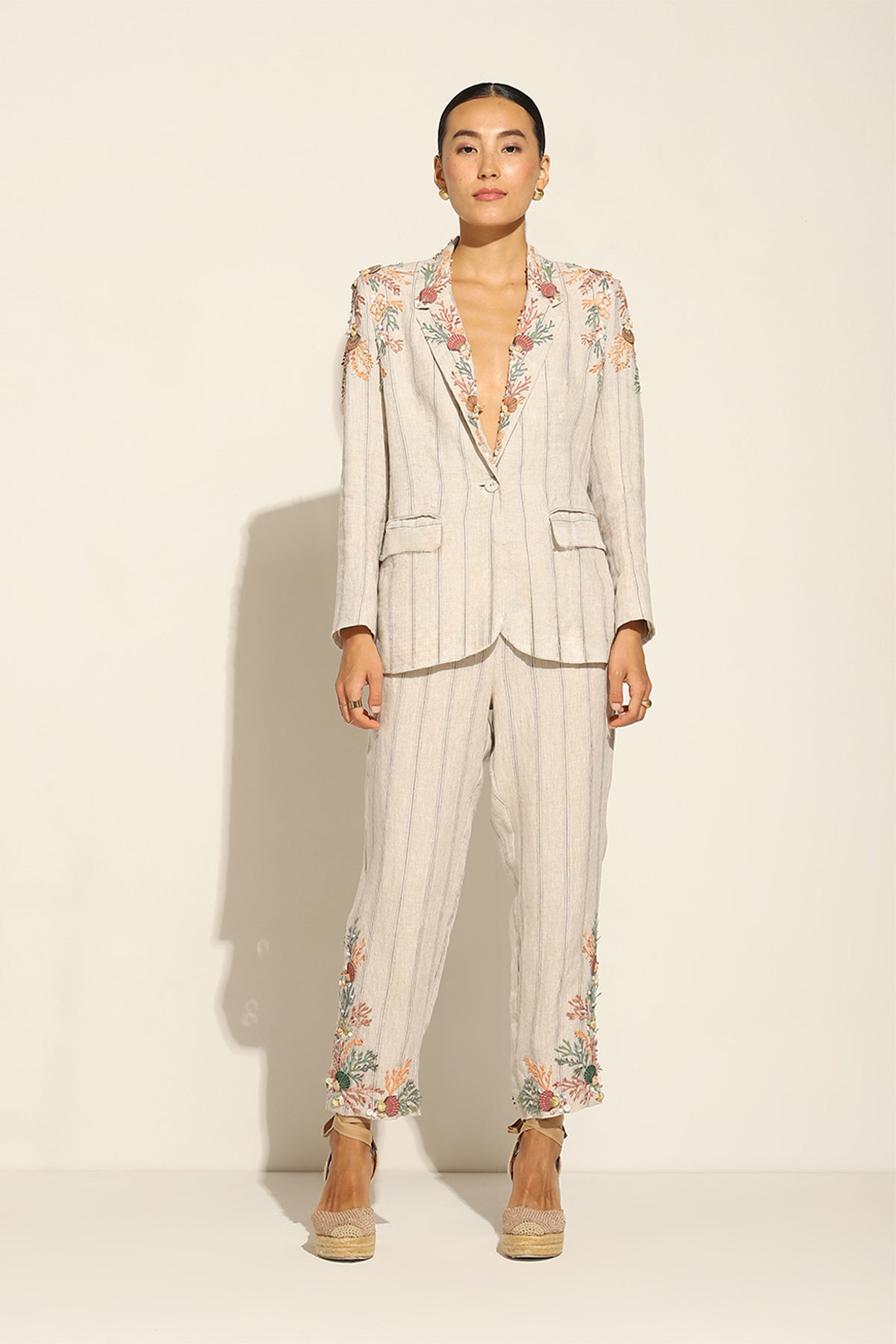 Introducing the Cleo Jacket, adorned with Signature Coral Reef Embroidery for a touch of coastal chic. This jacket effortlessly combines style and sophistication, making it a versatile and statement-worthy piece for a polished yet playful look in any setting.