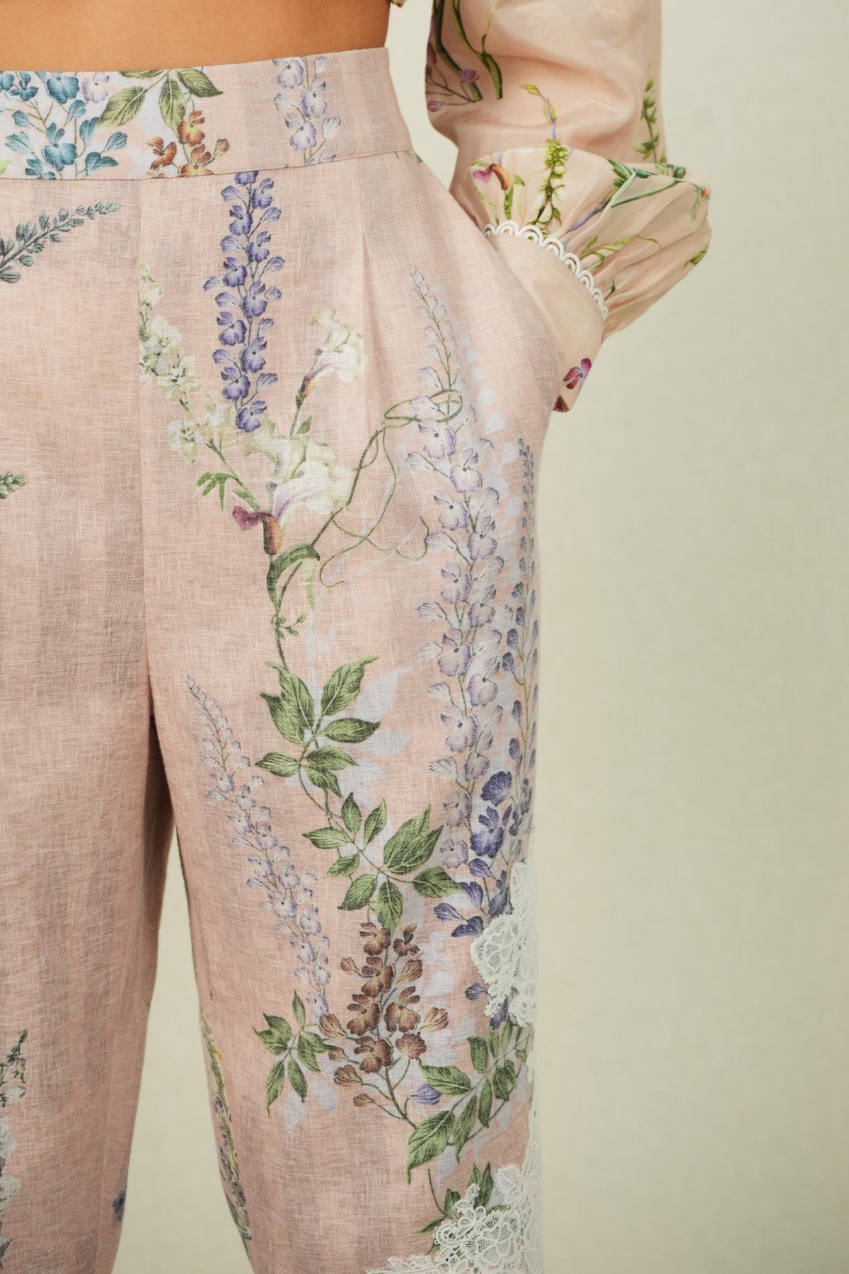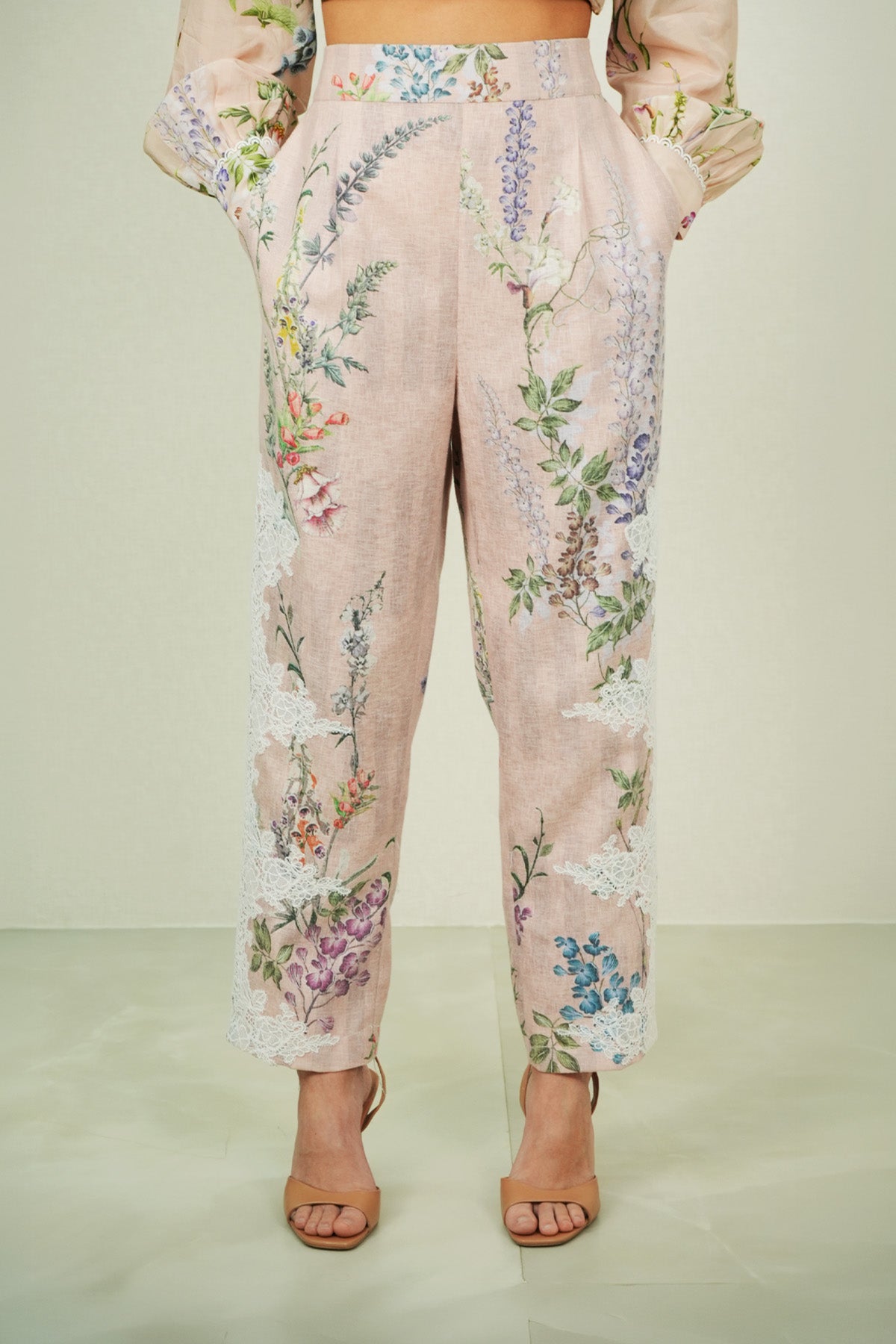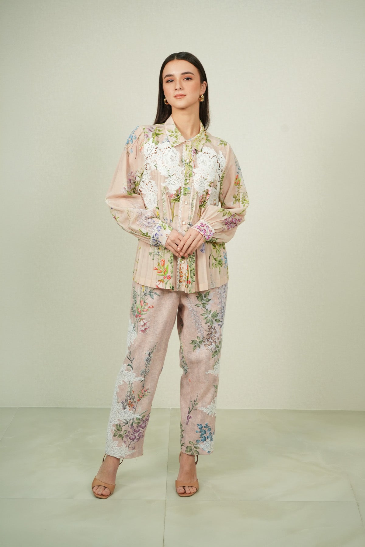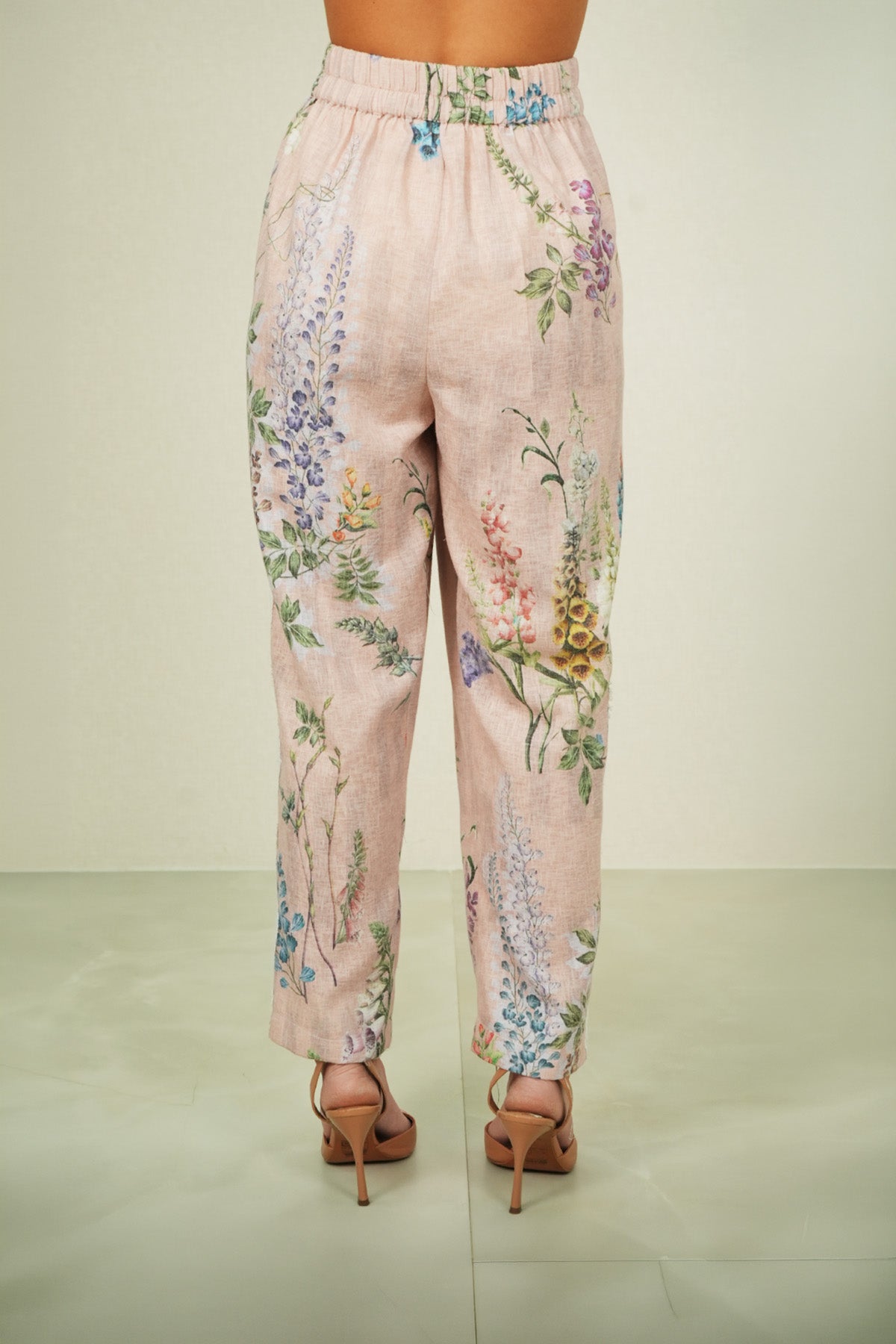 Structure takes focus in the Elsa Rara Pant, crafted in poly flex and finished in a multi-colour palette with the Visteria print running across the length. The pant features a clean waistband with a flat front, falling into a straight silhouette that sits neatly on the frame. Detailed with side pockets and a tailored ankle-length cut, this style pairs seamlessly with Ranna Gill's Bloomlet Pleated Shirt for polished daytime dressing.
