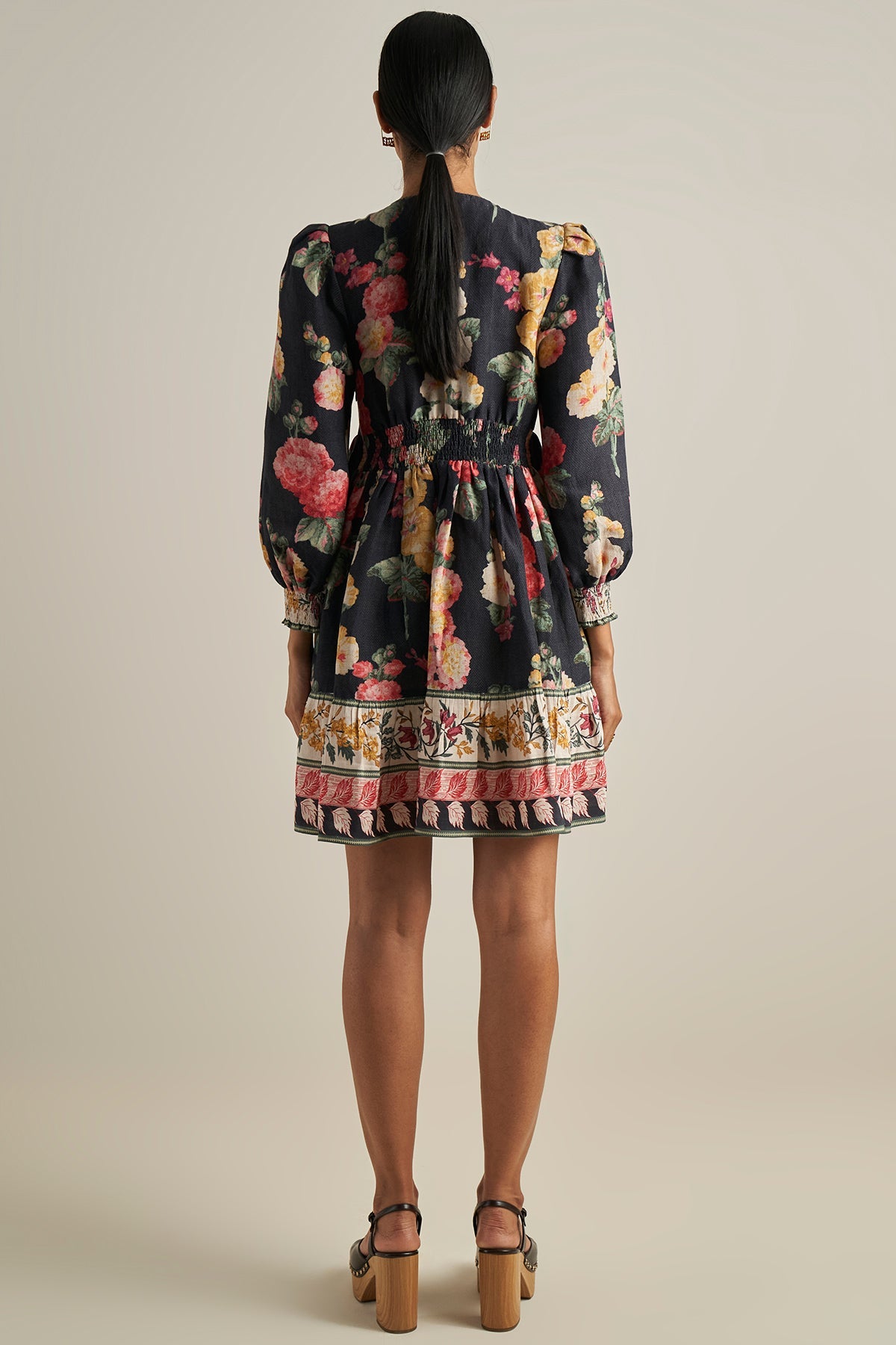 Made in linen blend, this is a dress that will take you from day to night with ease and panache. Styled with V neckline and a U shaped metallic accent, the dress flares to touch the legs just above the knees. Our signature floral print of Hollyhocks gives this dress a charming appeal. Pair it with minimal accessories to complete the ensemble.