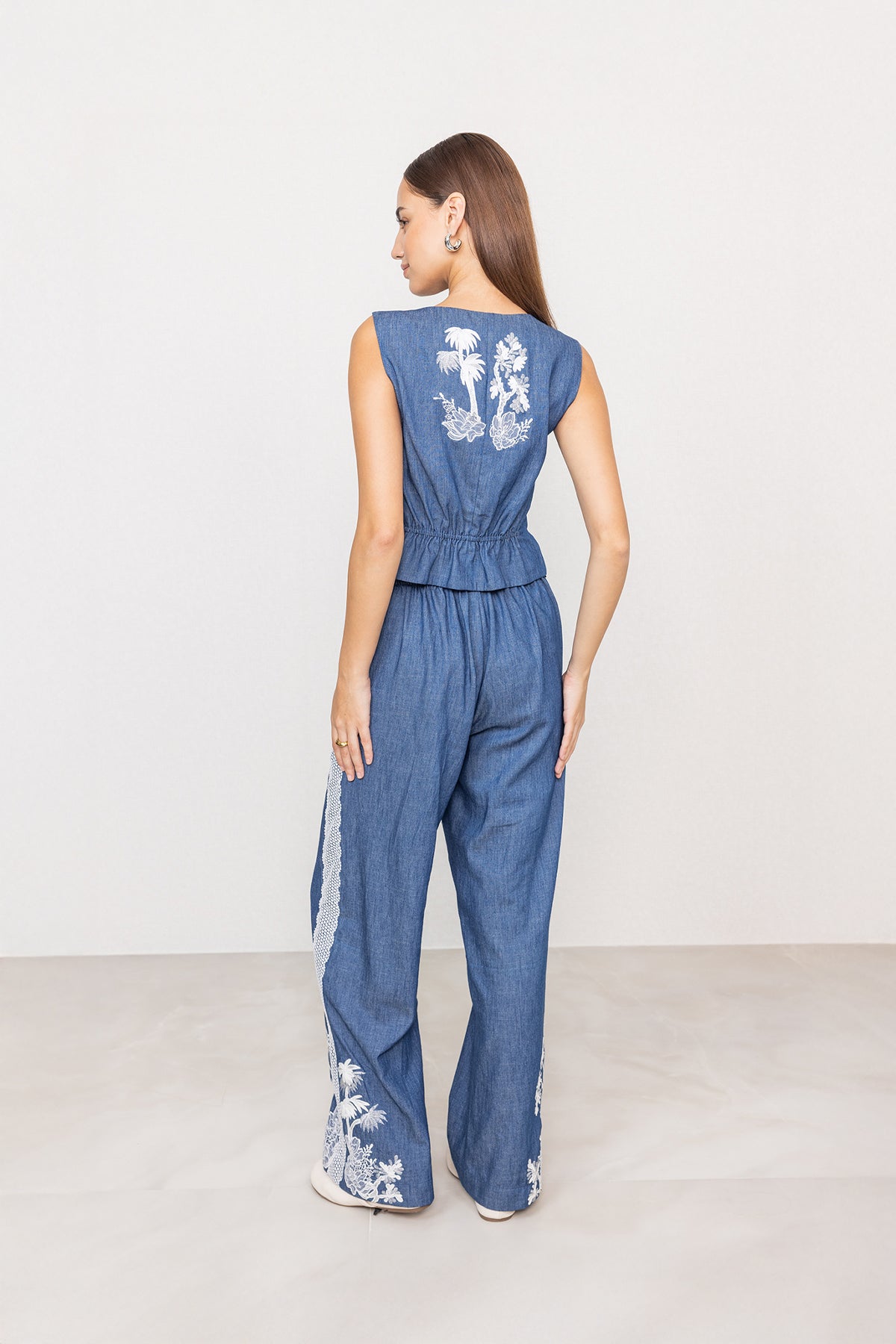 Crafted in blue denim, Ranna Gill's Kael High Waisted Pant is designed with a straight, wide-leg silhouette that sits firmly at the waist. Contrast artwork runs along the sides and lower leg, creating visual length and definition. Functional side pockets add practicality, while the clean waistband keeps the look sharp. The fit feels balanced, relaxed through the leg with a structured fall.