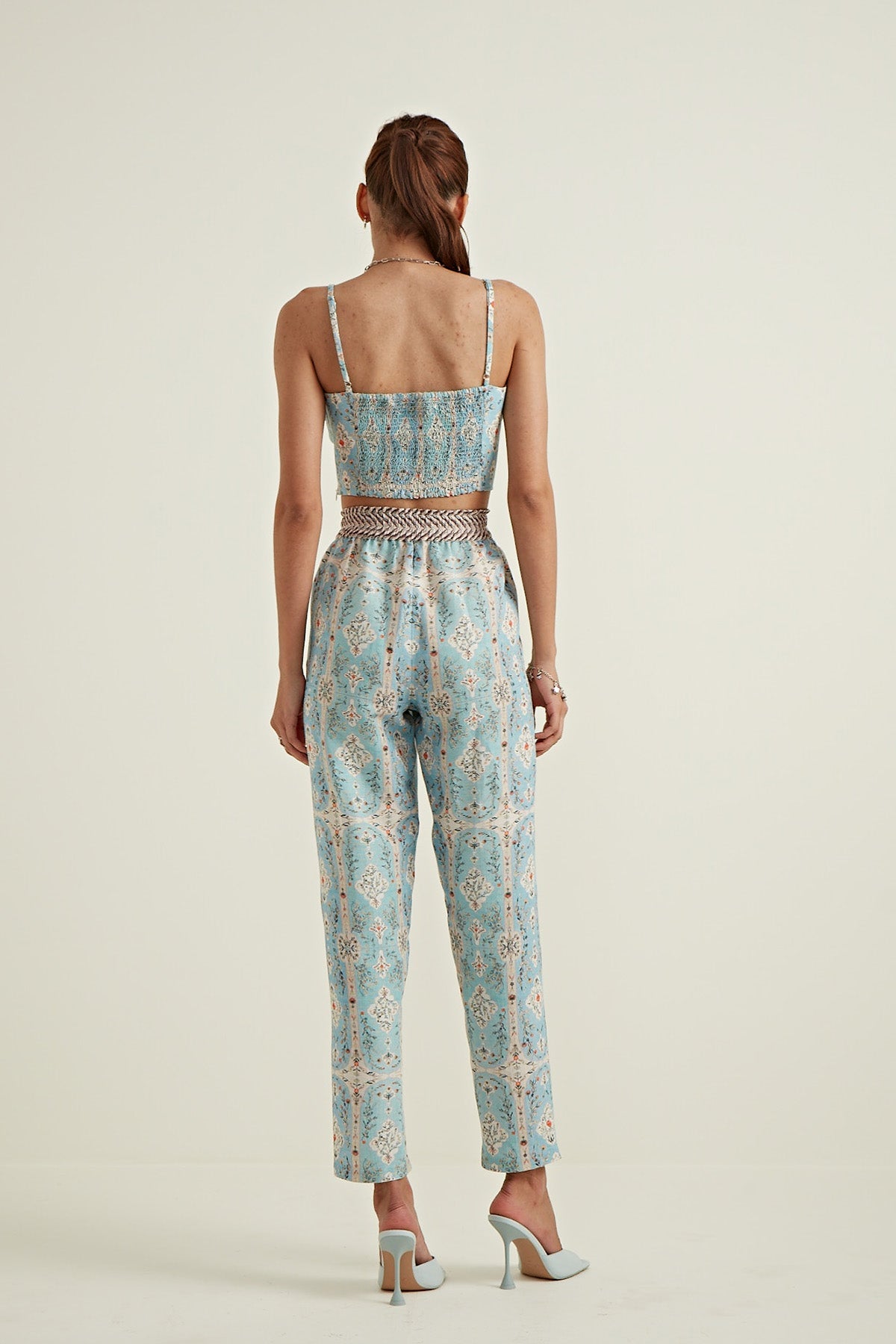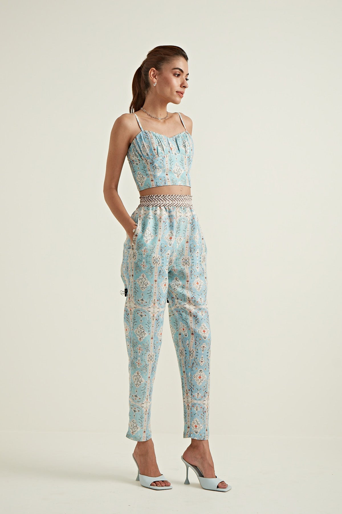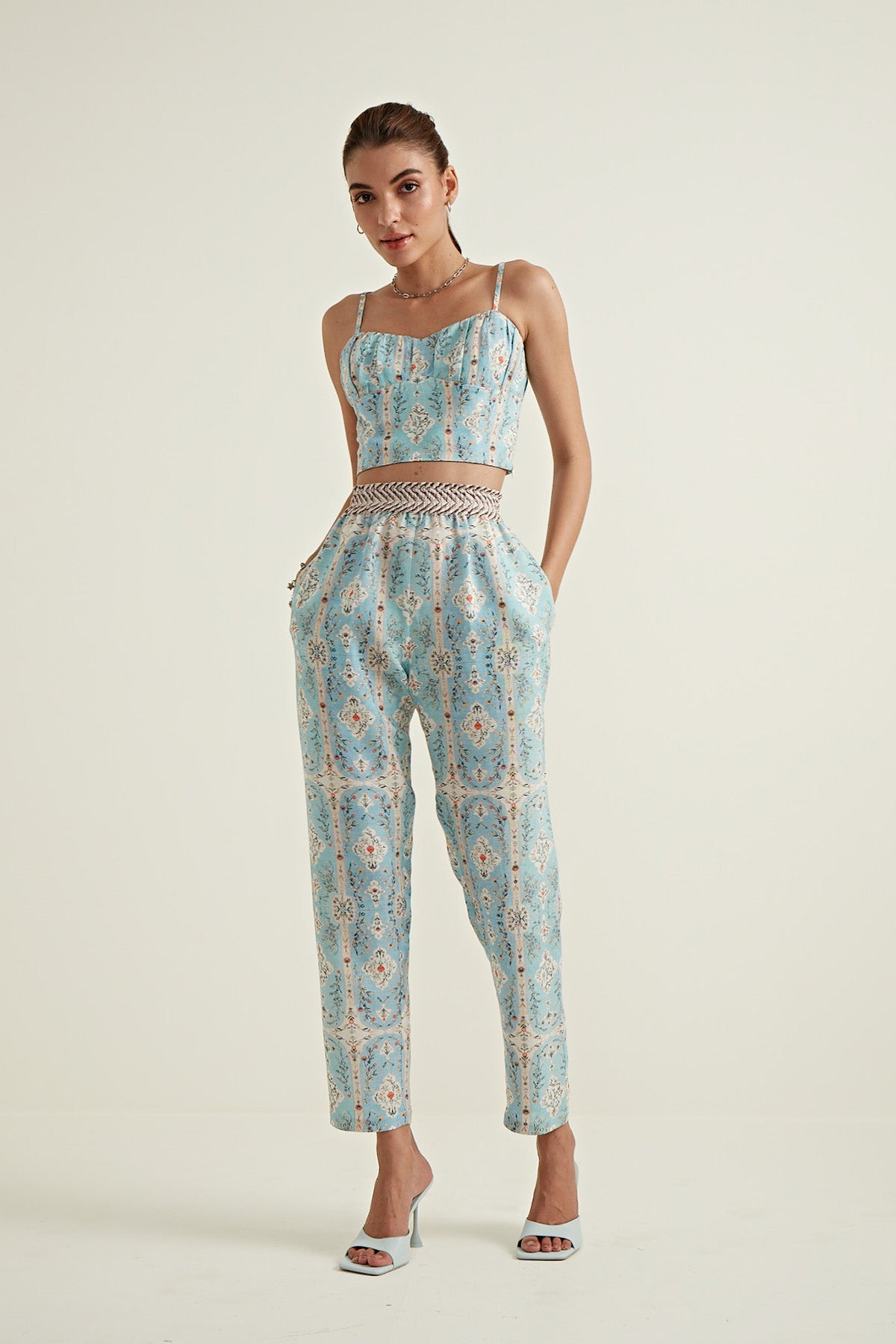 Embrace a sense of wanderlust with the Leah Bustier. Crafted from a luxurious Linen-Viscose blend, this bustier captures the essence of travel with its mesmerizing blue color. The sweetheart neckline evokes a romantic allure, adorned with a captivating Jade Mosaic print, it reflects the beauty and charm. Whether you're exploring exotic locales or strolling along sandy beaches, the Leah Bustier paired with a compfy pant or white shorts is the perfect companion for your stylish travel escapades.