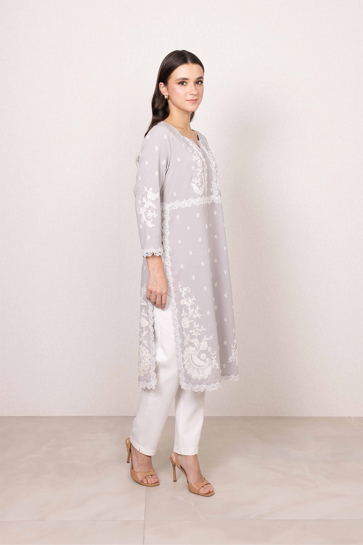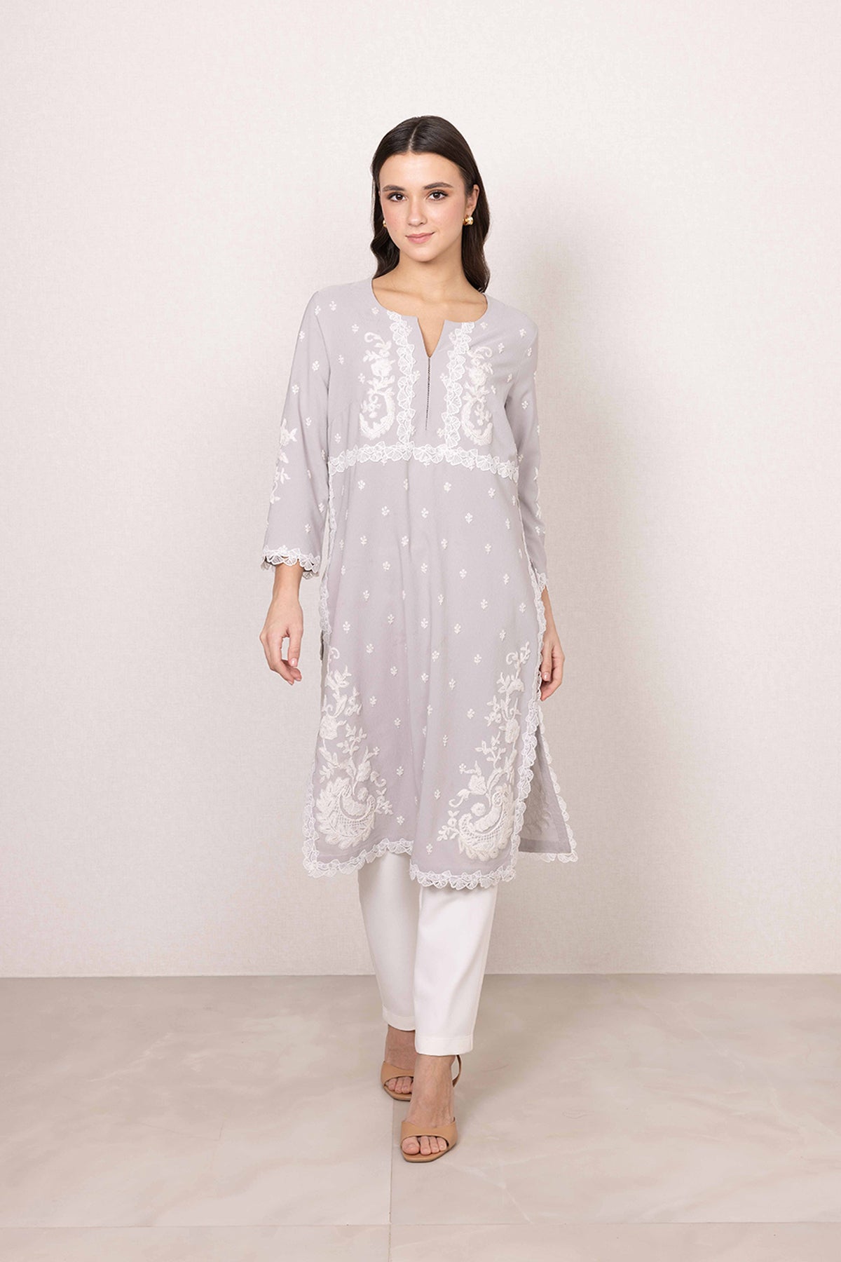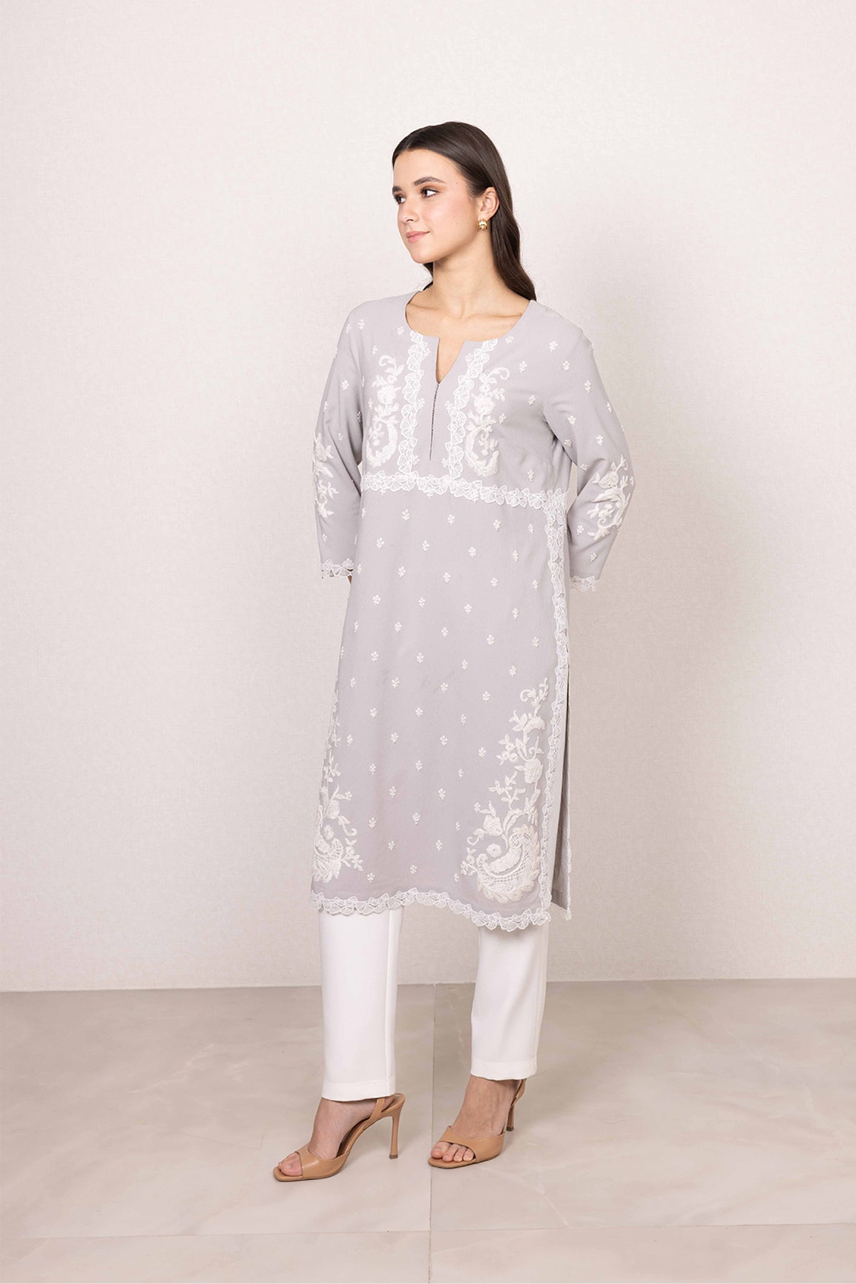 Quietly striking from the first glance, Ranna Gill's Lumen Tunic brings together subtle texture and detailed workmanship. Made in poly crinkle, the soft grey base is highlighted with intricate white embroidery running along the neckline, sleeves, and hem. The straight silhouette is finished with lace accents that add contrast without overpowering the look. A graceful piece that feels light, comfy, and beautifully considered for elevated day dressing.