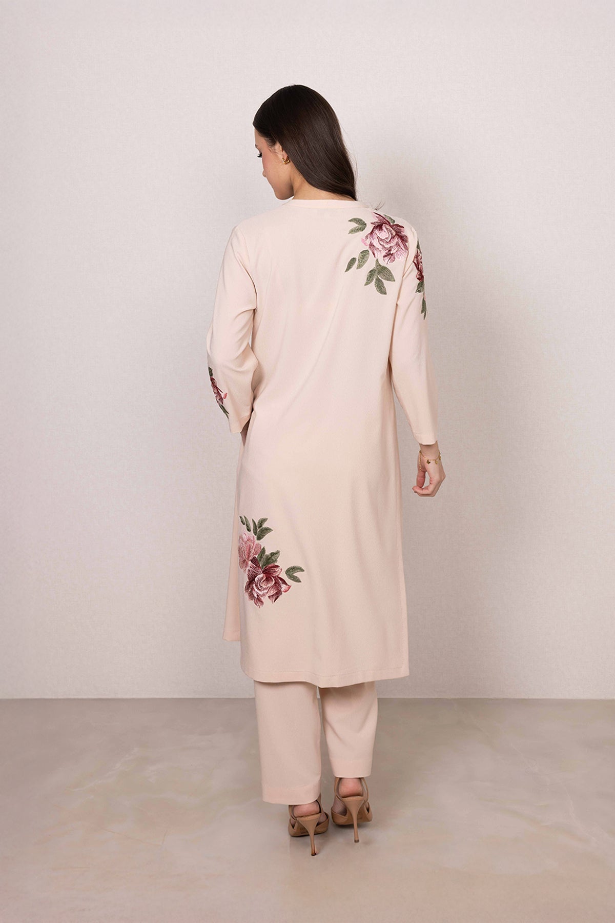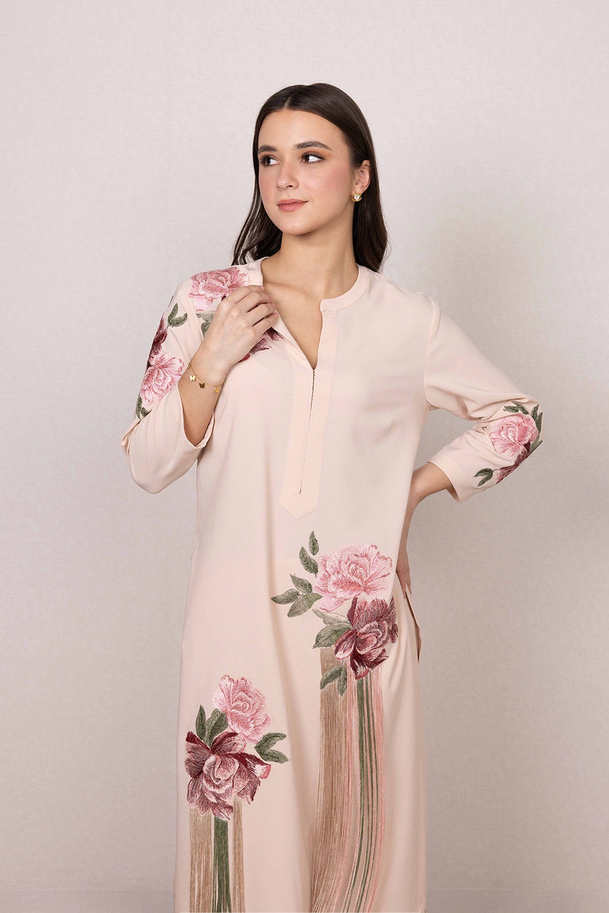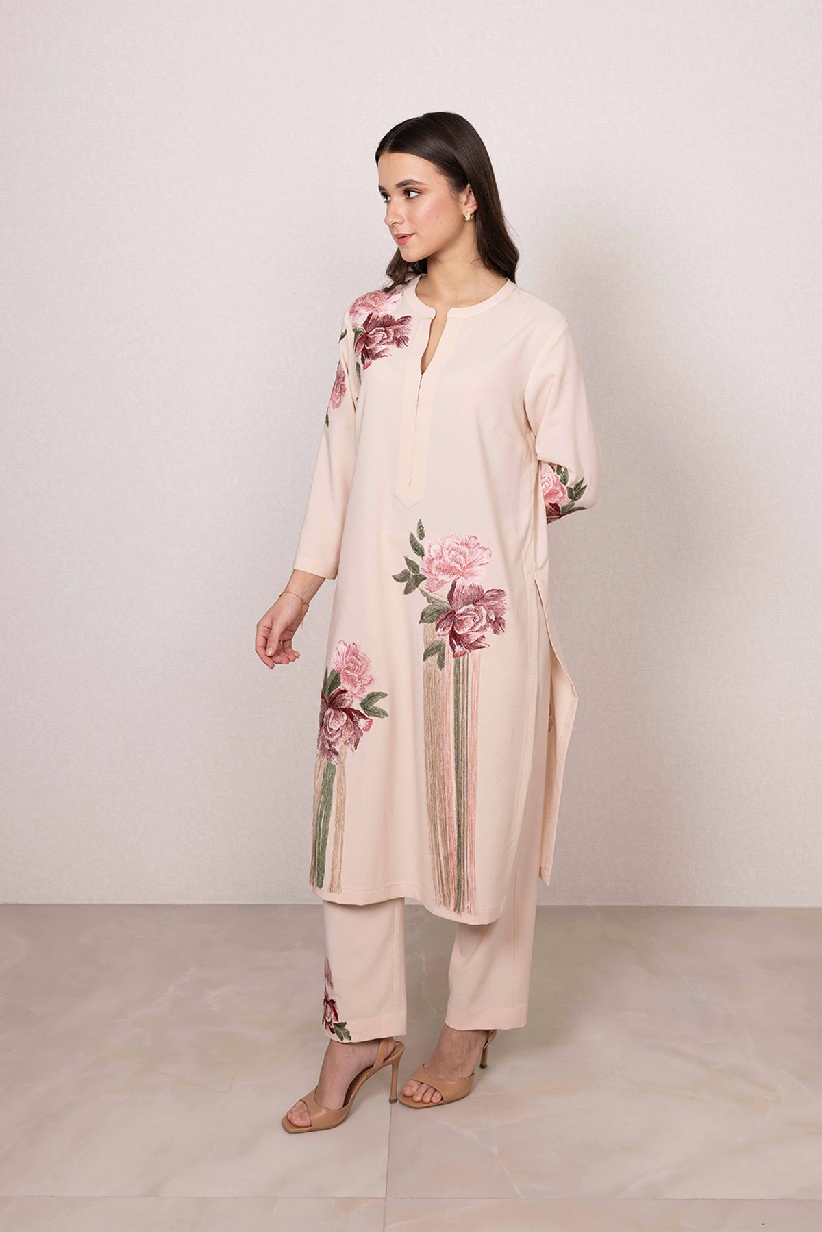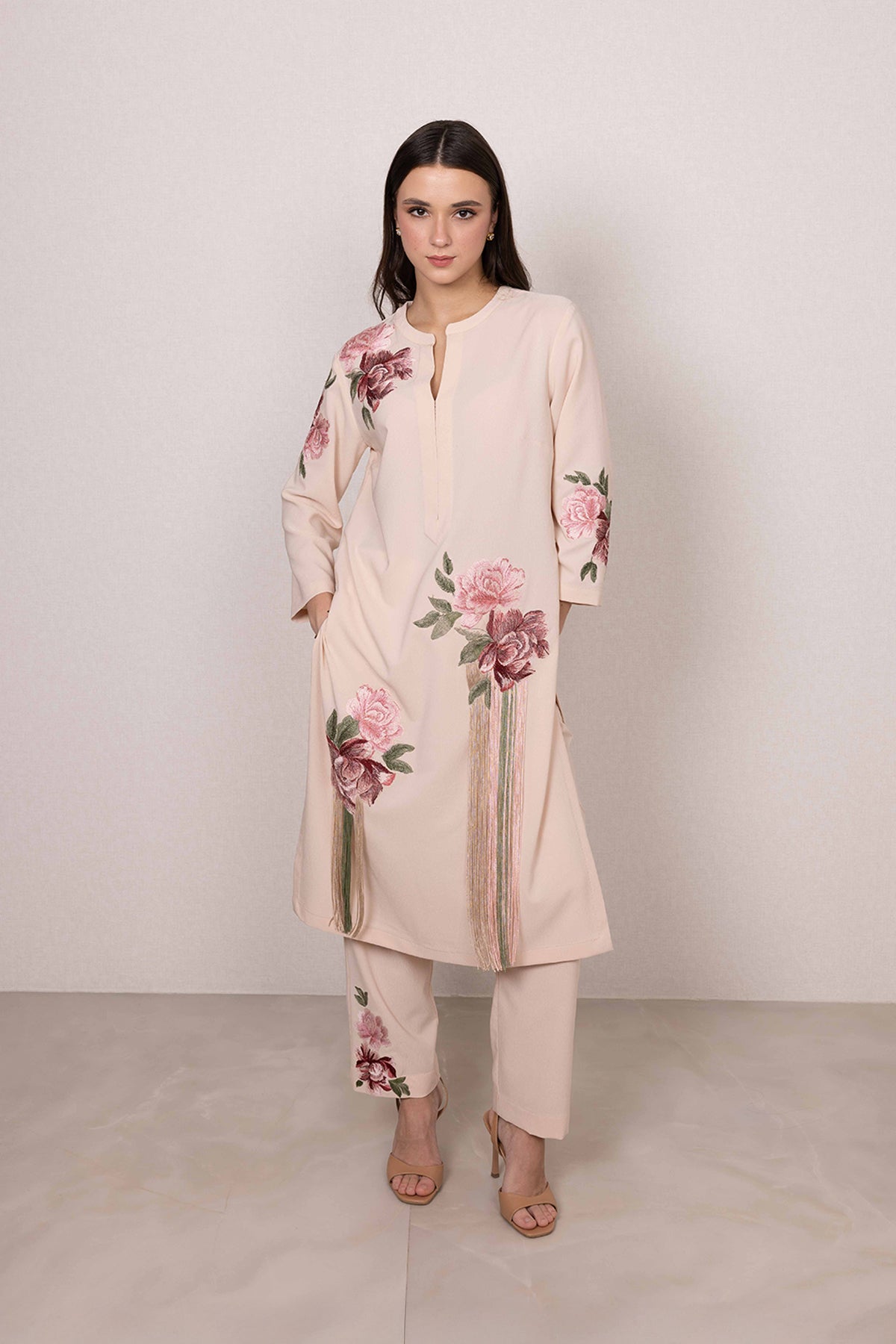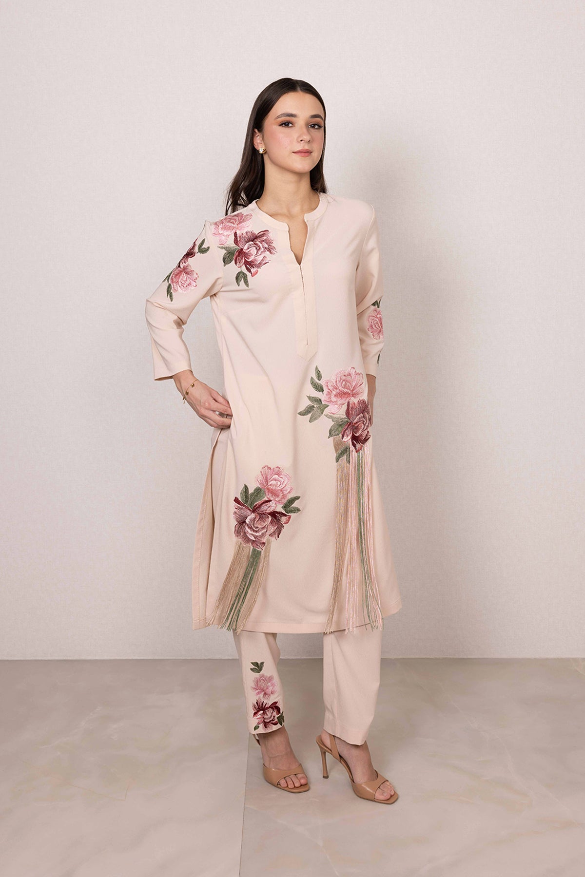 Quietly striking at first glance, Ranna Gill's Nova Tunic Set is defined by its soft blush tone and graceful floral print. Made in poly crinkle, the tunic features a clean slit neckline, balanced by printed blooms across the shoulder, sleeves, and hem. Vertical hanging accents add a gentle highlight to the front, bringing focus without overpowering the look.