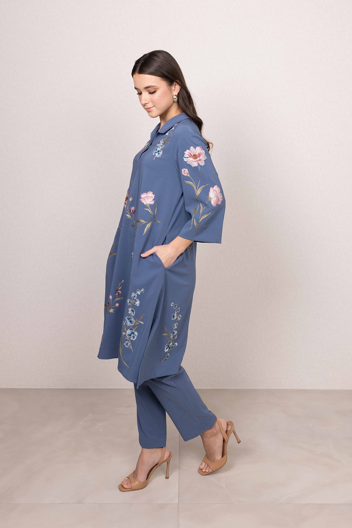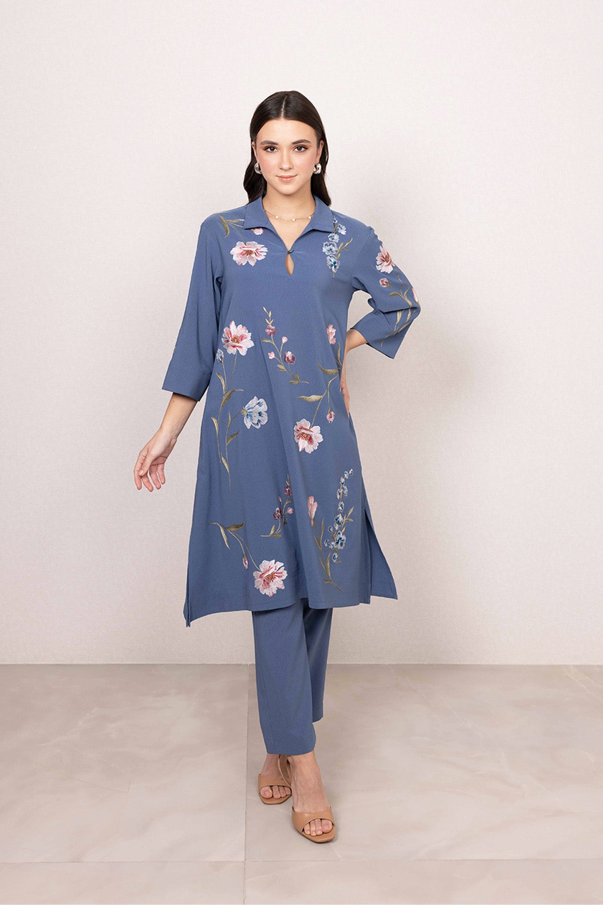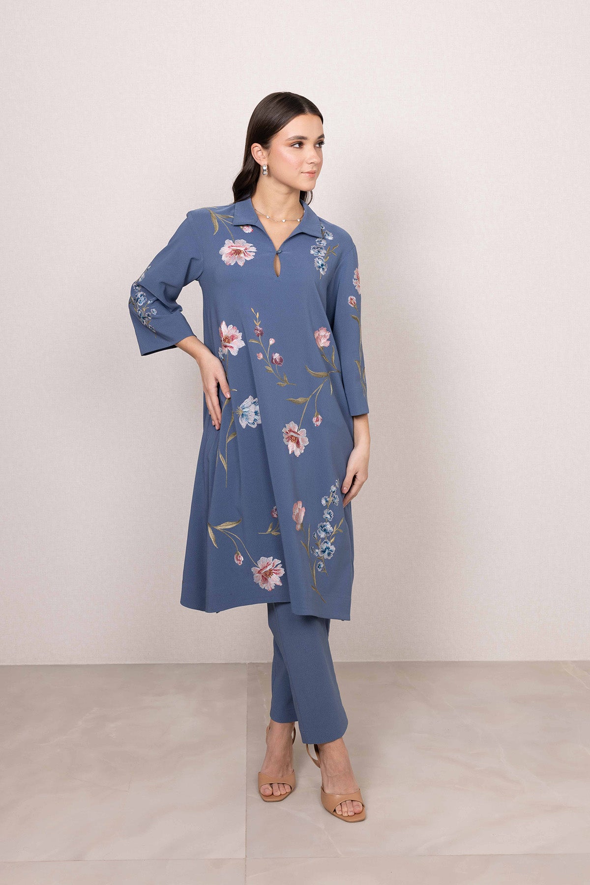 Novi Tunic in a serene blue color brings a calm, elevated feel to everyday dressing. Made in lightweight Poly Crincle, it features scattered floral motifs with soft stems that add gentle interest across the surface. The collared neckline with a V placket and three-quarter sleeves give it a clean, modern shape, while the fabric adds comfort to the silhouette. An easy knee-length style that feels light on the skin and looks quietly premium.