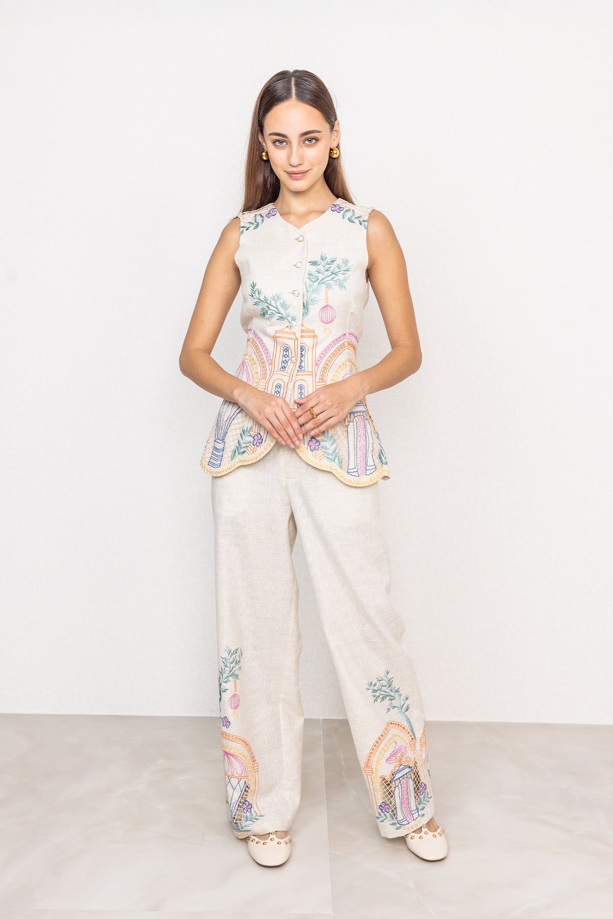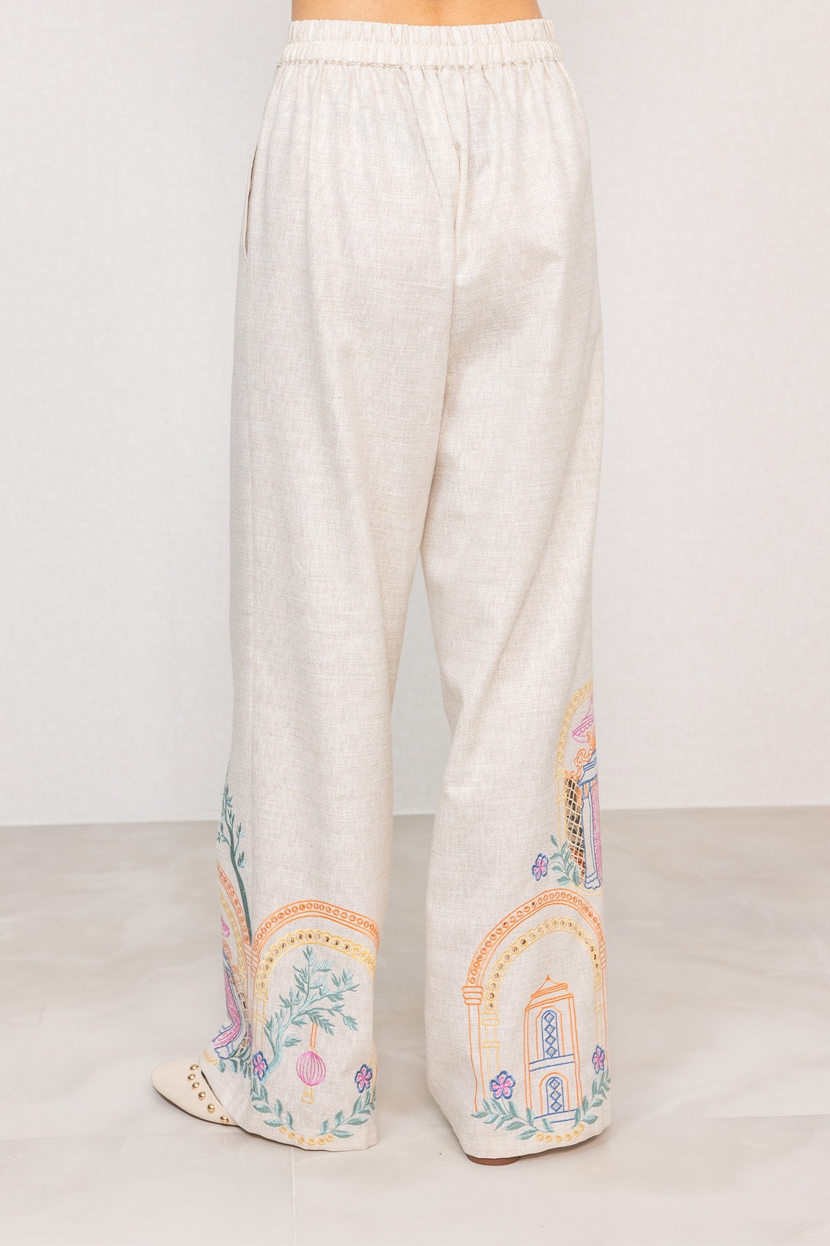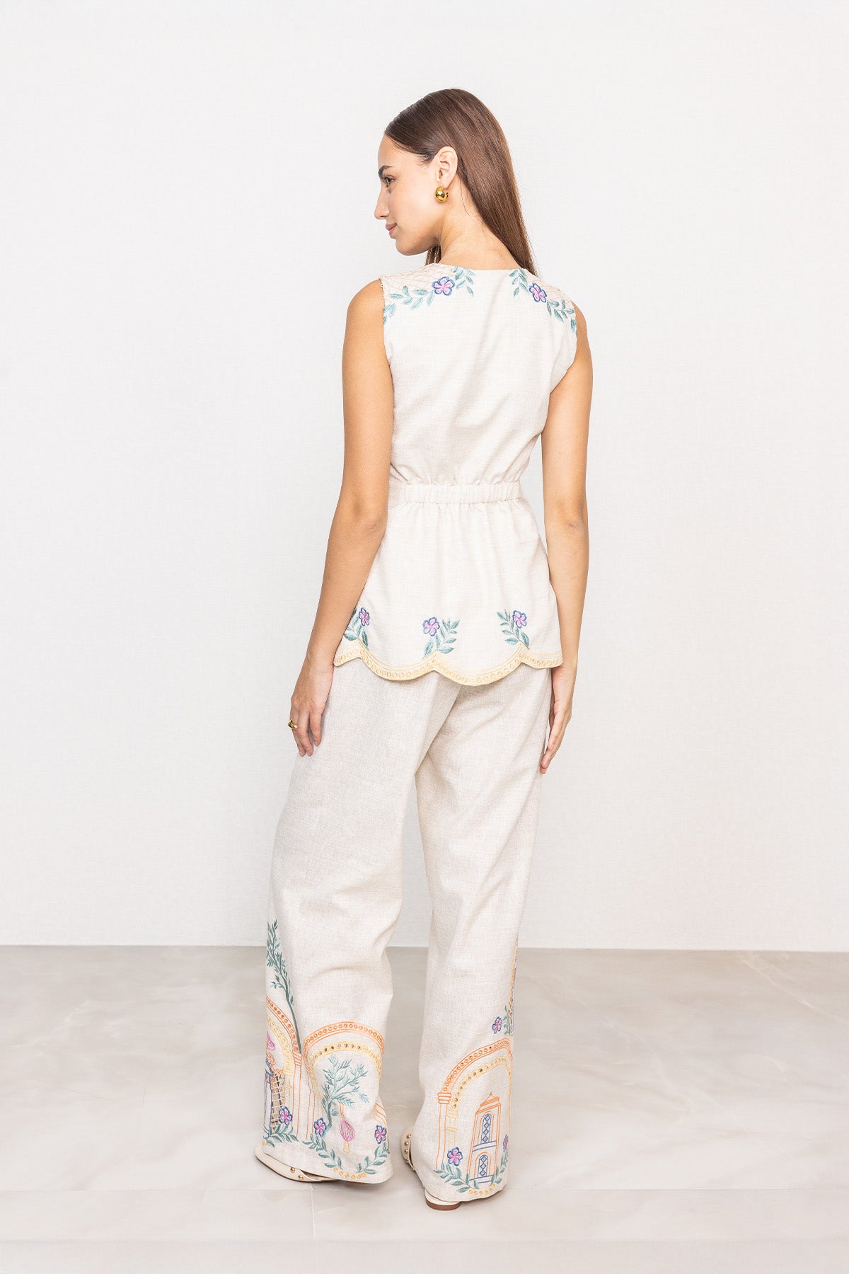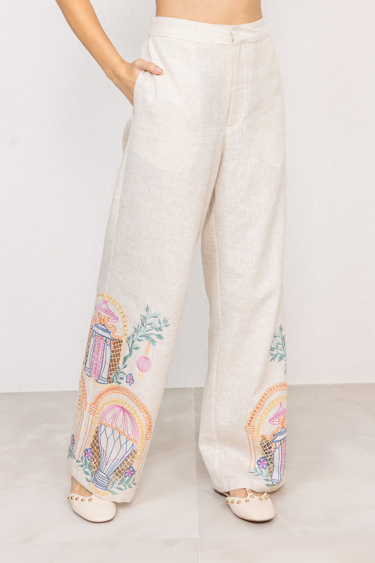 A clean, elongated silhouette defines Ranna Gill's Ori High Waisted Pant, tailored in linen with an oatmeal base that keeps the look crisp and structured. The high-rise waistband sits flat at the front with a zip closure, while side pockets add functional detail without disturbing the straight fall of the legs. Embroidered Eyelet artwork is placed along the lower panels, featuring architectural arches, foliage motifs, and fine cutwork accents worked directly onto the fabric. The wide-leg shape falls fluidly to the ankle, giving the pant a balanced, composed look when worn. Pair it with Ranna Gill’s Avi Sleeveless Waist Coat for a coordinated outfit.