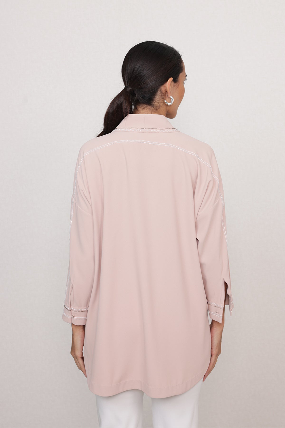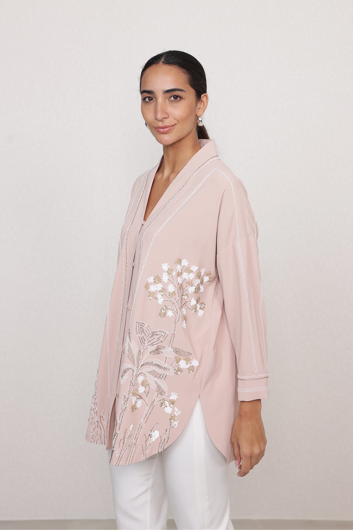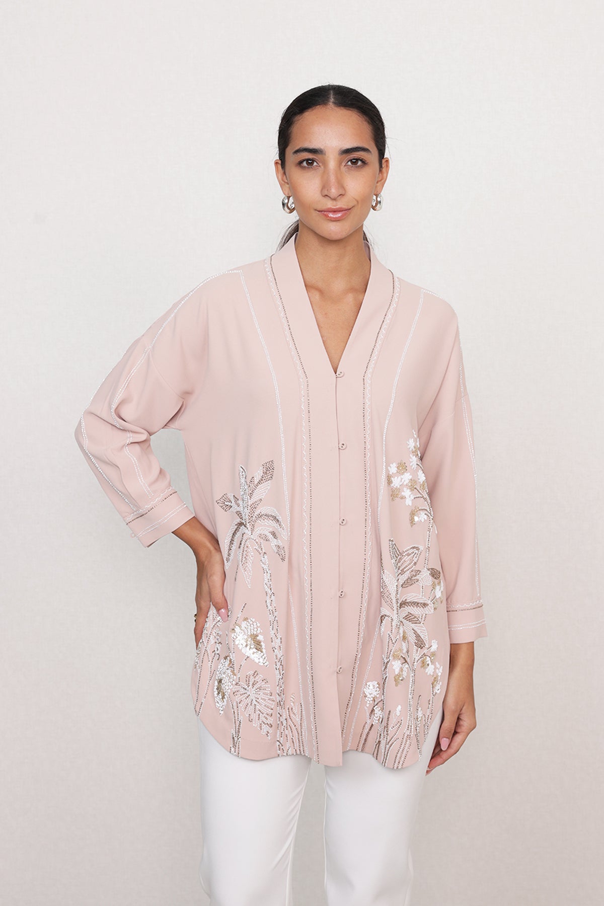 A soft glow for everyday dressing, Ranna Gill's Theo Blouse brings subtle shine with gentle detailing. Made in China georgette, this blush pink blouse features fine linear embroidery with tropical and floral motifs highlighted in sequins across the front. The open collar, button-down front, and three-quarter sleeves keep the look light and graceful. Perfect for day events, lunches, and evening plans.