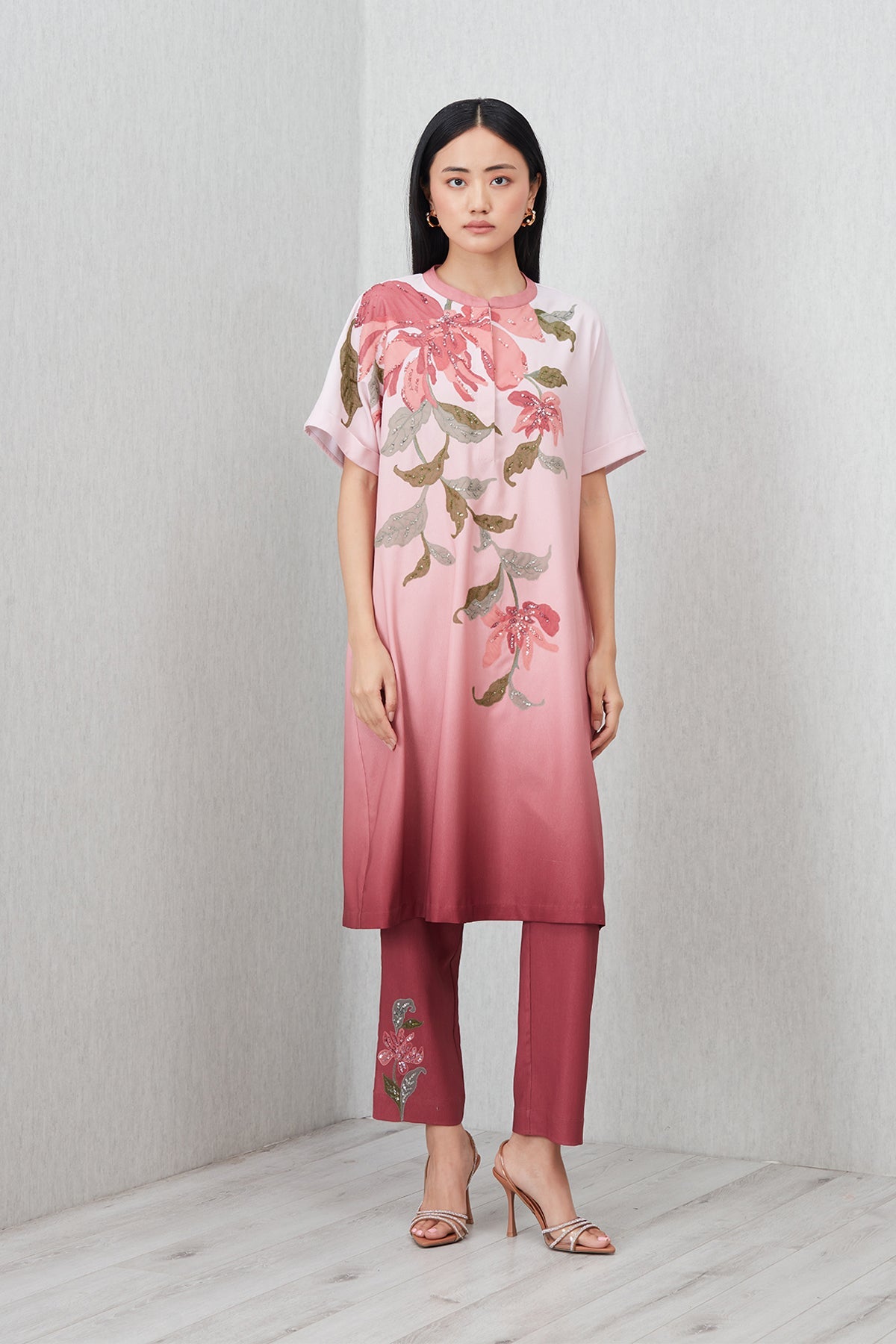 The Velda Tunic Set comes in a ombre pink, creating a subtle ombré finish. Made in lightweight China Crinkle, the set is detailed with oversized floral appliqué and beadwork that climbs from shoulder to hem. The matching pants has the same motif at the cuff for a cohesive finish. The silhouette is easy with short sleeves and clean lines. A look that works best for family gatherings and house parties.