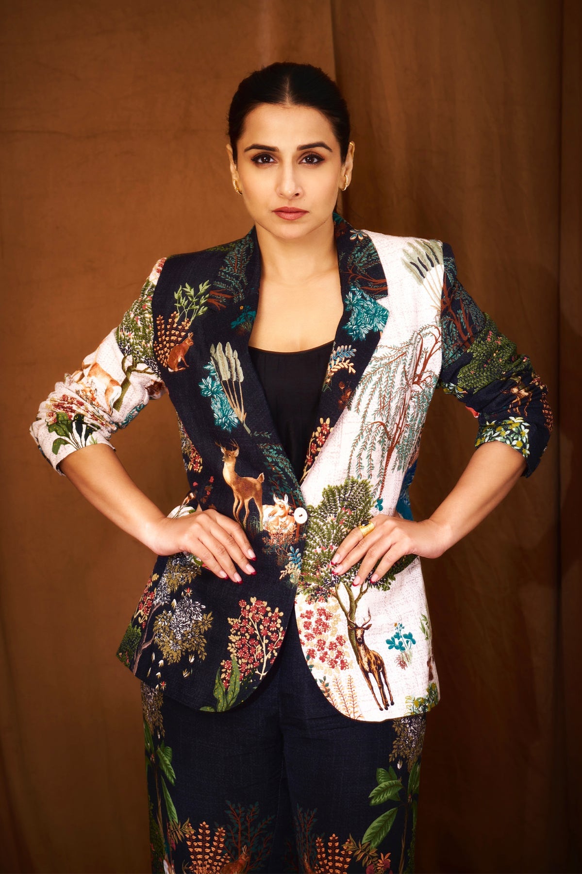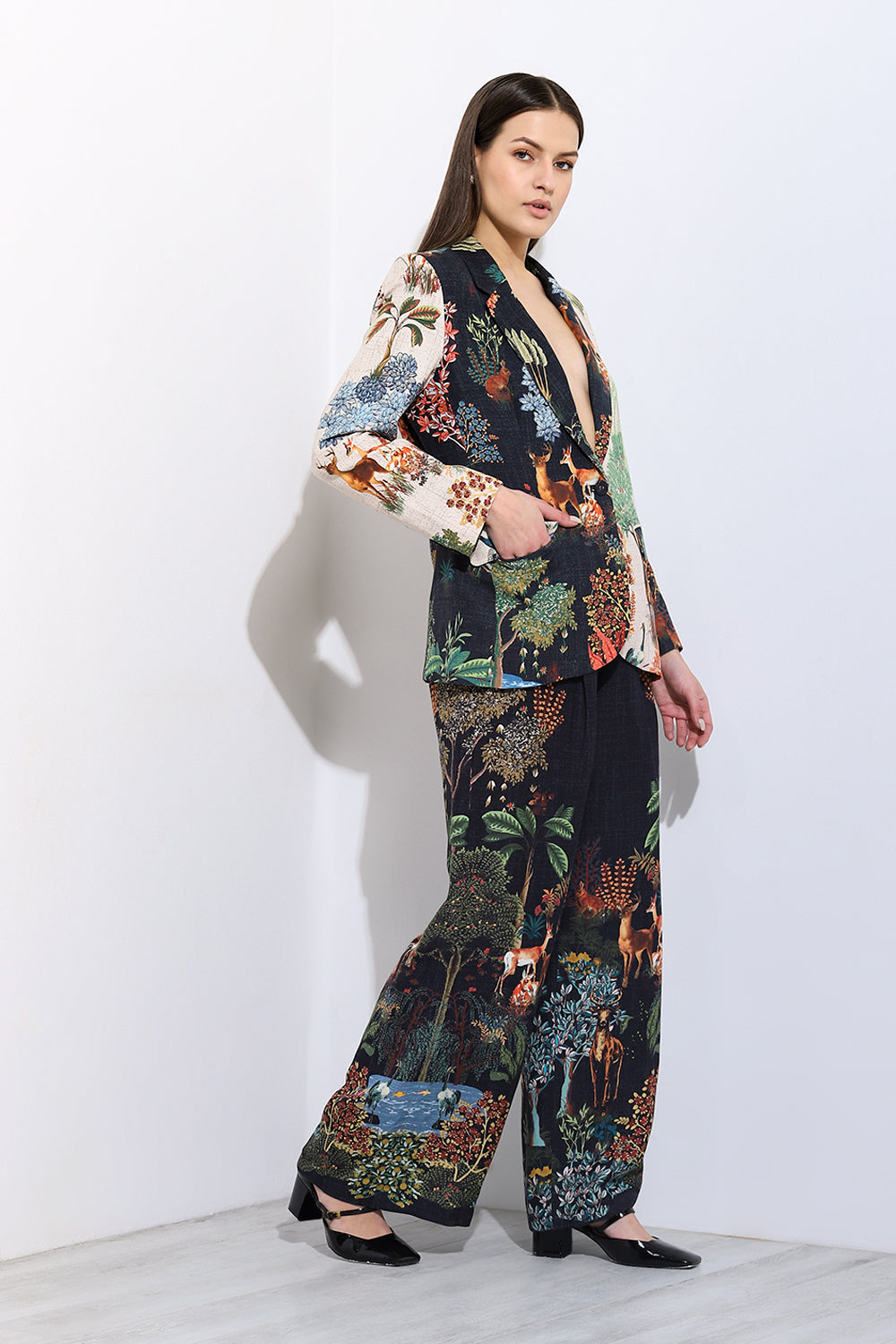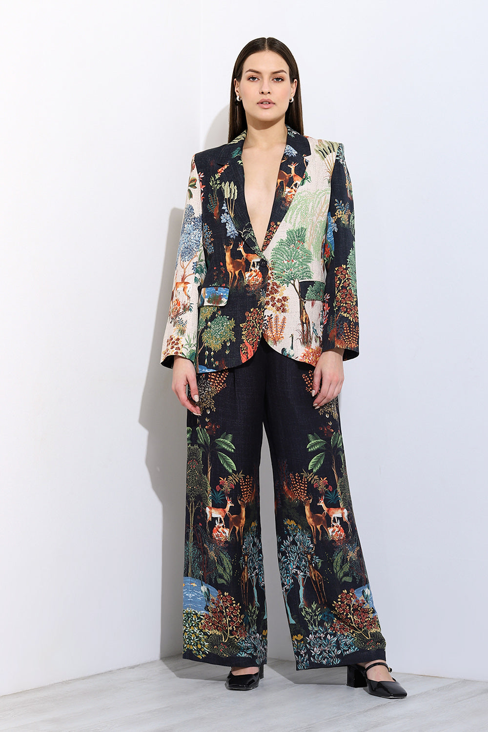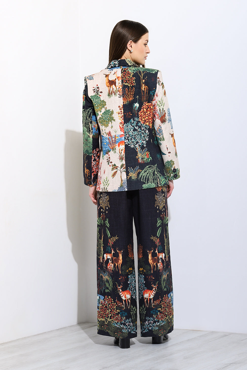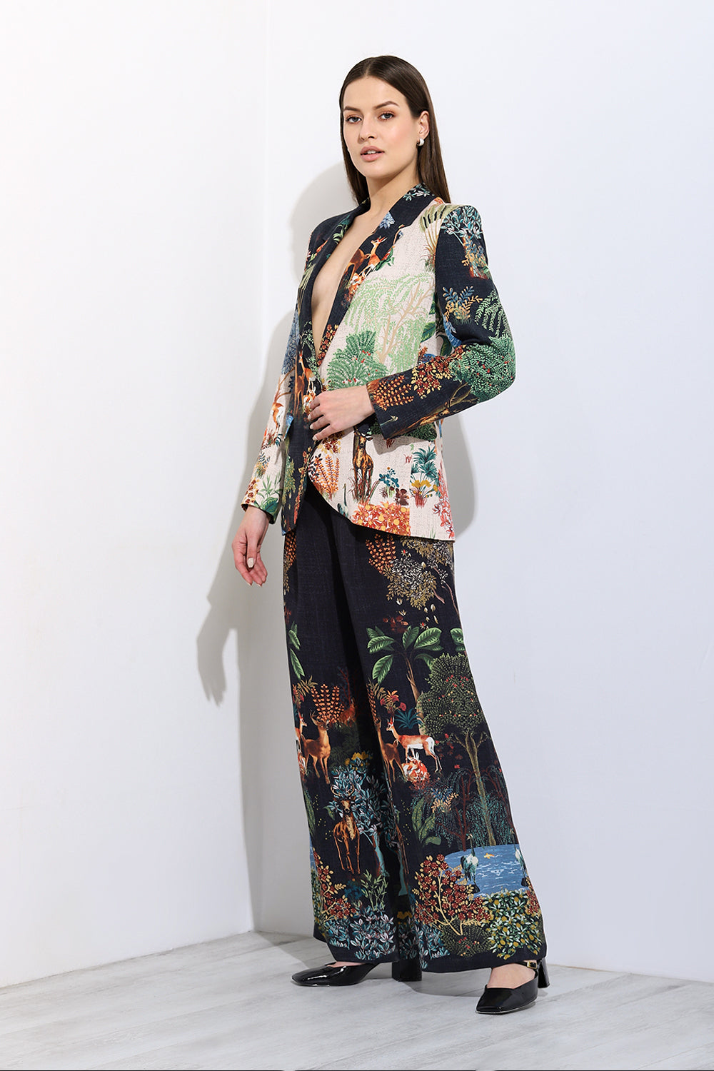 Introducing the Melody Color Block Jacket & Pants, a statement piece infused with the distinctive charm of Ranna Gill's signature Amazon print. Elevate your style with this eye-catching jacket featuring a unique fusion of colors. The Notched Lapel Collar adds a touch of sophistication, framing your look with tailored elegance.