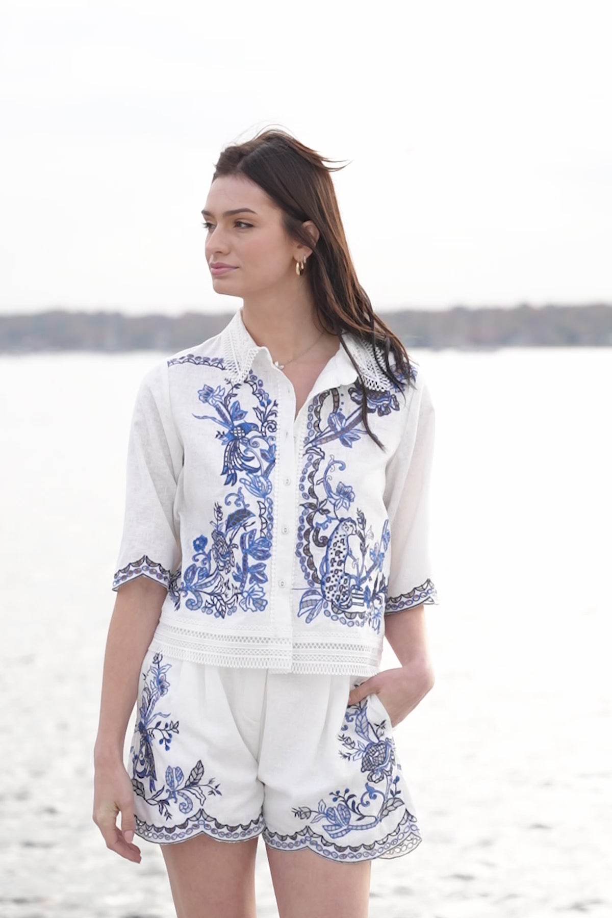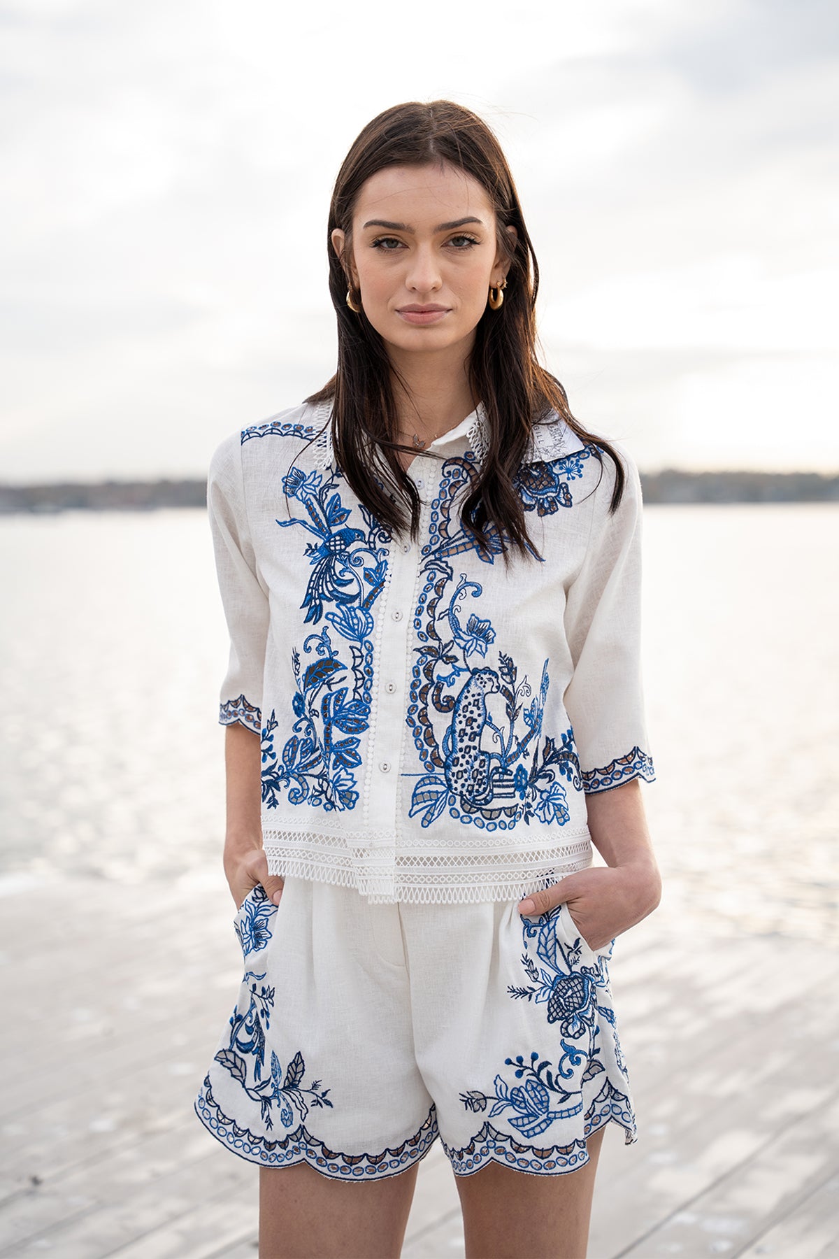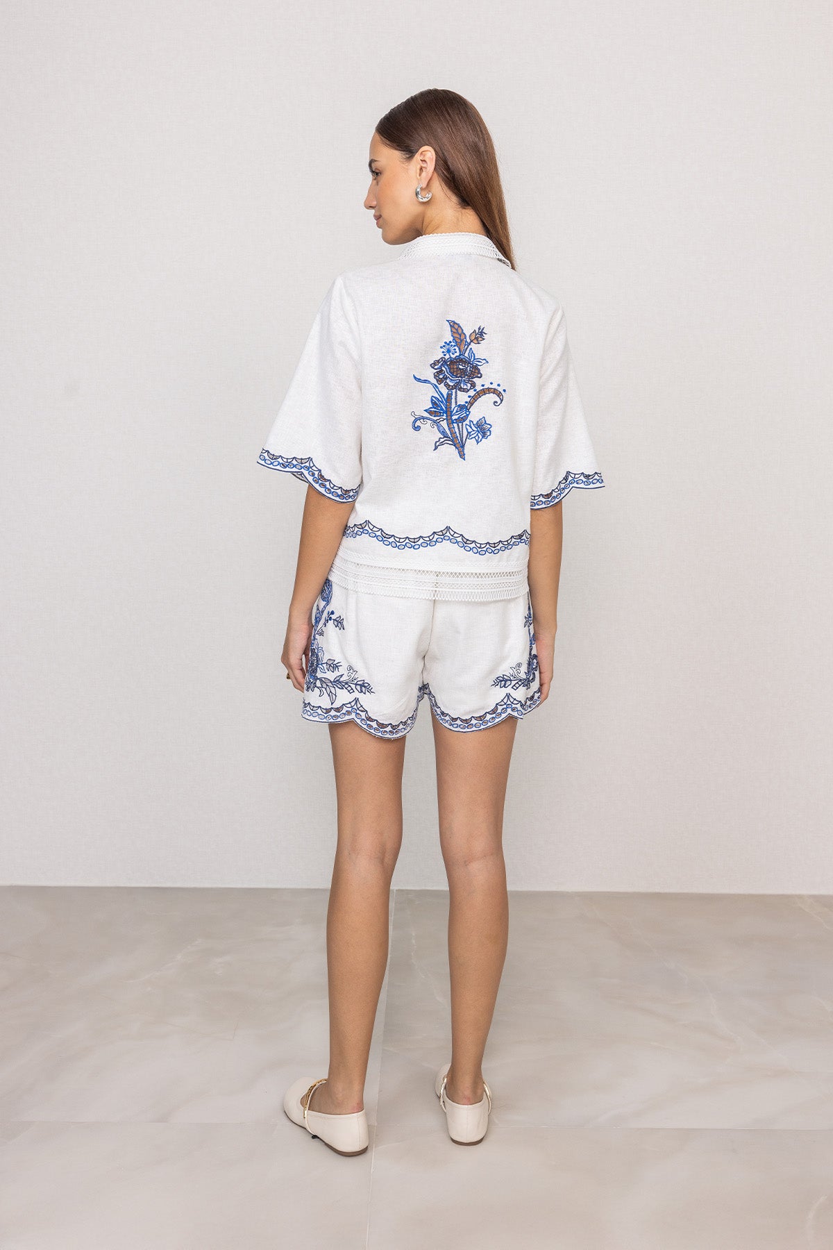 Light and crisp in white Poly Flex, Ranna Gill's Zander Cropped Shirt draws attention with schiffli artwork placed across the front and sleeves in fine blue detailing. Designed with a soft collar neckline, front button closure, and relaxed sleeves, the fit sits neatly at the waist without feeling tight. The embroidery adds character while keeping the shirt breathable and wearable through warm days. Pair it with Ranna Gill's Perca Pleated Shorts for a complete look.